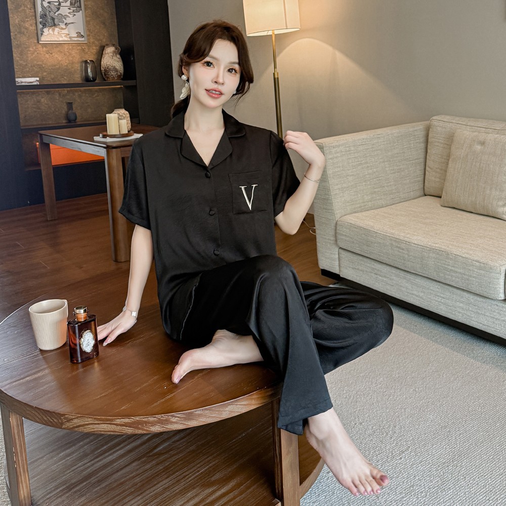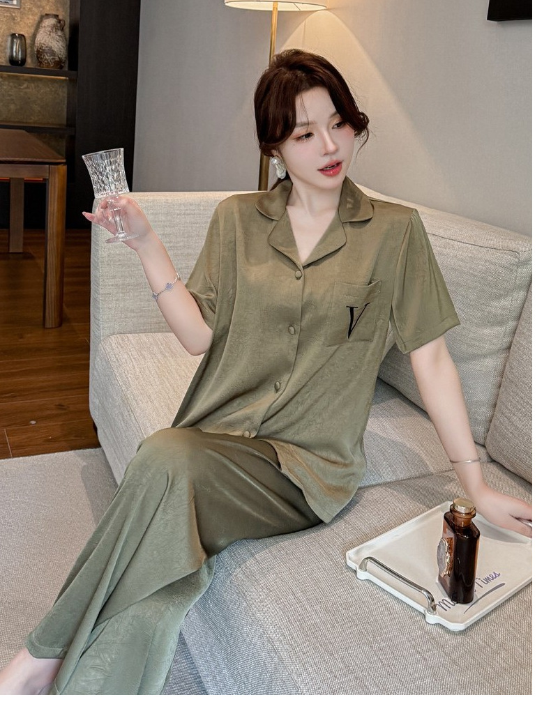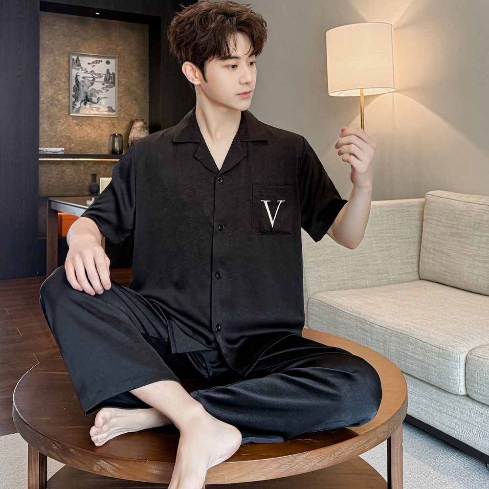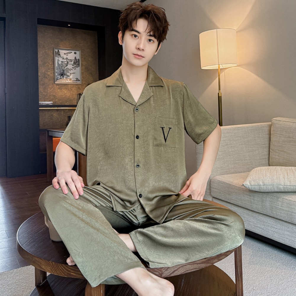 커플 잠옷 2025 봄과 가을 남자의 새로운 얼음 실크 짧은 소매 바지 세트 얇은 여성 홈 웨어 도매스토어 가기