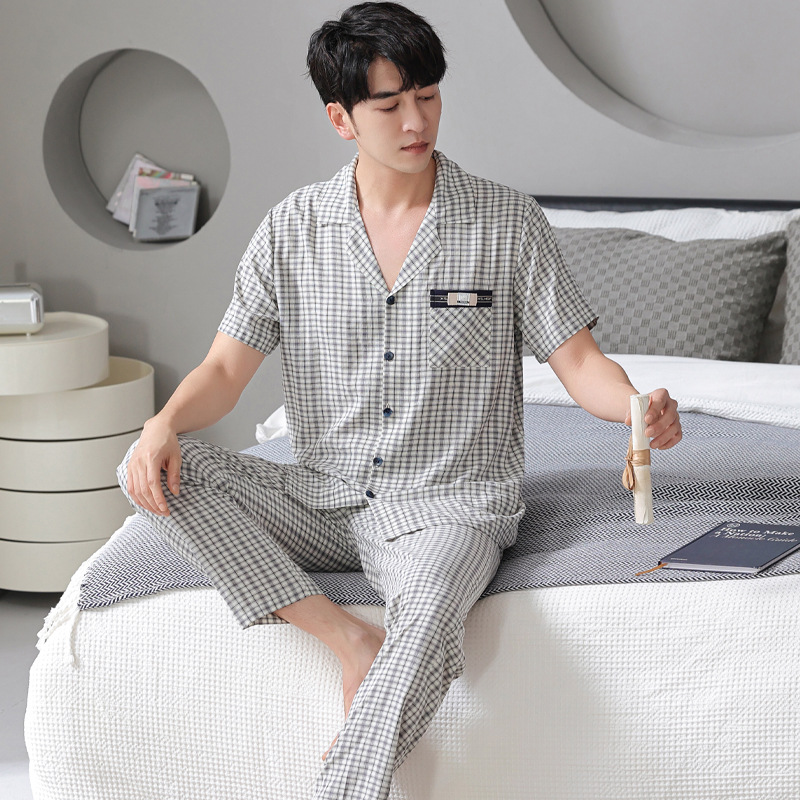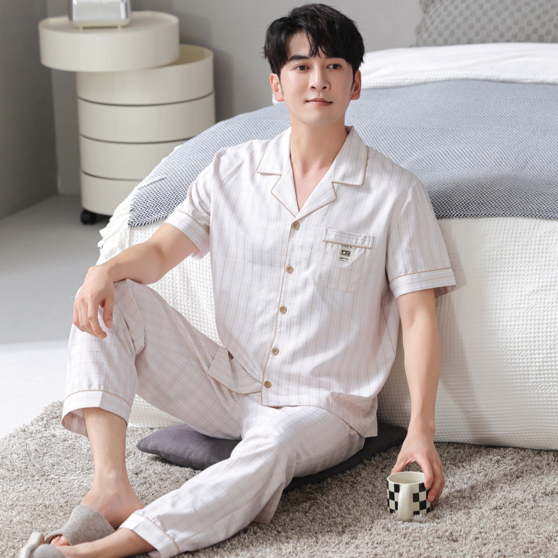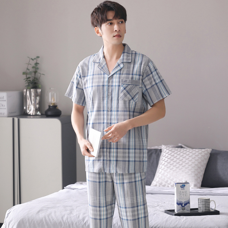 순수 코튼 잠옷 남성 여름 반팔 바지 캐주얼 카디건 얇은 순수 코튼 짠 청소년 코튼 홈웨어스토어 가기