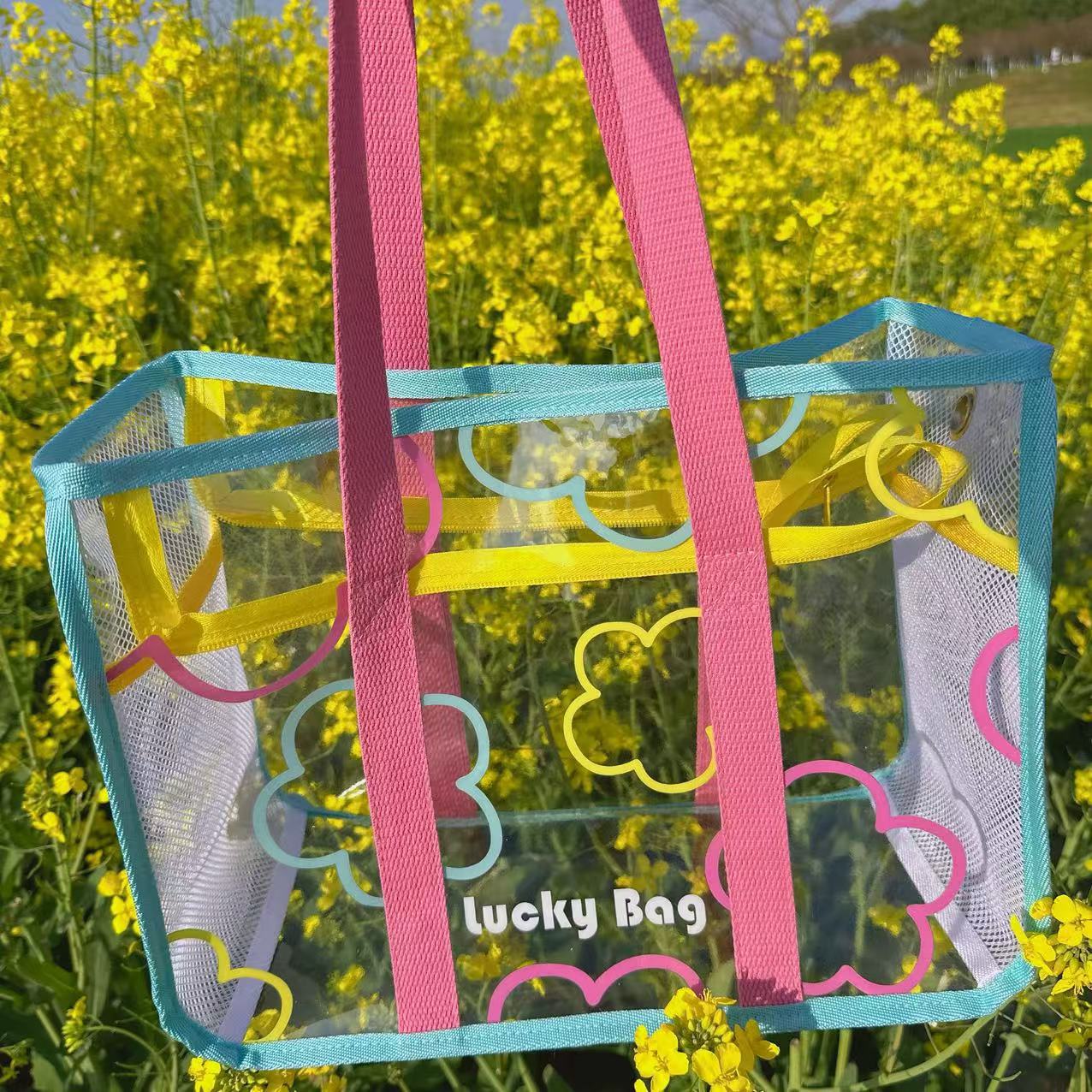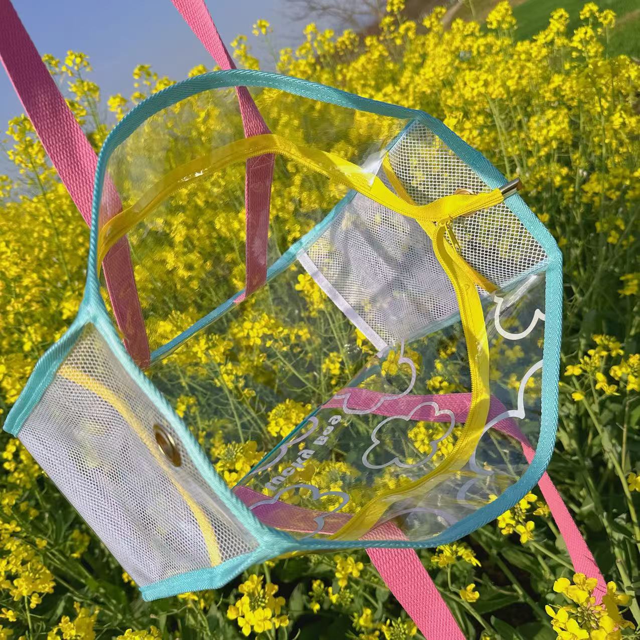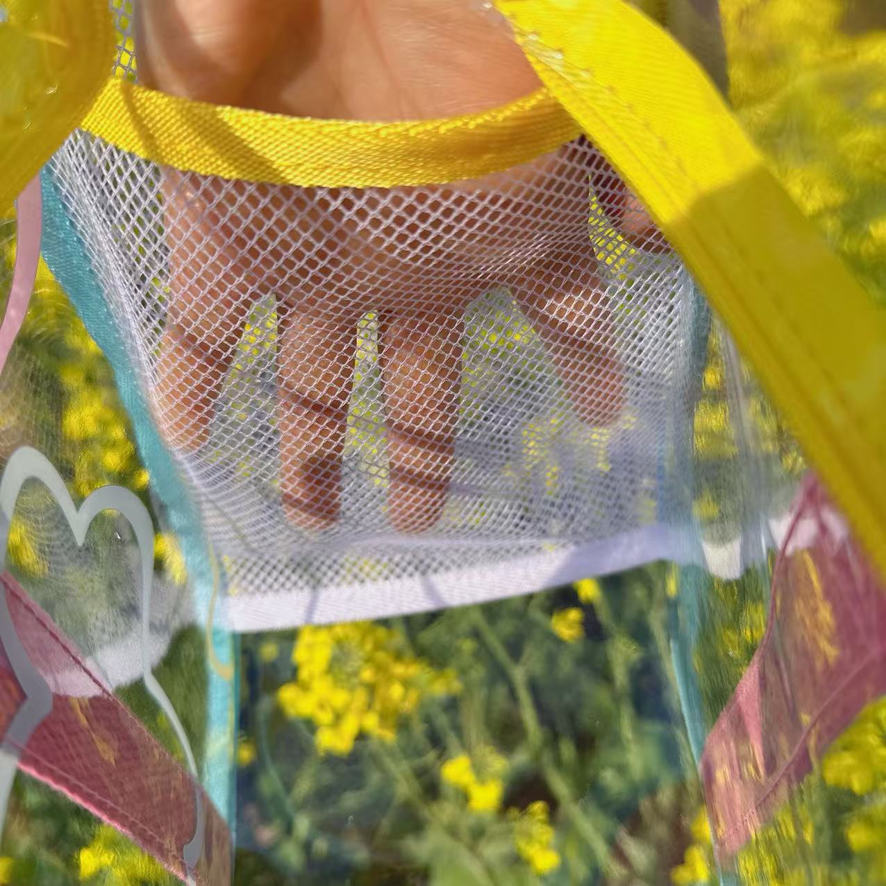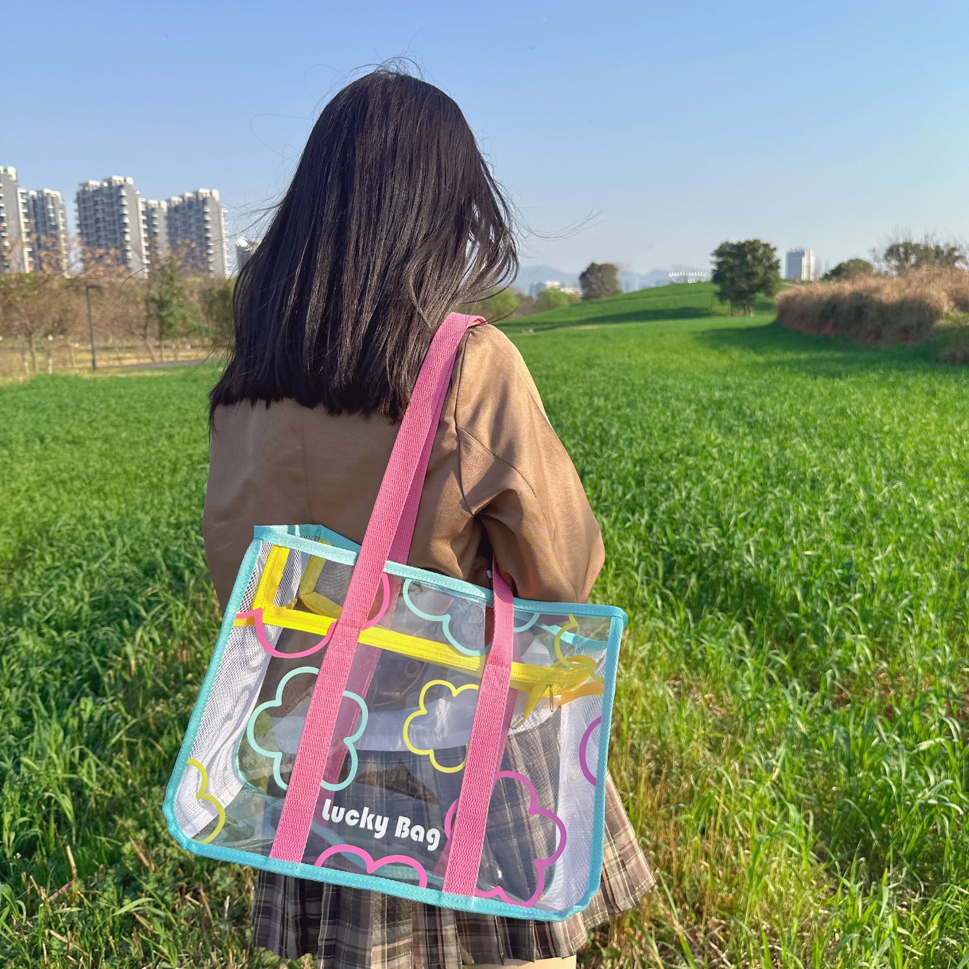 独家图案设计,时尚拼色,加厚防水PVC材质,亲肤棉质双手提,透明材质方便拿取。