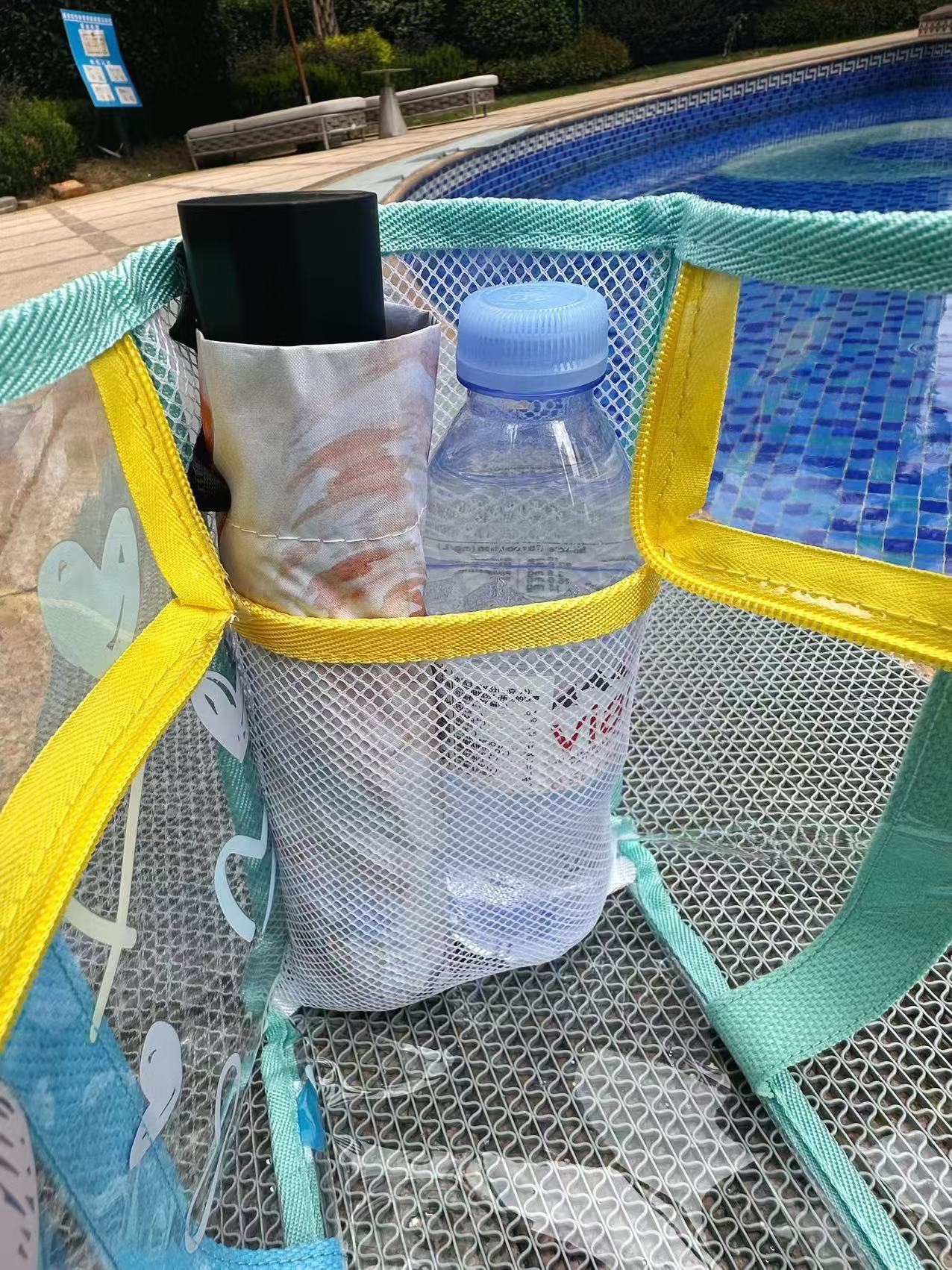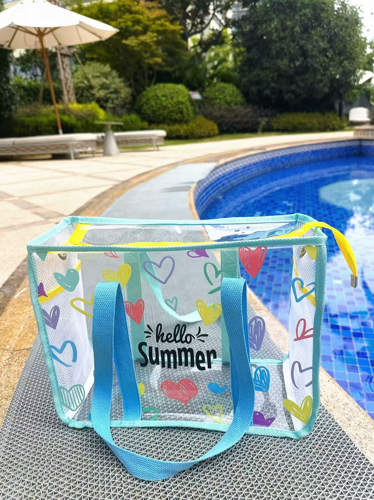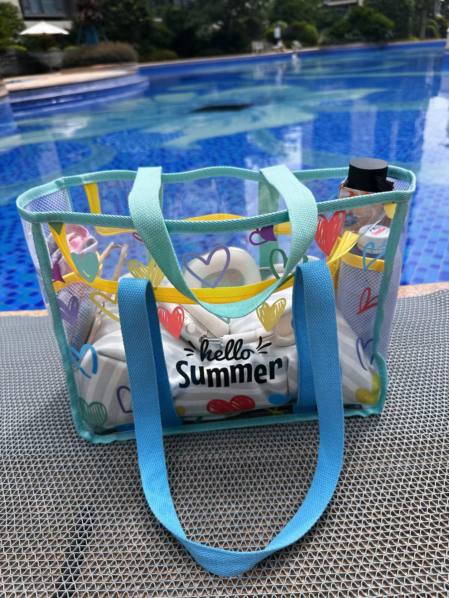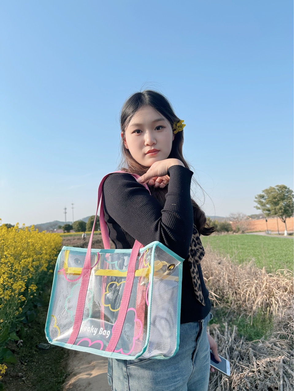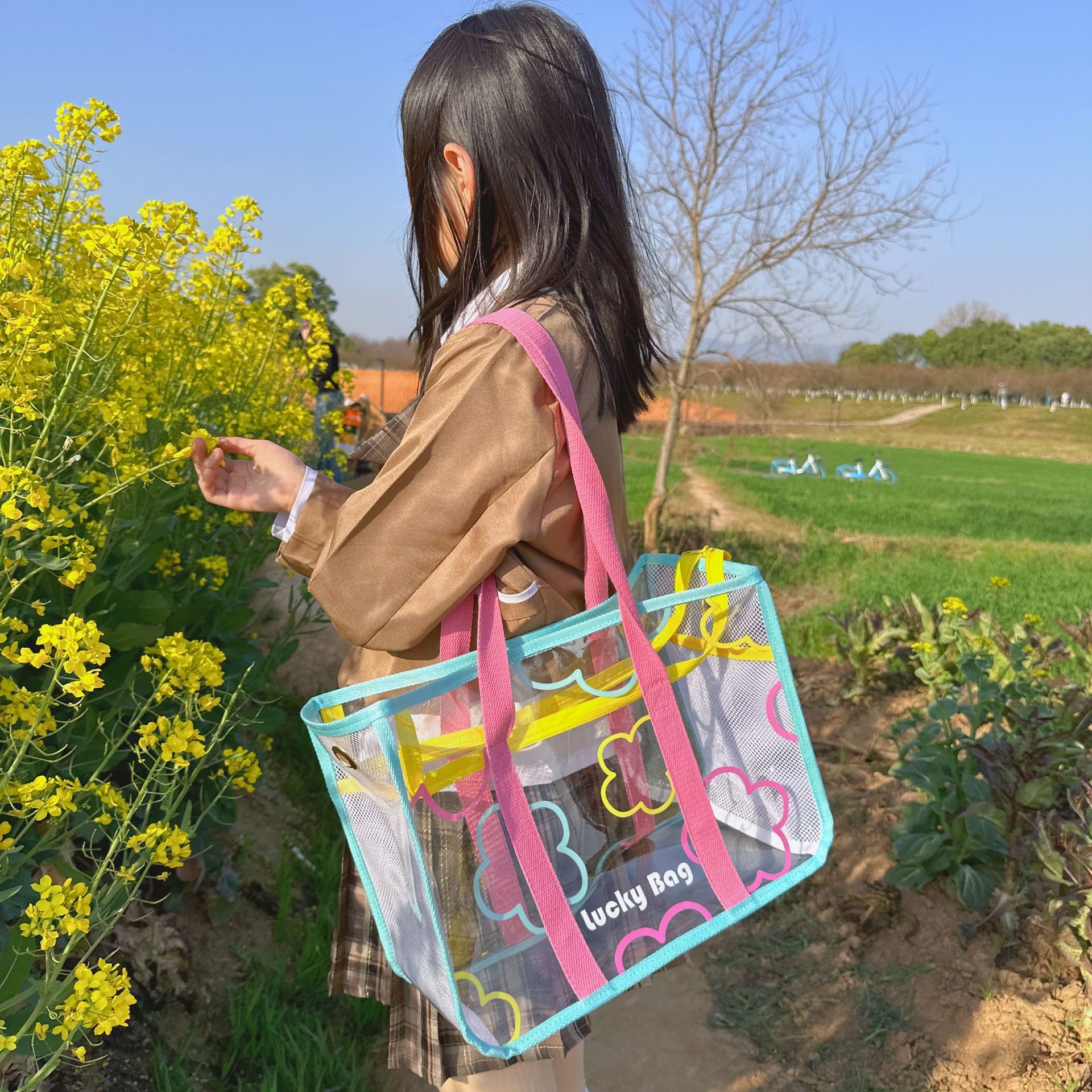 独家图案设计,时尚拼色,加厚防水PVC材质,亲肤棉质双手提,透明材质方便拿取。