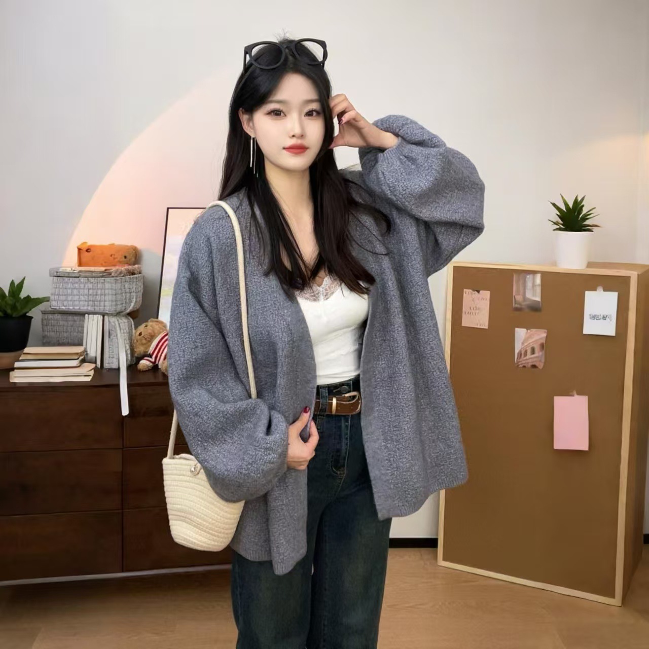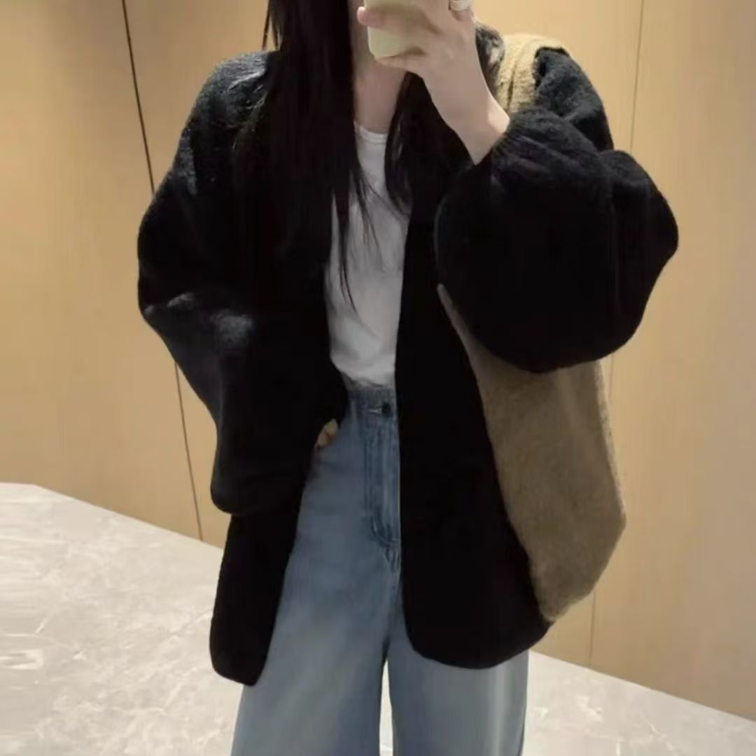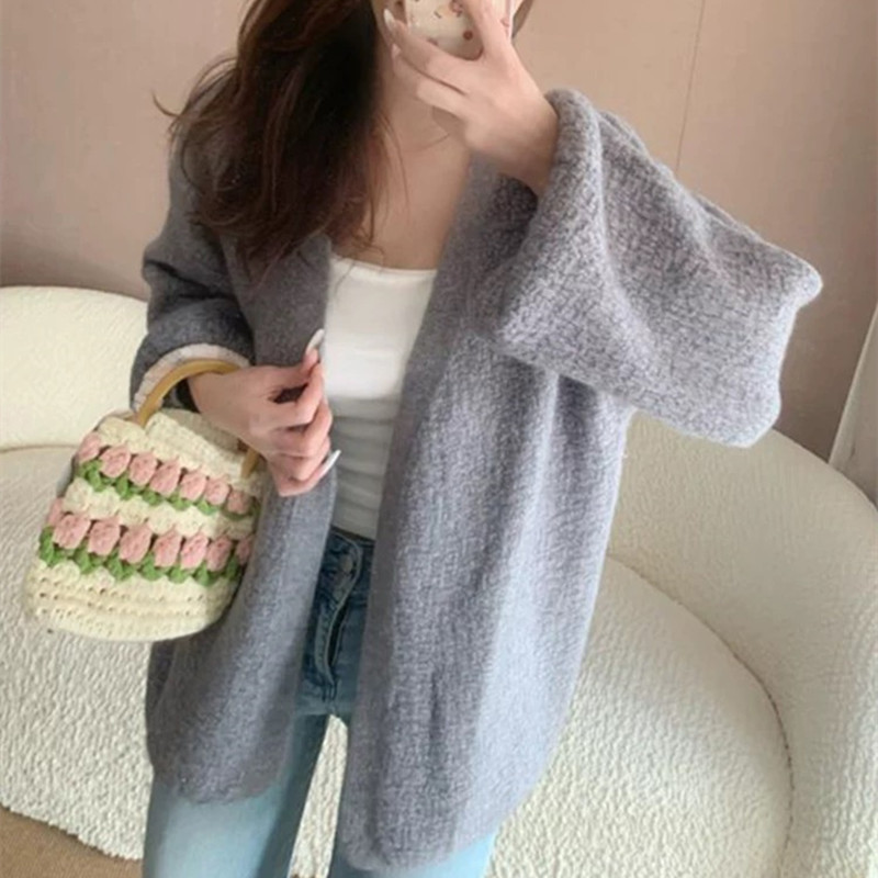 버튼이 없는 여성용 봄, 가을 게으른 스타일 니트 아우터, 두꺼운 니트 디자인, 여성용 서양식 랜턴 슬리브 아우터 재킷
