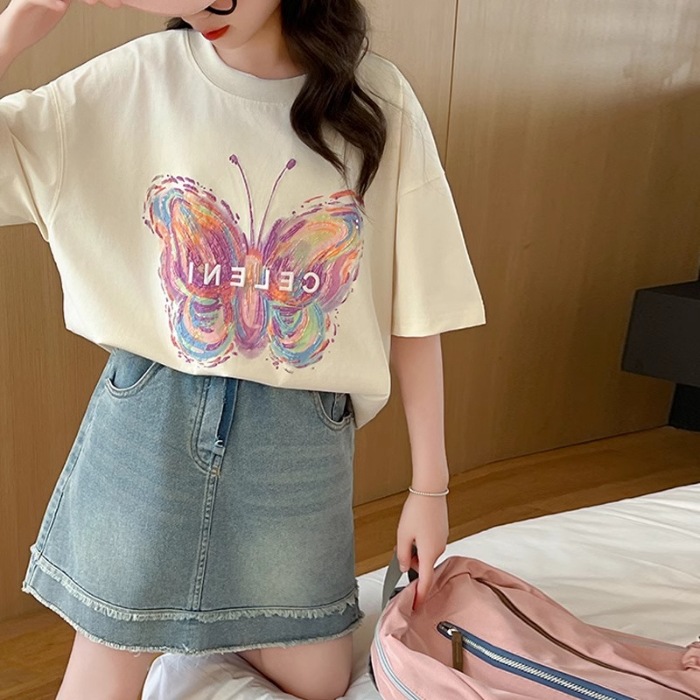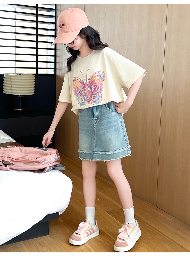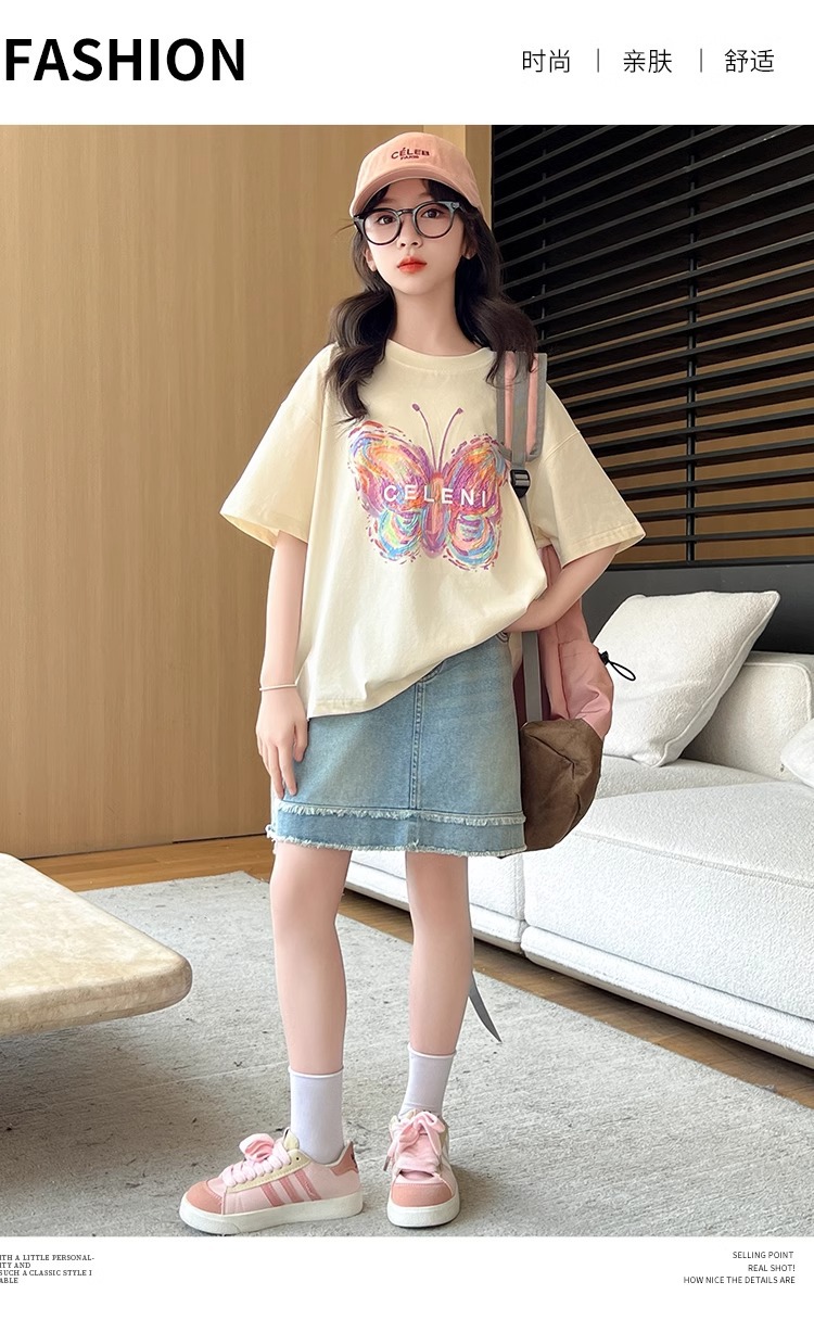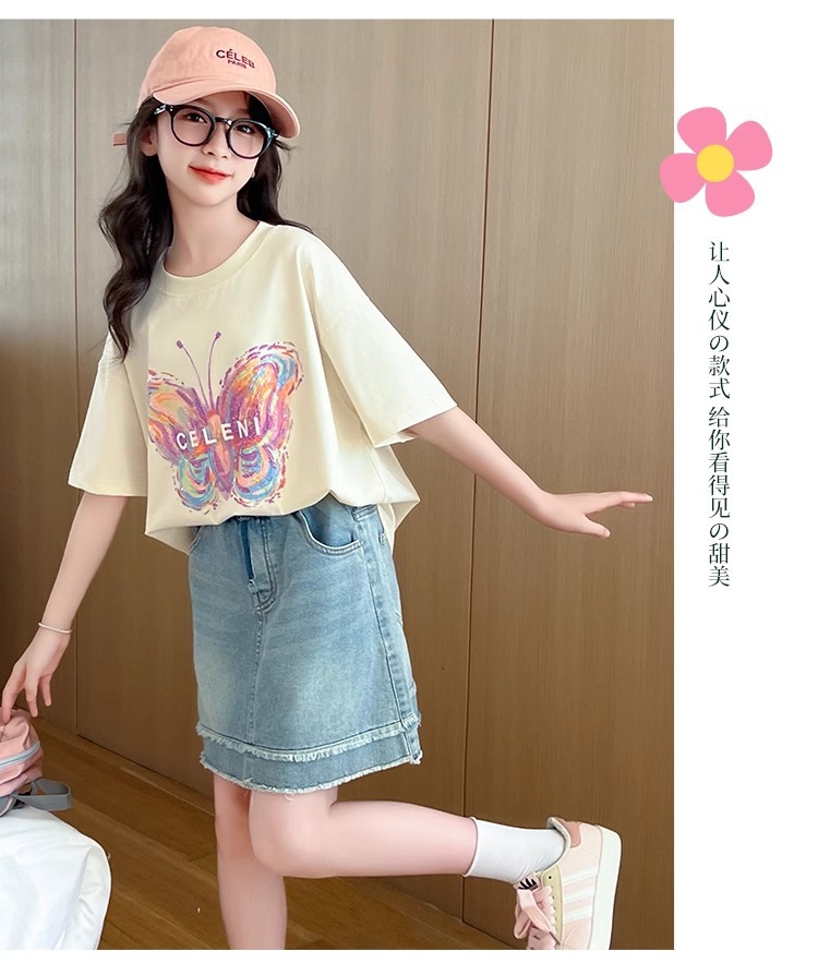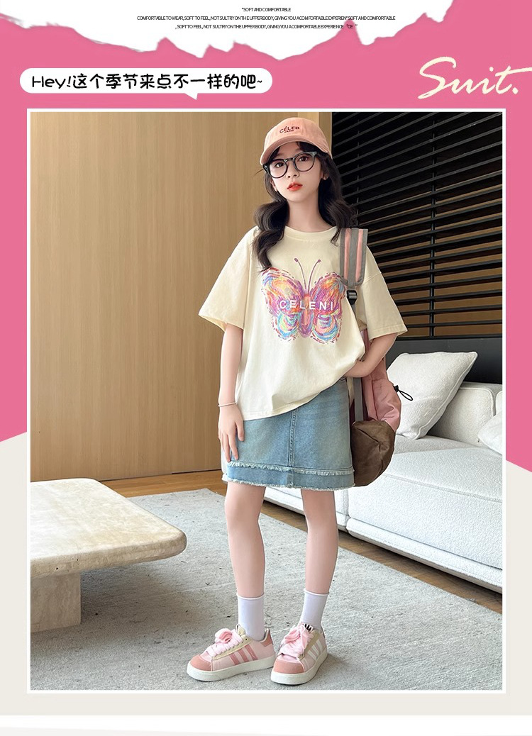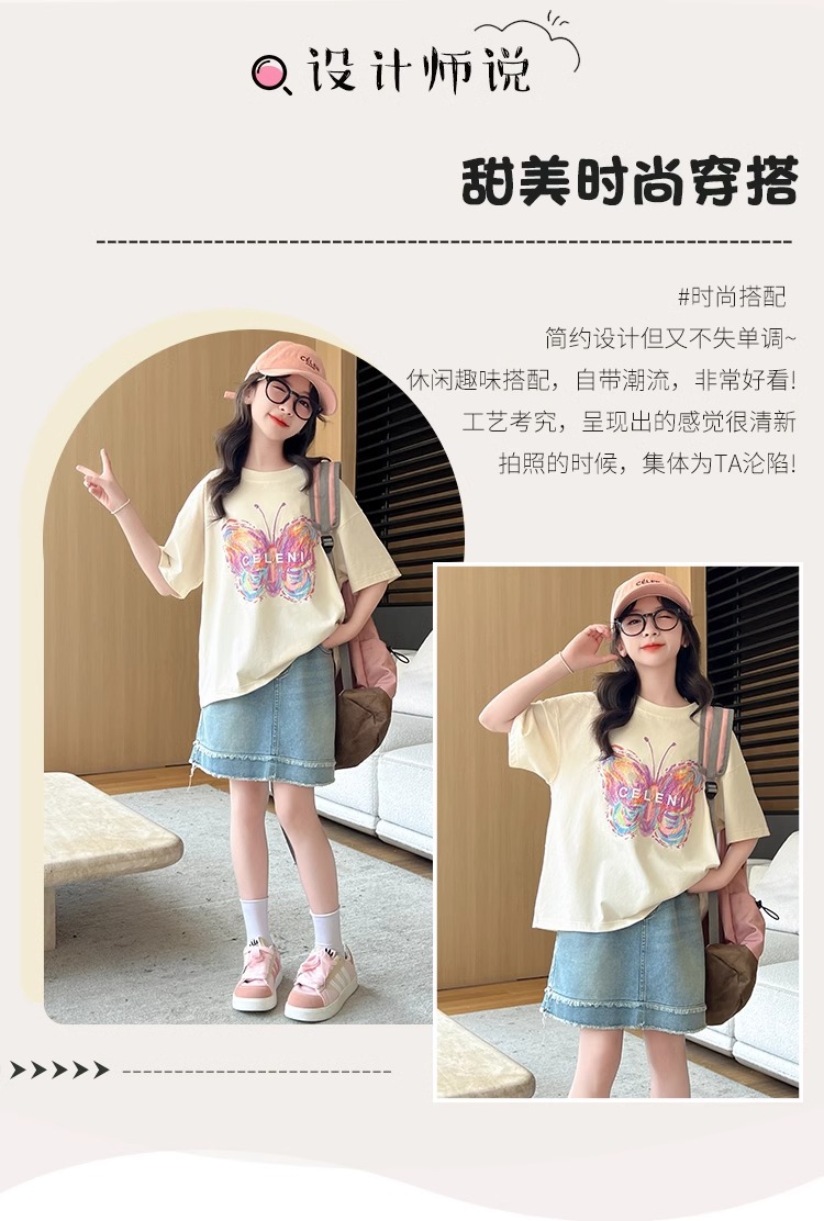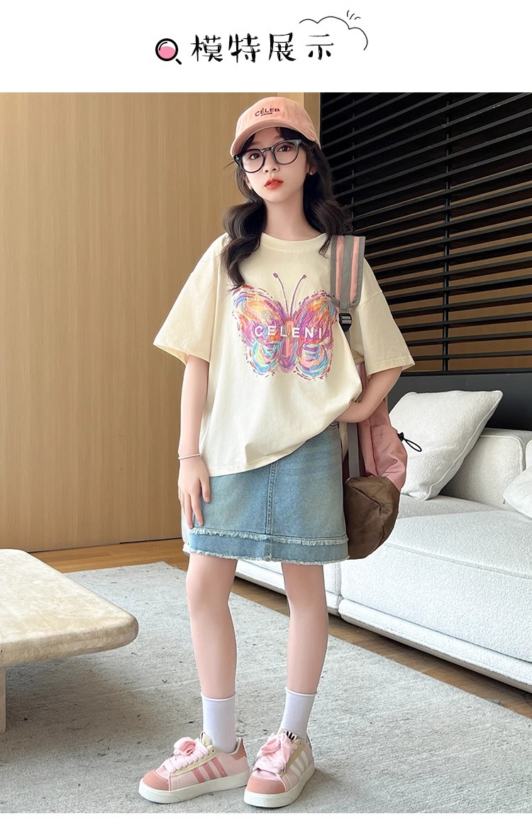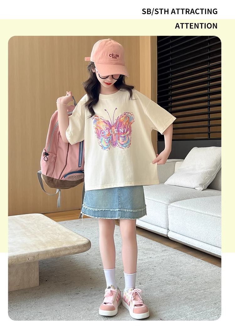 여아용 반팔 티셔츠, 중대형 아동용 여름옷, 100 순면 티셔츠, 어린 소녀용 나비 프린트 라운드 넥 반팔 탑스토어 가기