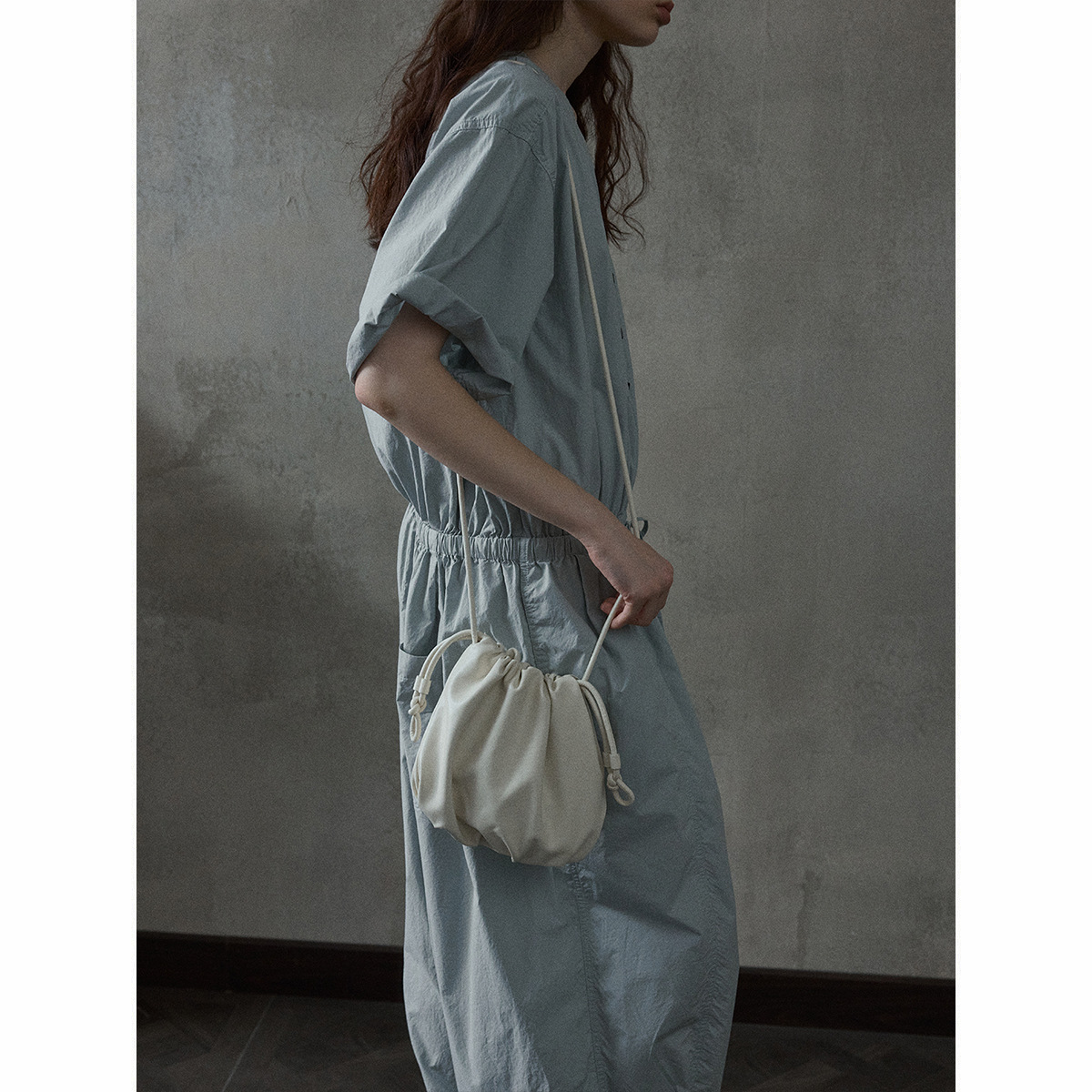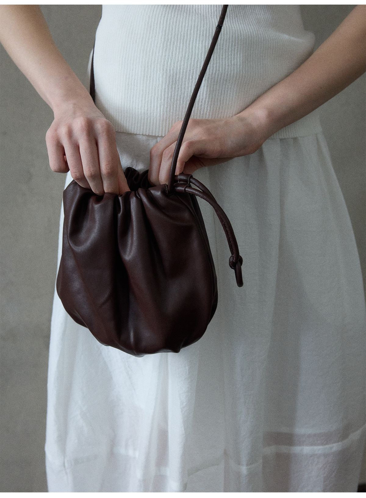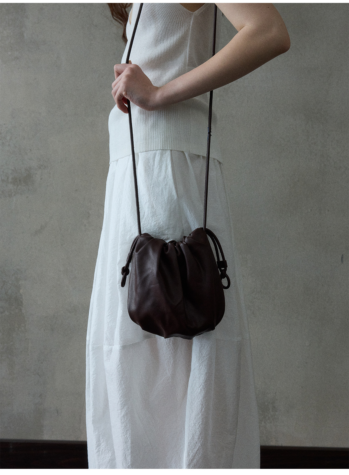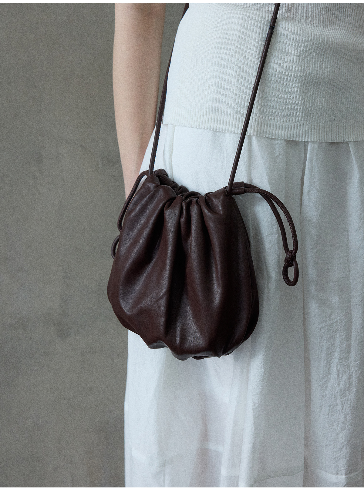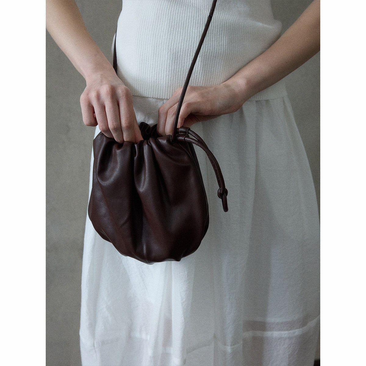 [몇 가지 알고] 소프트 왁스 클라우드 센스 드로스트링 크로스 바디 작은 가방 매일 일치하는 통근 휴대용 쉘 M8658