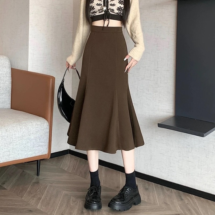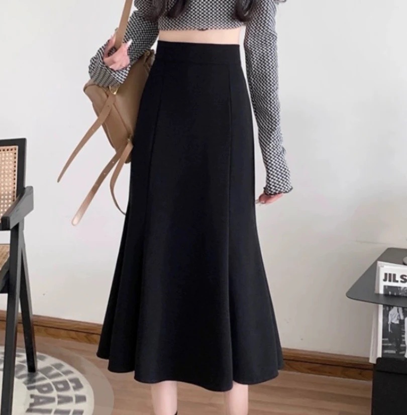 여성을위한 크로스 보더 2025 새로운 검은 정장 스커트 봄, 여름 높은 허리 탄성 슬리밍 중간 길이 a 라인 힙 스커트