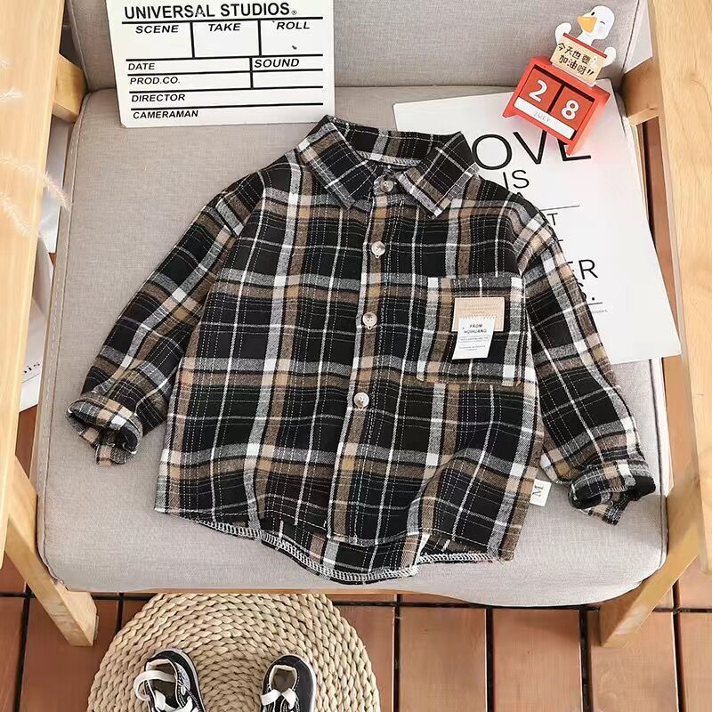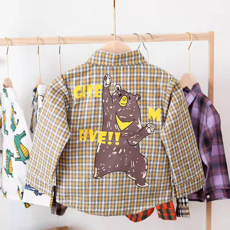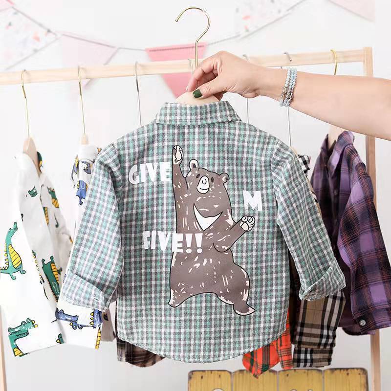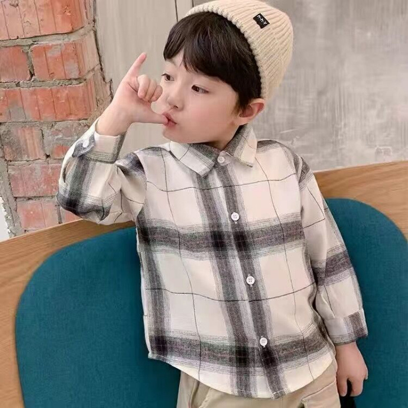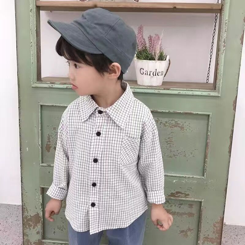 어린이 흰색 셔츠 2025 봄과 가을 새로운 스타일 한국 스타일 곰 자수 긴팔 격자 무늬 옷깃 셔츠 소년과 소녀를위한 유행스토어 가기