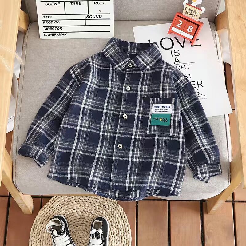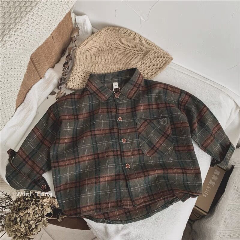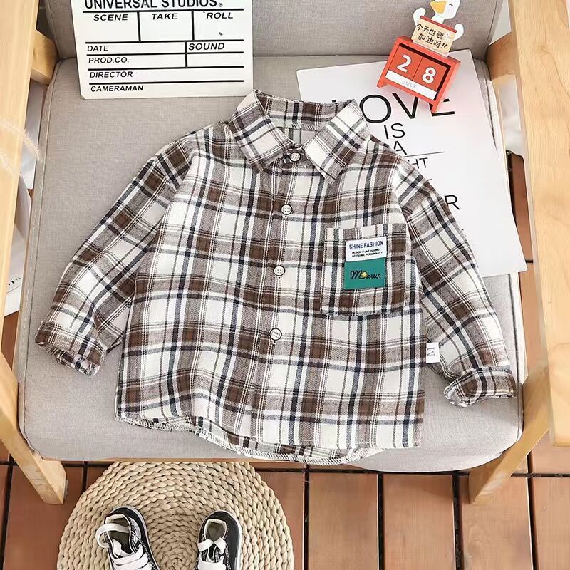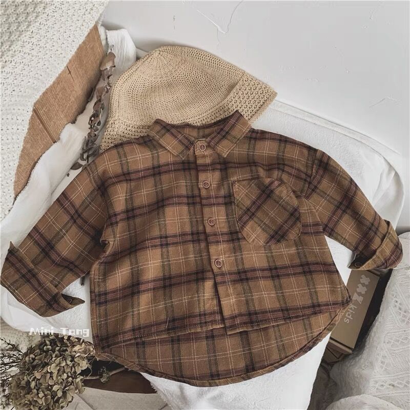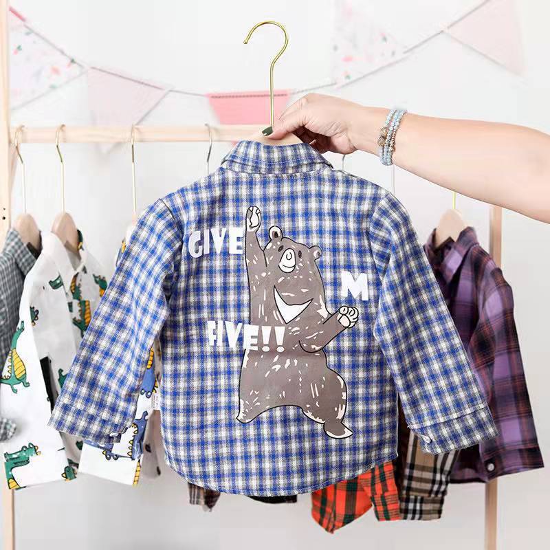 어린이 흰색 셔츠 2025 봄과 가을 새로운 스타일 한국 스타일 곰 자수 긴팔 격자 무늬 옷깃 셔츠 소년과 소녀를위한 유행스토어 가기