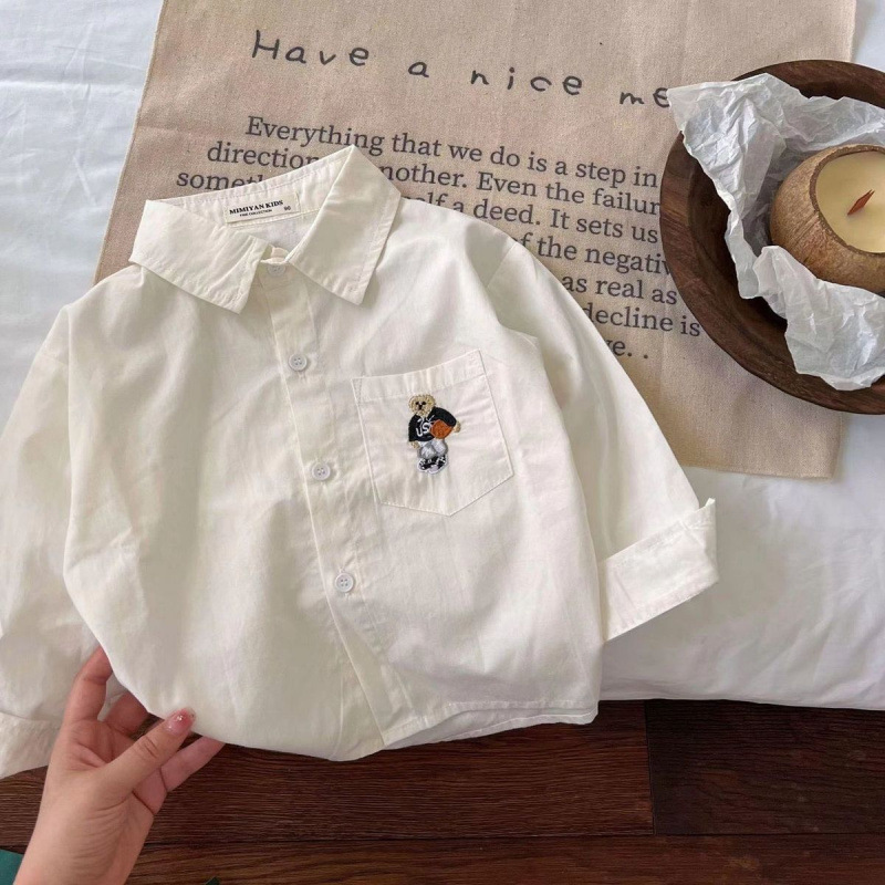 어린이 흰색 셔츠 2025 봄과 가을 새로운 스타일 한국 스타일 곰 자수 긴팔 격자 무늬 옷깃 셔츠 소년과 소녀를위한 유행
