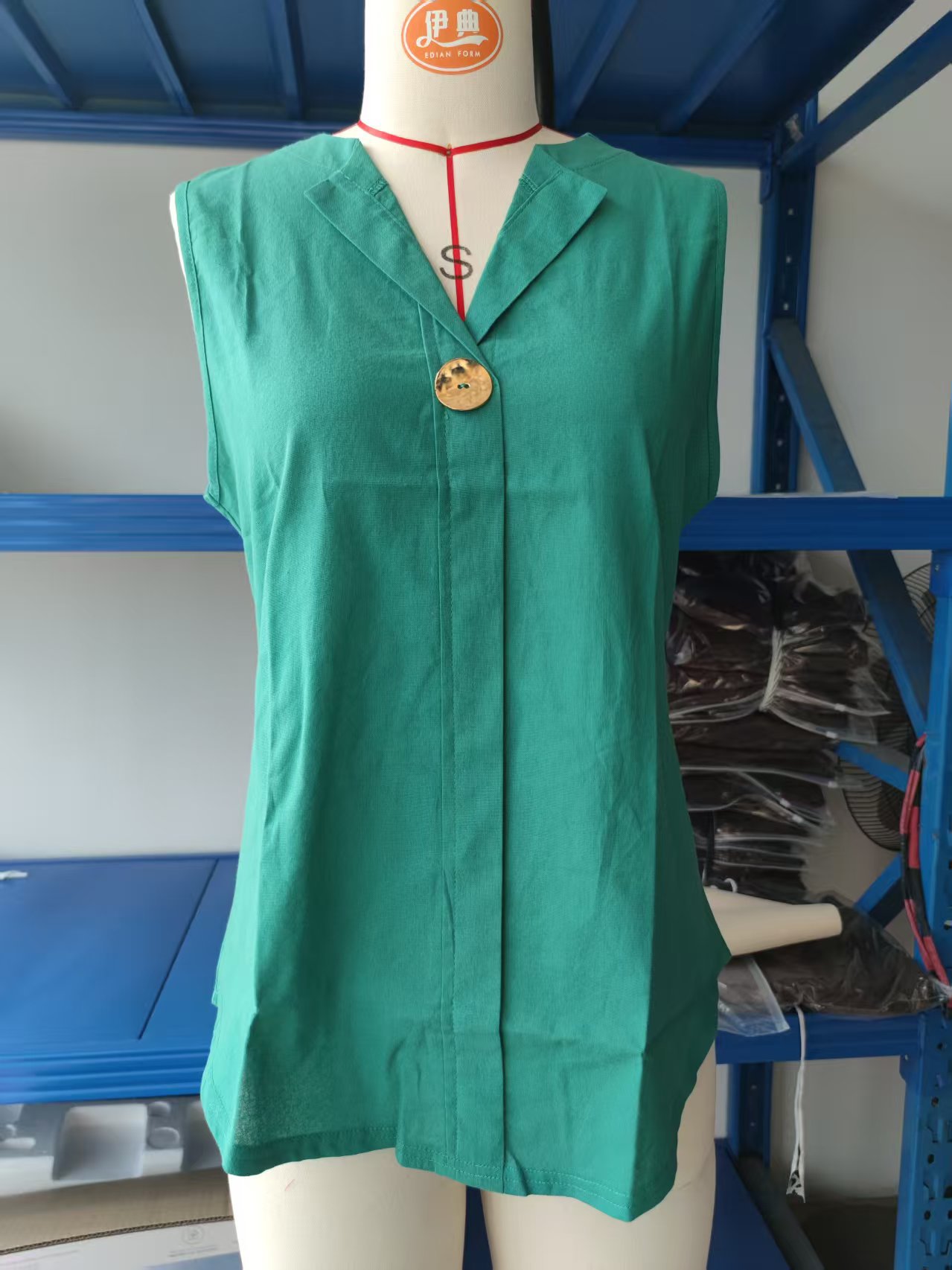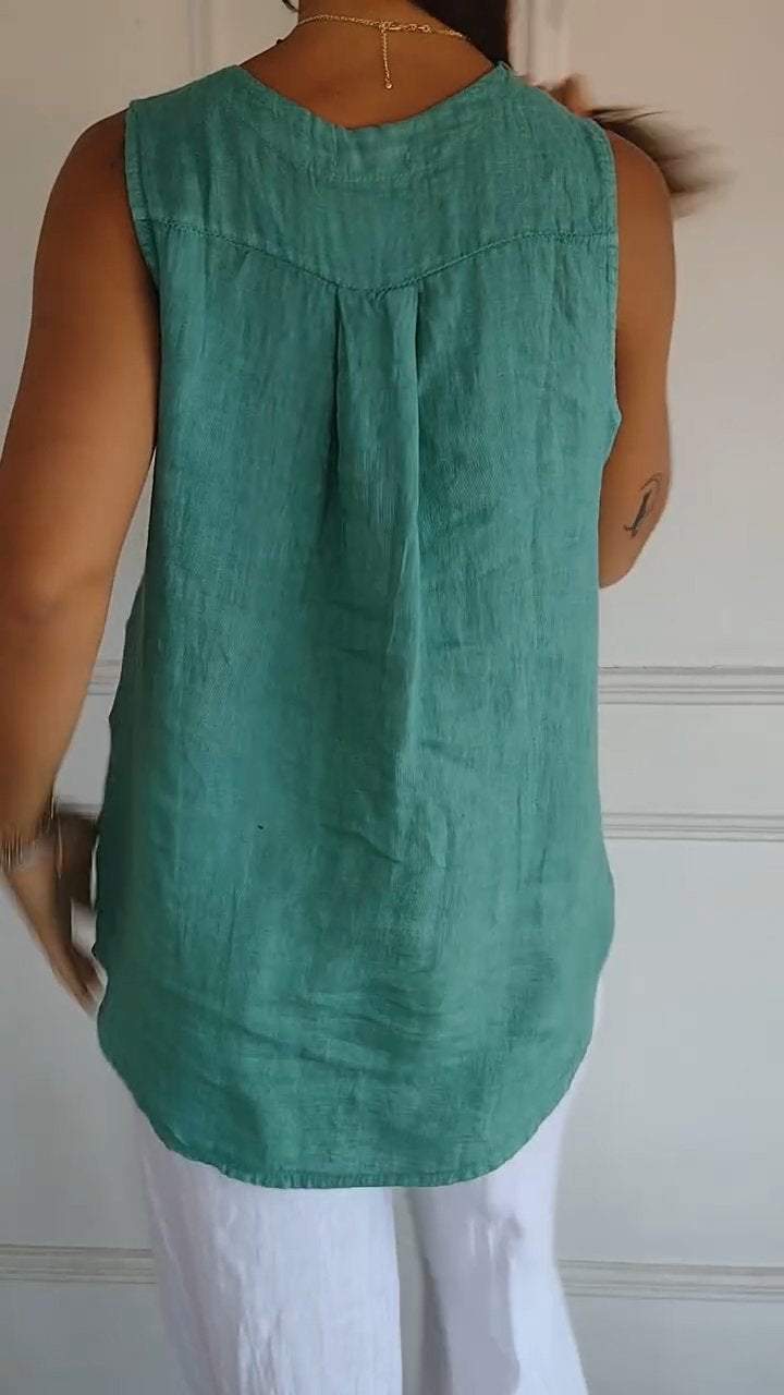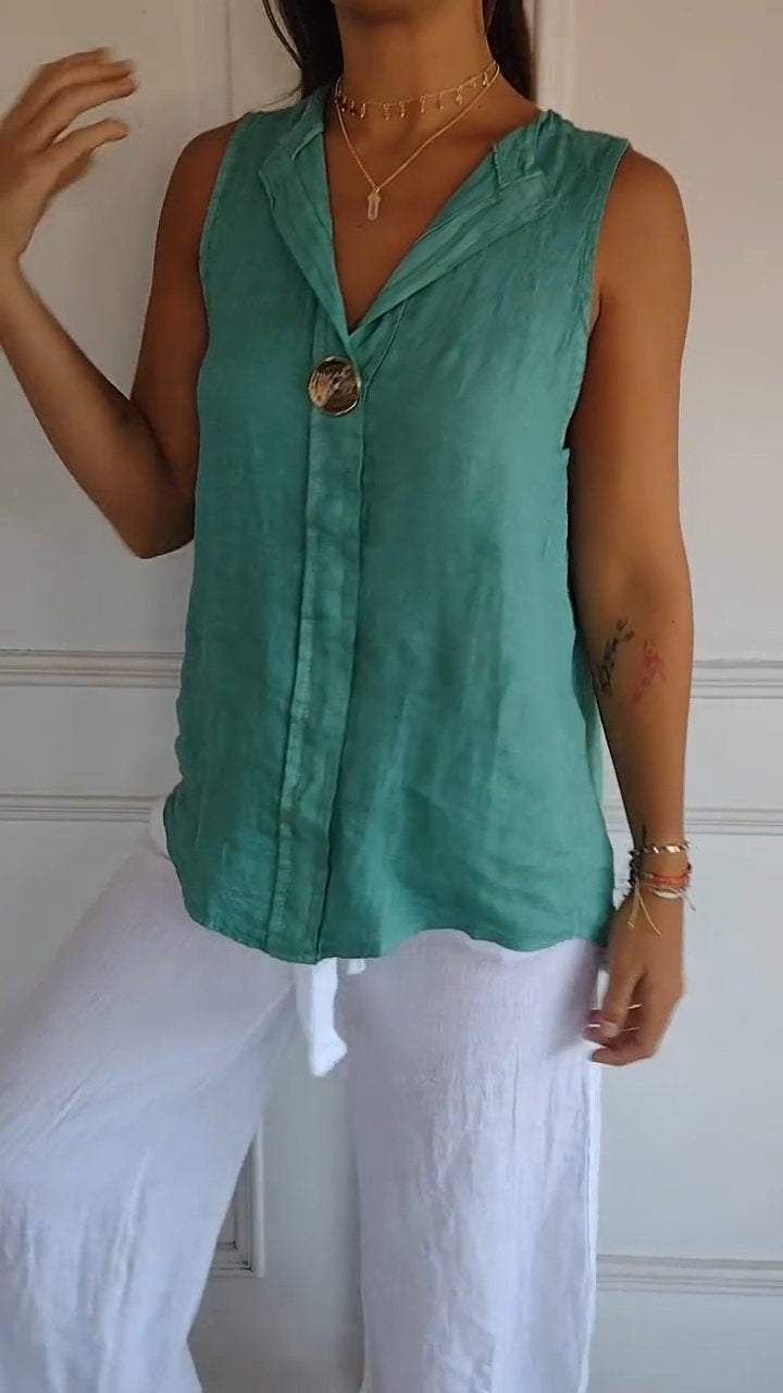 2025 Summer Cross-border Independent Station 새로운 유럽과 미국 여성의 솔리드 컬러 V 넥 코튼 및 리넨 원버튼 민소매 캐주얼 셔츠