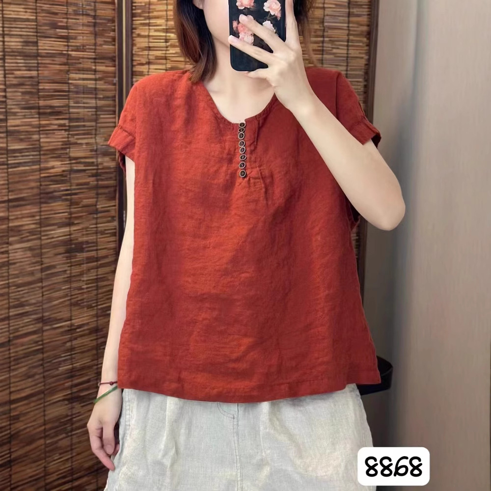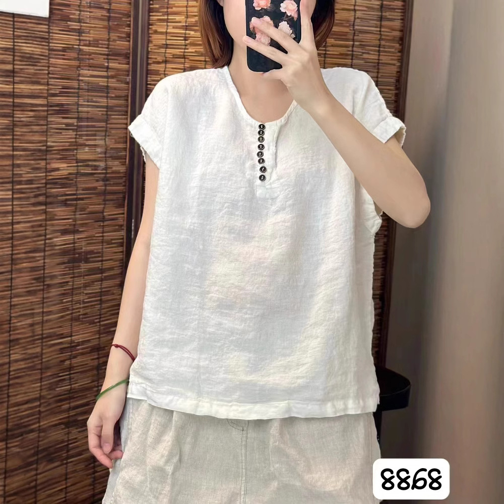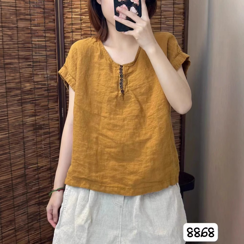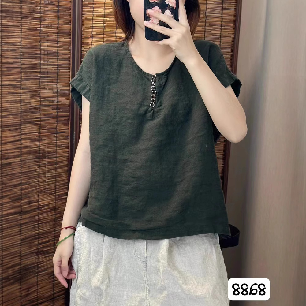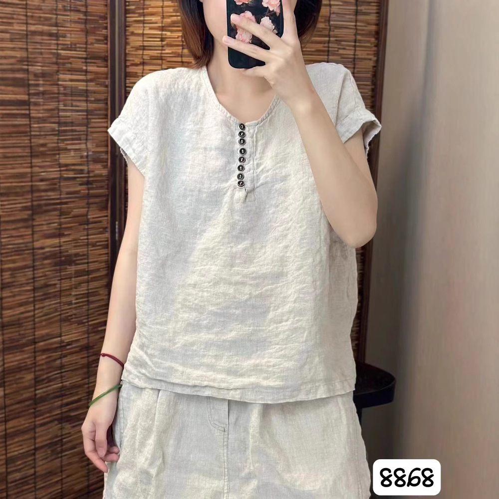 새로운 예술적 모래 세척 리넨 풀오버 최고 여성의 둥근 목 느슨한 짧은 소매 우아한 단색 티셔츠