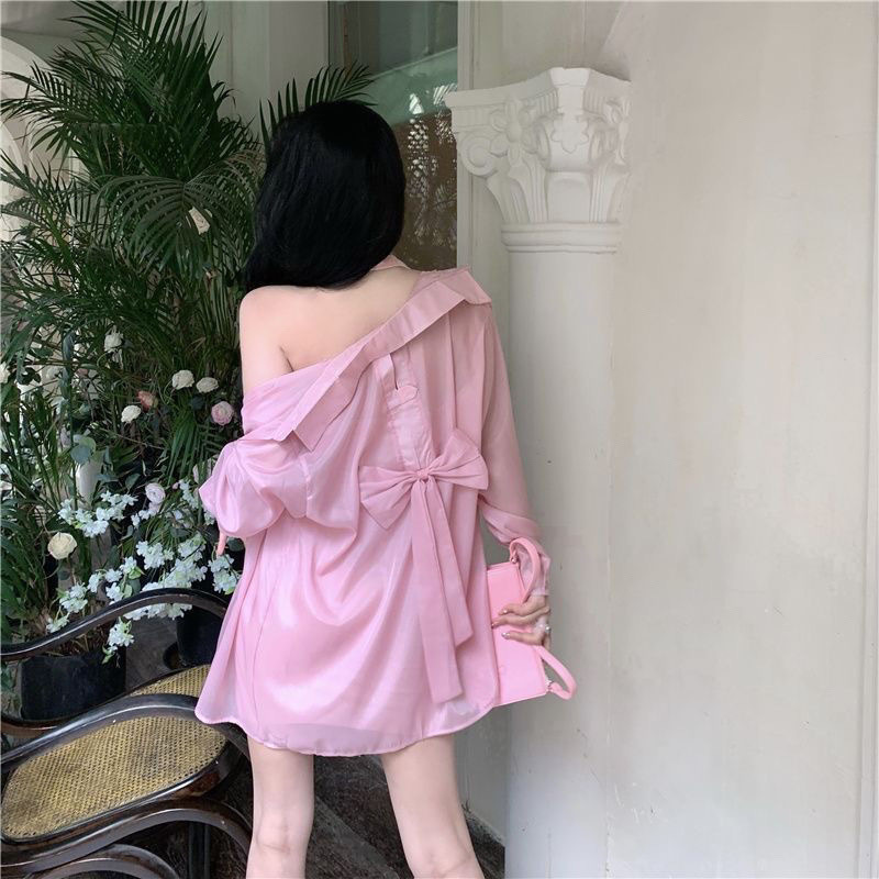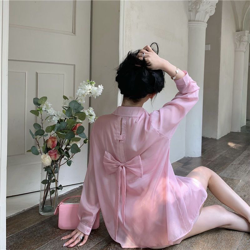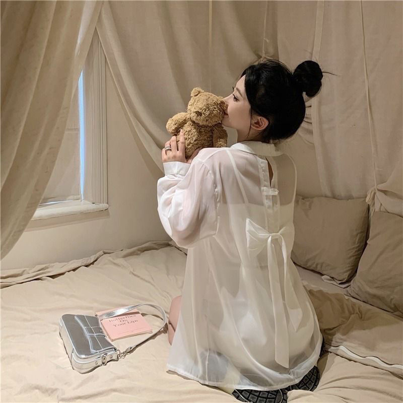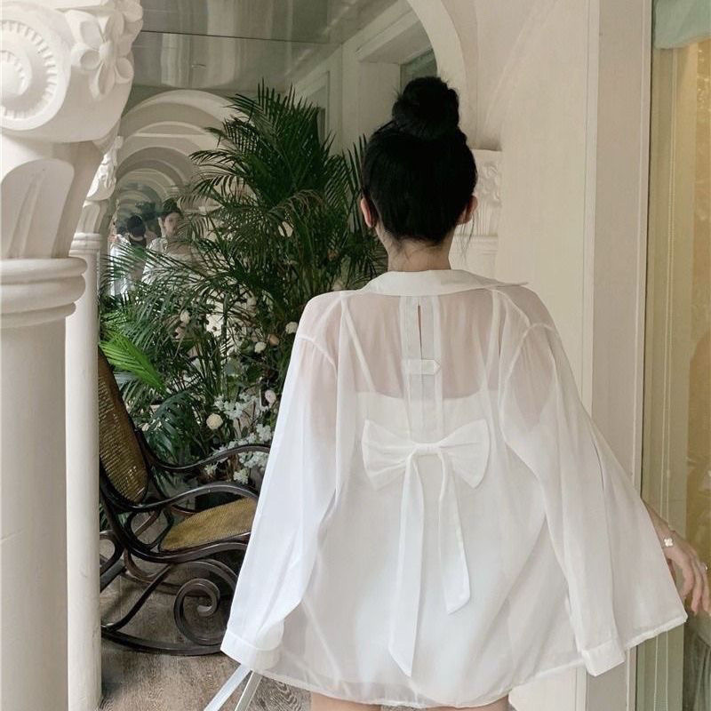 设计感蝴蝶结露背防晒衬衫外套女夏薄纱雪纺冰丝开衫衬衣上衣外套