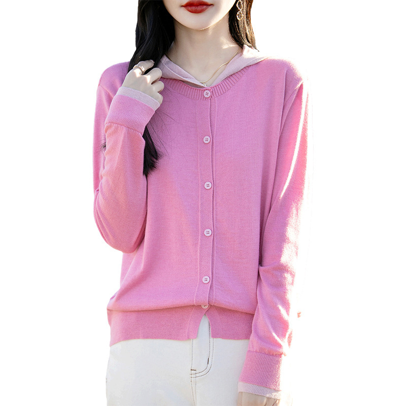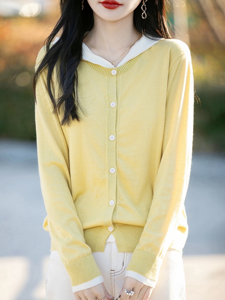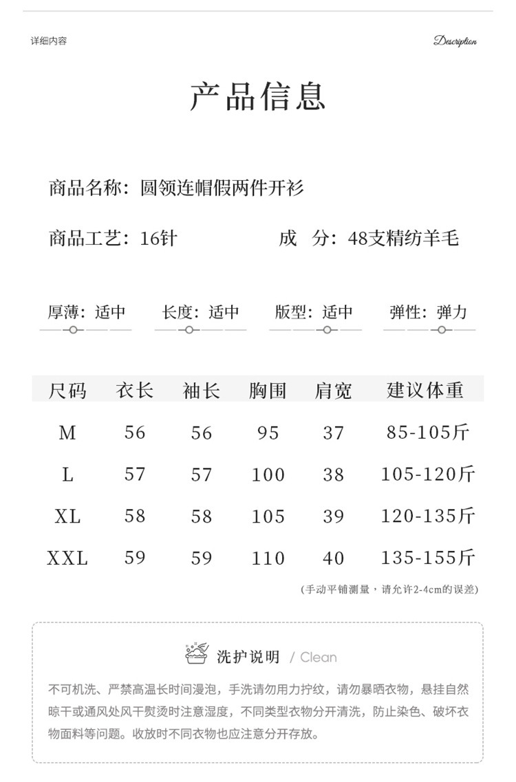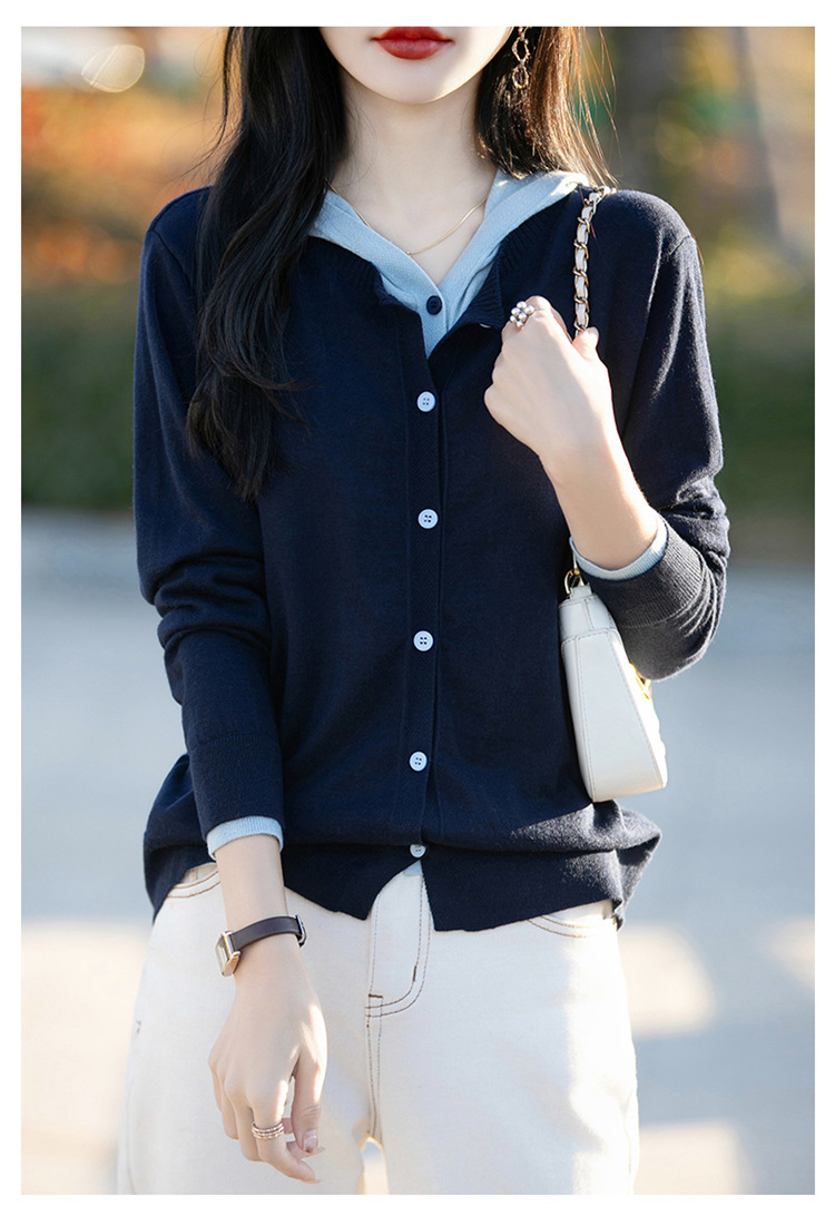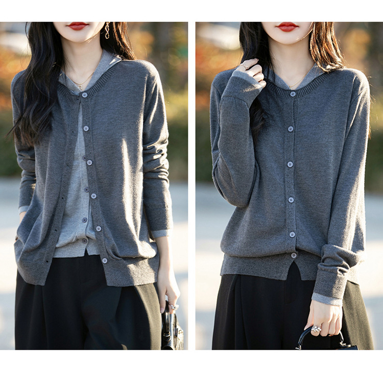 대비 색상 가짜 투피스 후드 니트 카디건 여성용 소모사 울 캐주얼 재킷 스웨터 새로운 다용도 컬러 블록 탑