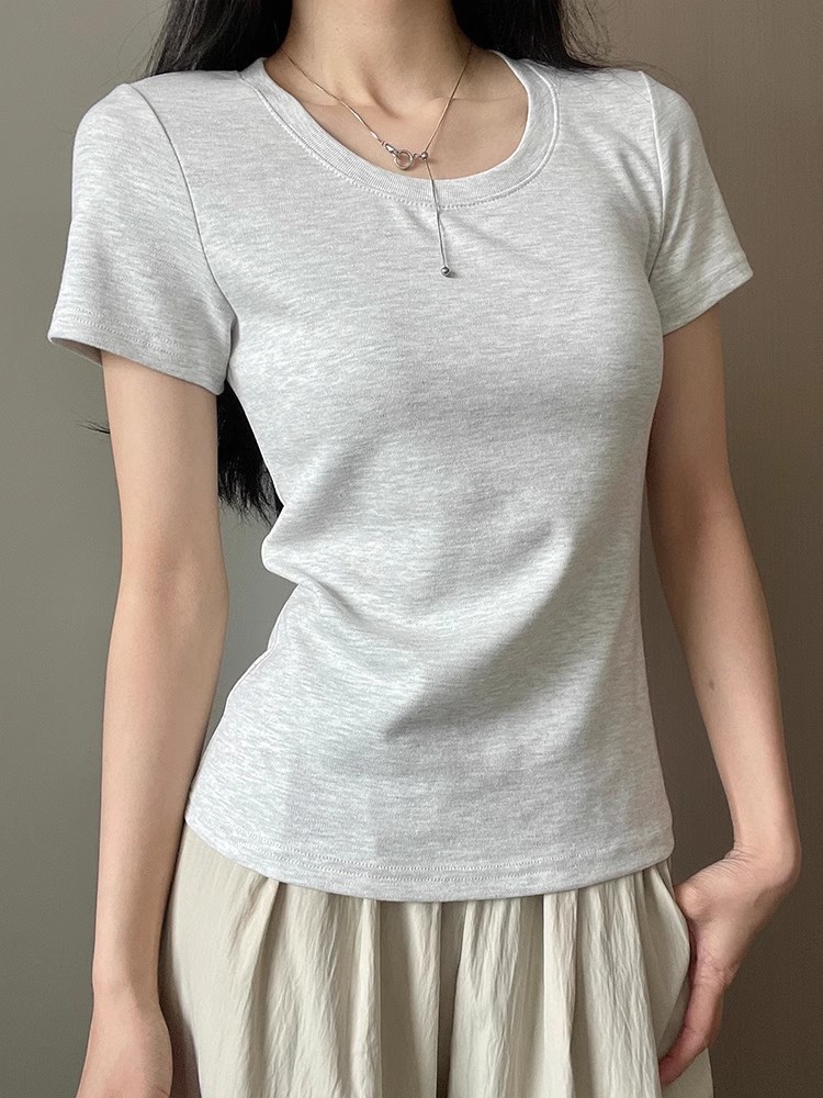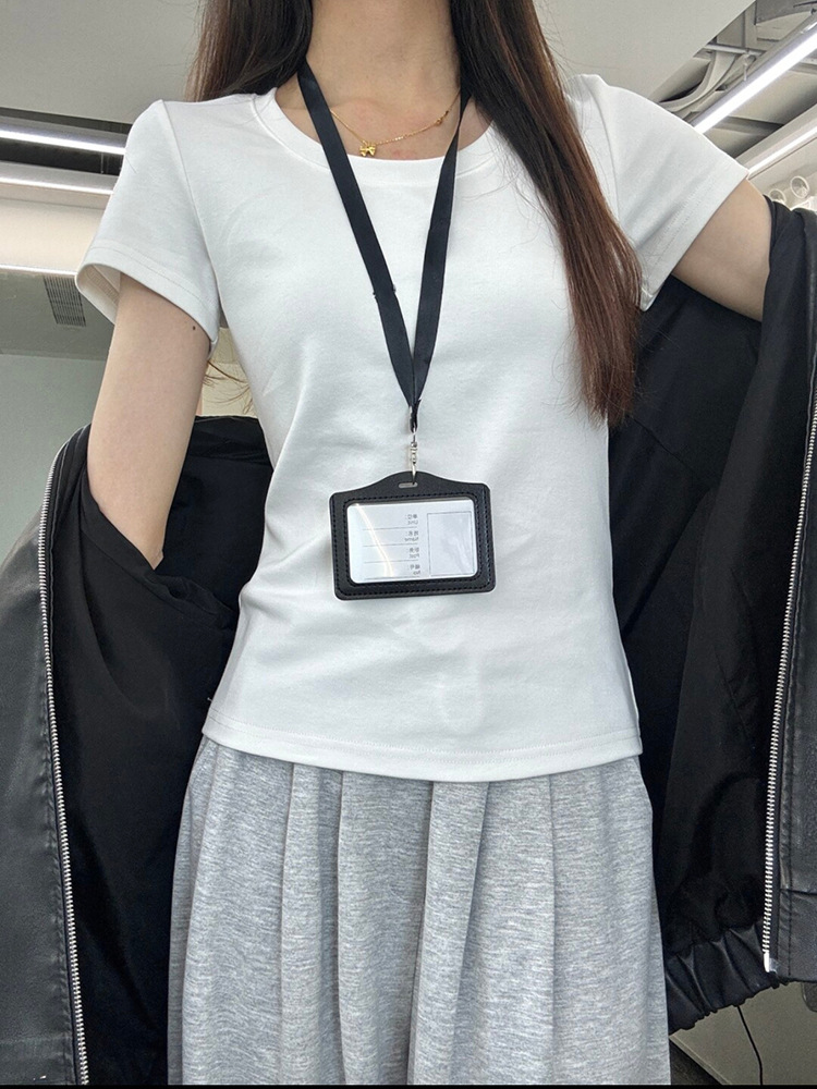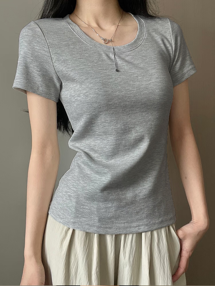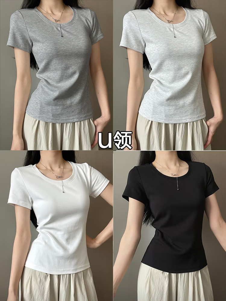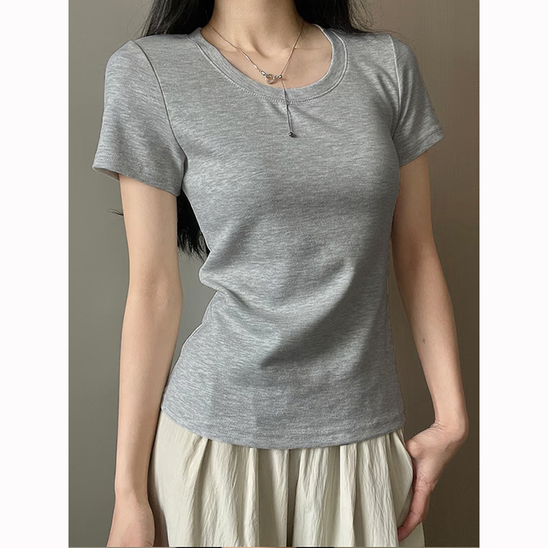 어깨 반팔 티셔츠 여자 2025 년 여름 새 달콤한 스파이스 소녀 라운드 넥 슬림 핏 스파이스 걸 슬림 핏 캐주얼 올 매치 탑