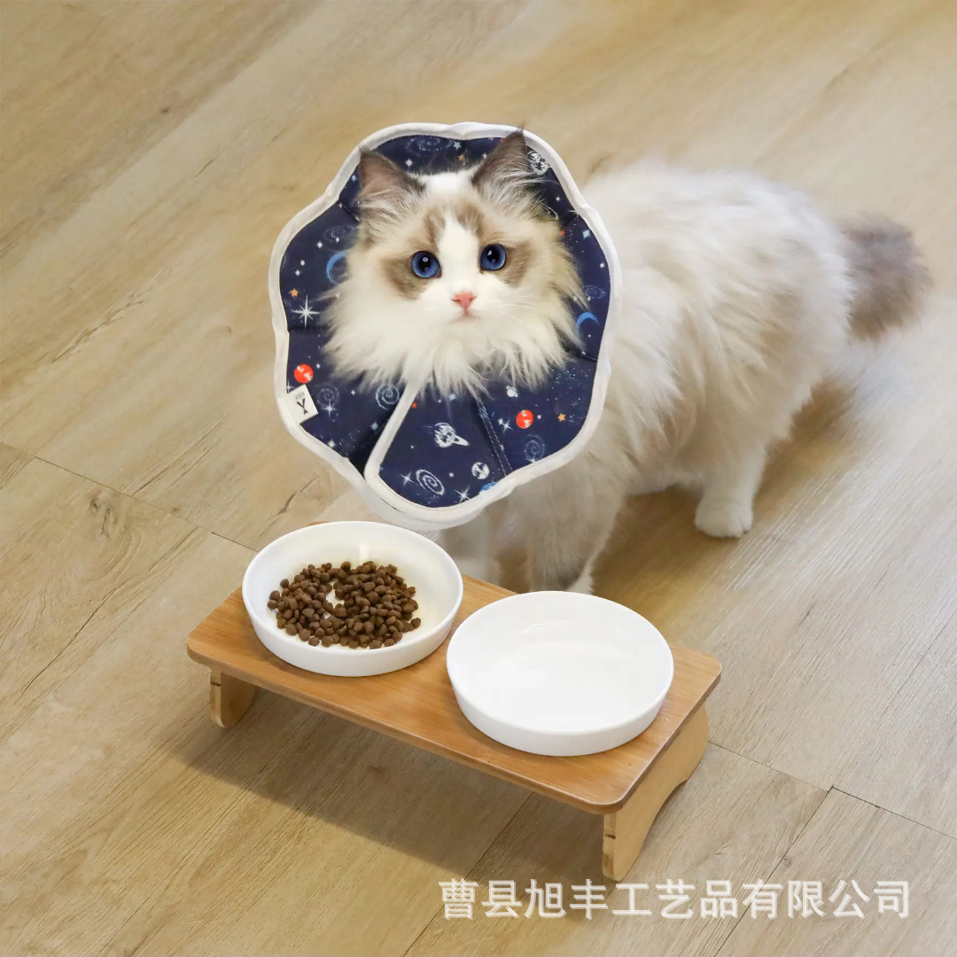경추를 보호하기 위해 높이를 높여주는 국경 간 대나무 고양이 사료 및 식수대, 애완동물 먹이대, 세라믹 이중 그릇, 개밥 그릇대