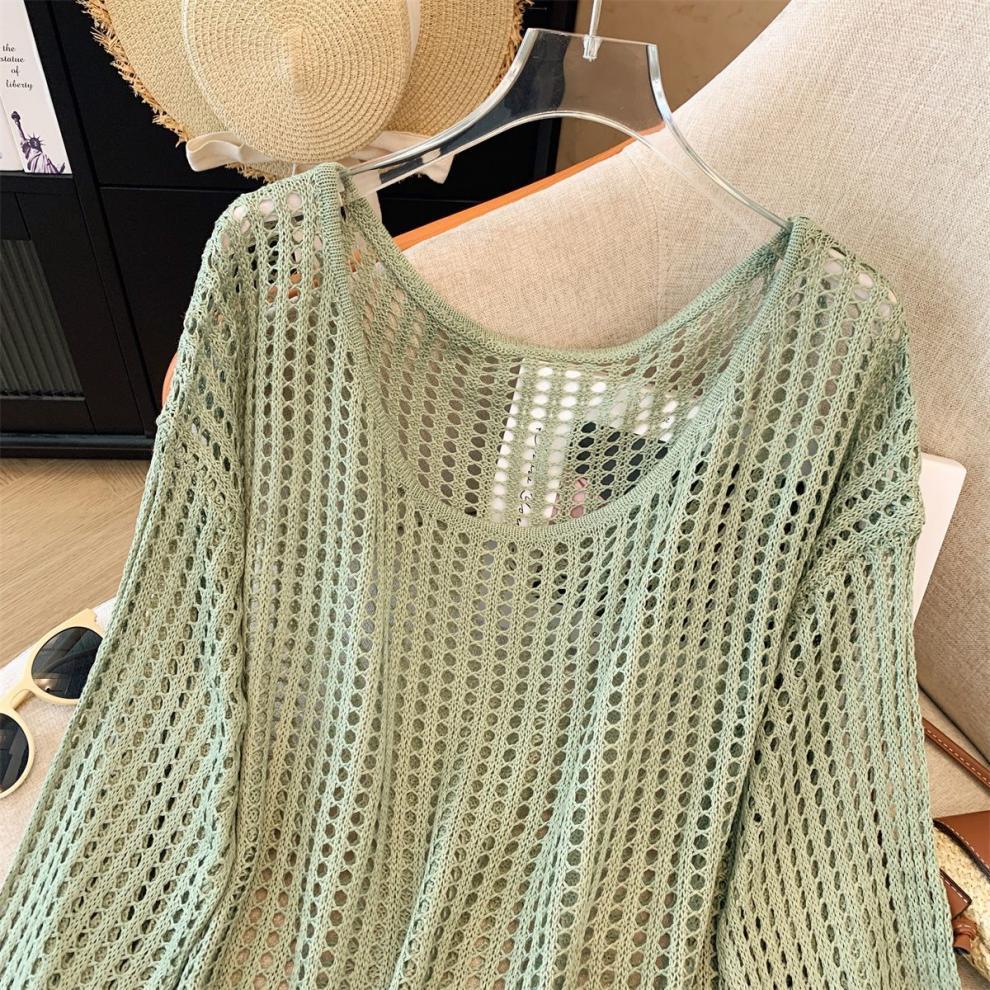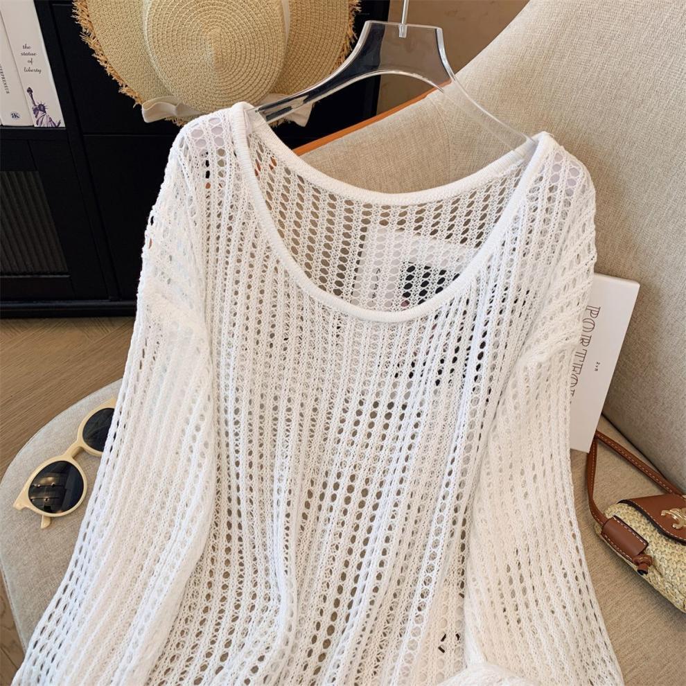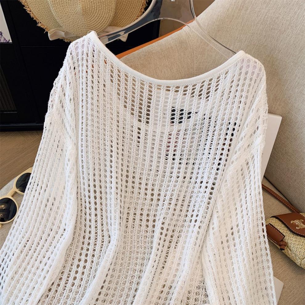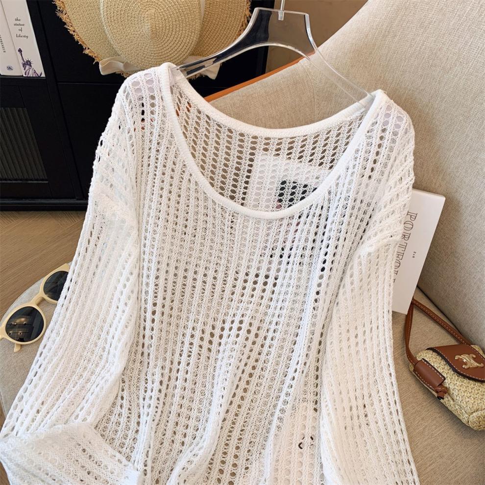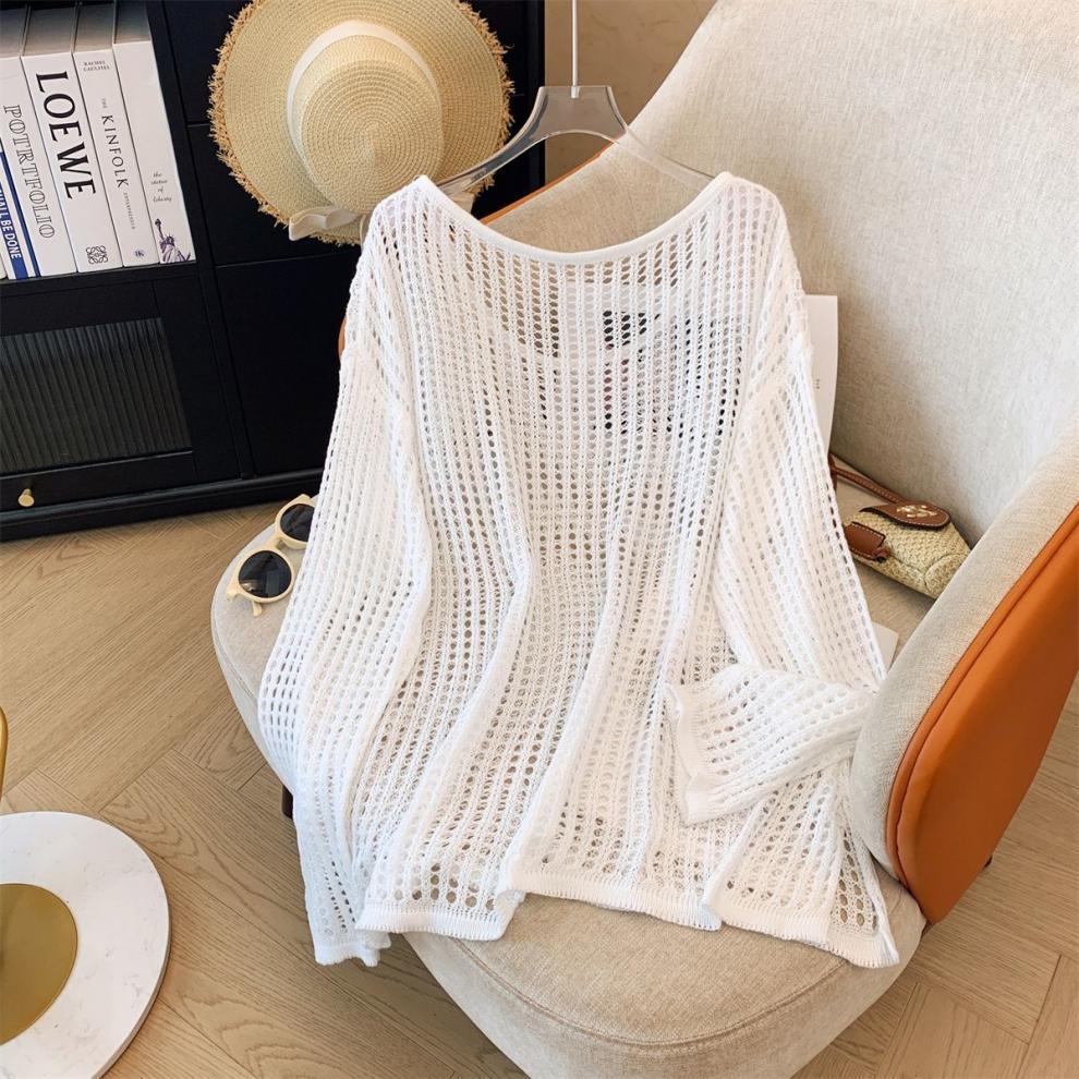 [재고] 할로우 아웃 스웨터 최고 여성 봄과 여름 얇은 느슨한 게으른 바람 관점 긴 소매 자외선 차단제 블라우스