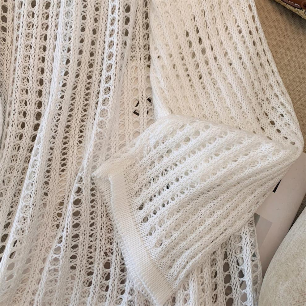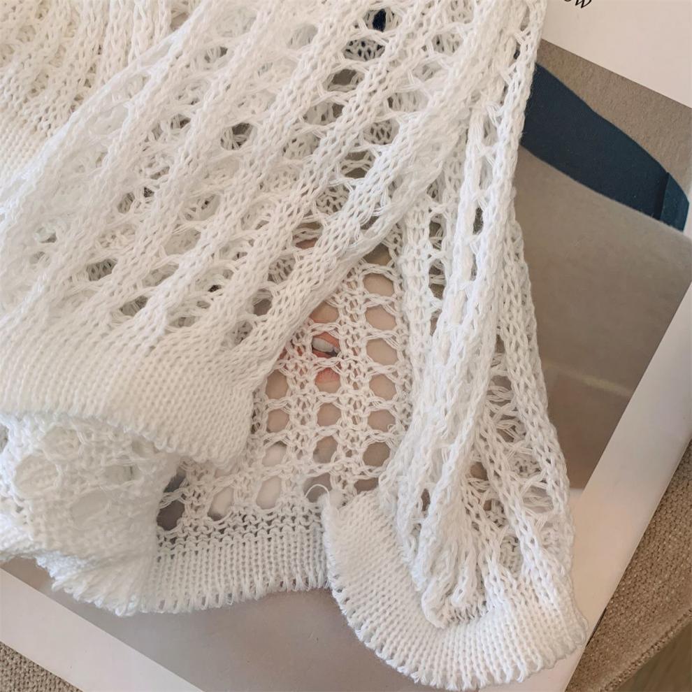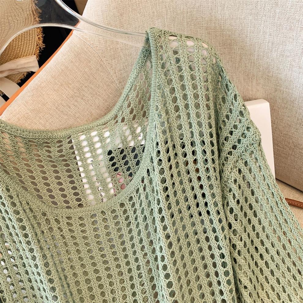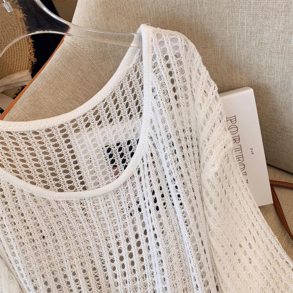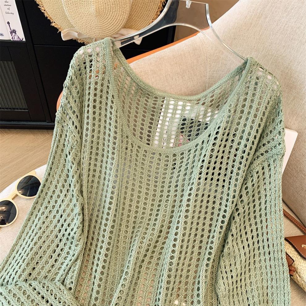 [재고] 할로우 아웃 스웨터 최고 여성 봄과 여름 얇은 느슨한 게으른 바람 관점 긴 소매 자외선 차단제 블라우스