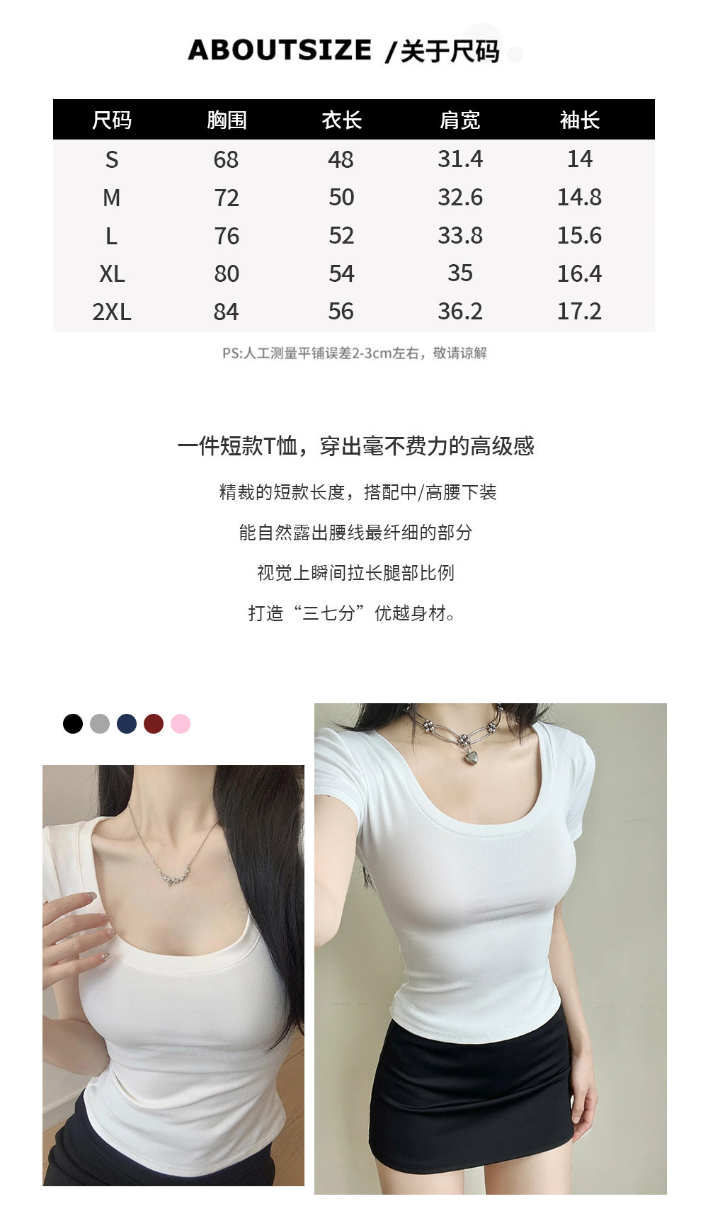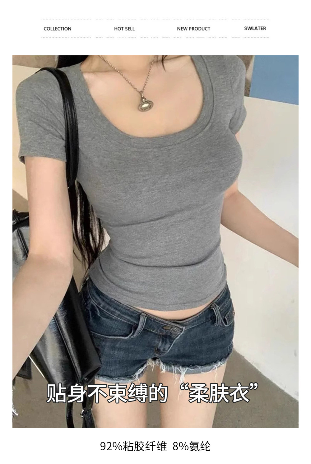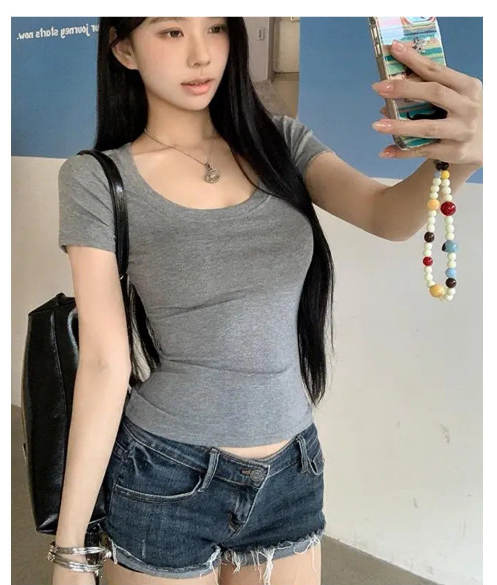 여성용 타이트핏 반팔 티셔츠, 어깨가 드러나는 넓은 U넥, 쇄골 노출, 캐주얼하고 다용도로 활용 가능한 슬림핏 숏탑, 섹시한 핫걸 티셔츠