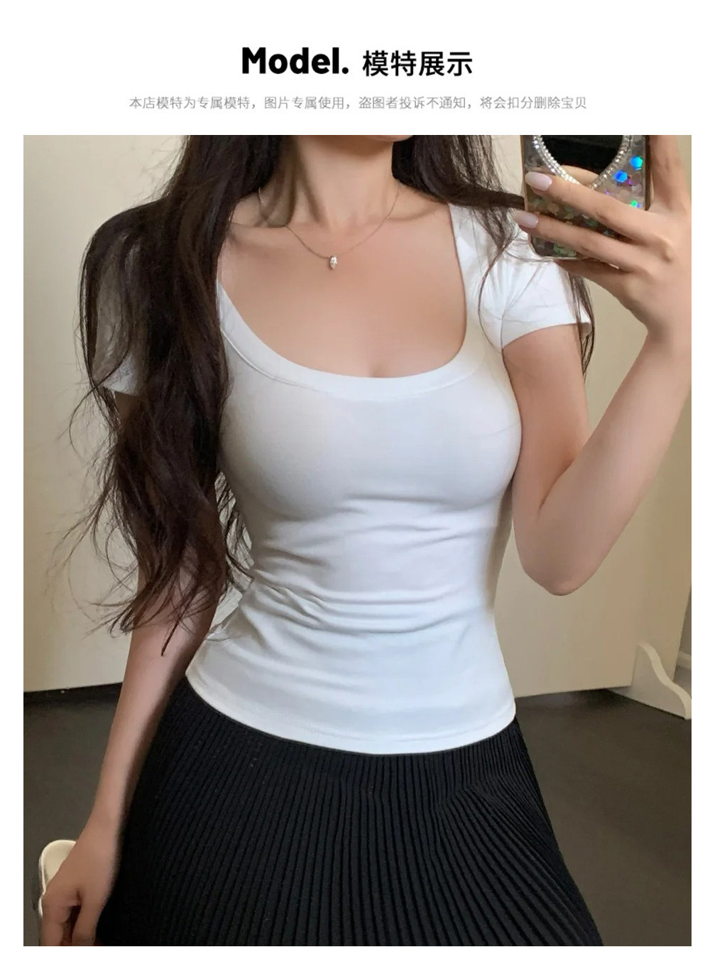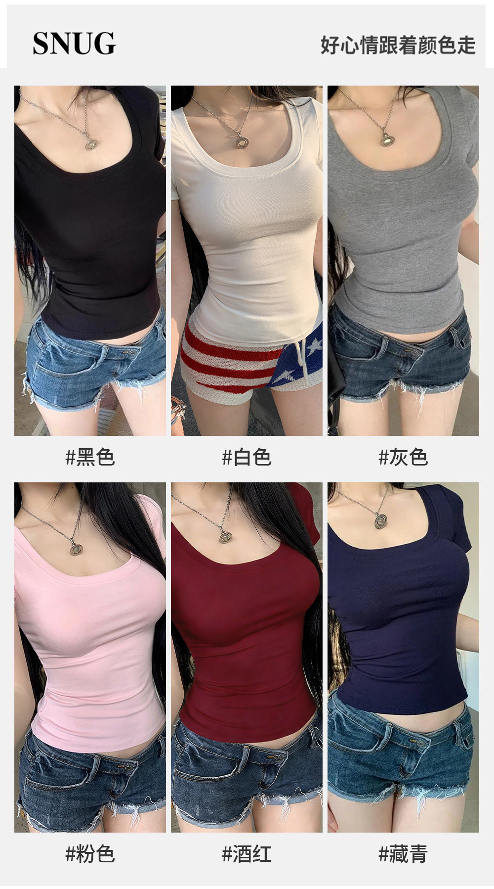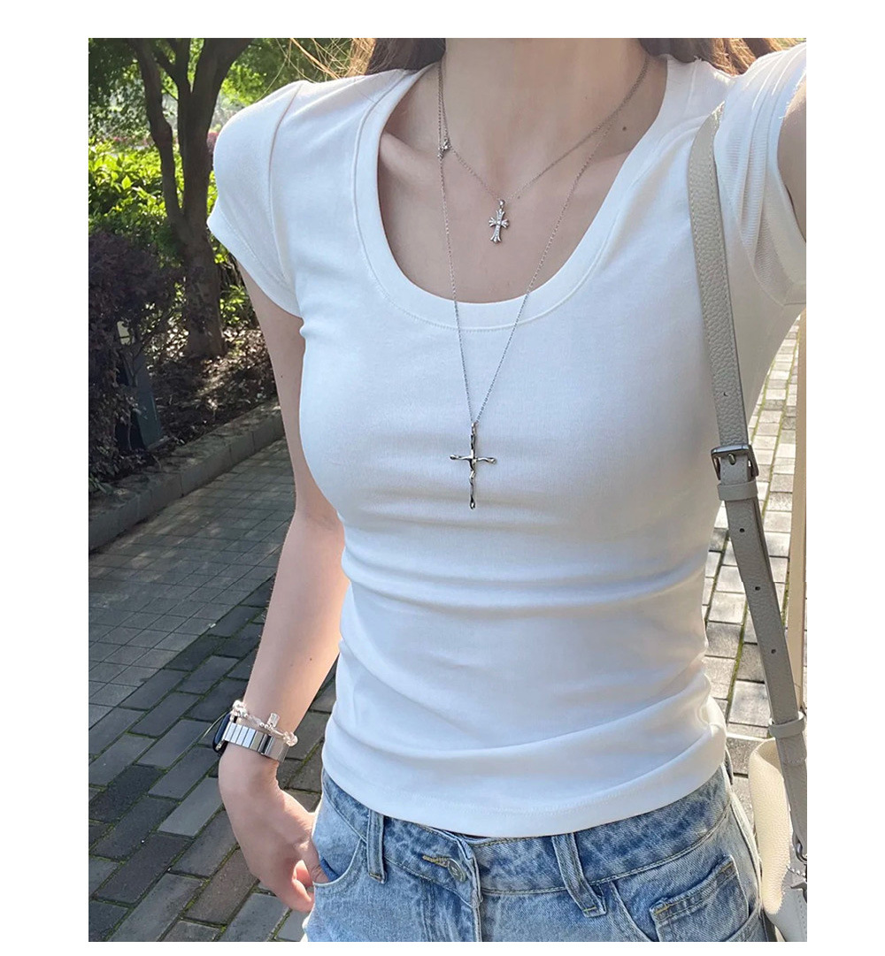 여성용 타이트핏 반팔 티셔츠, 어깨가 드러나는 넓은 U넥, 쇄골 노출, 캐주얼하고 다용도로 활용 가능한 슬림핏 숏탑, 섹시한 핫걸 티셔츠