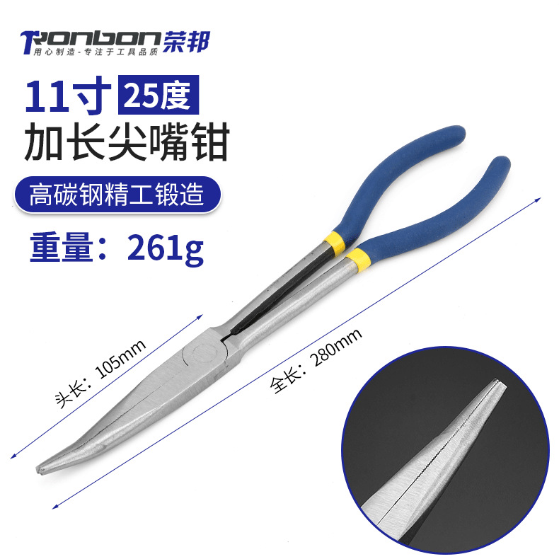 긴 뾰족한 코 펜치 팔꿈치 펜치 11 인치 여분의 긴 팔꿈치 점화 플러그 클램핑 펜치 25 45 90 도