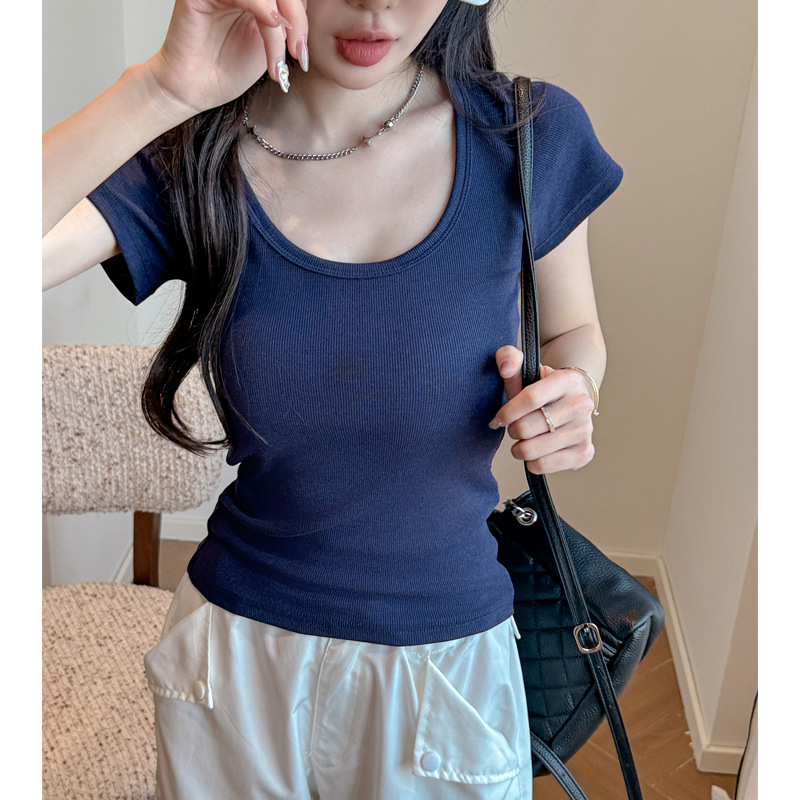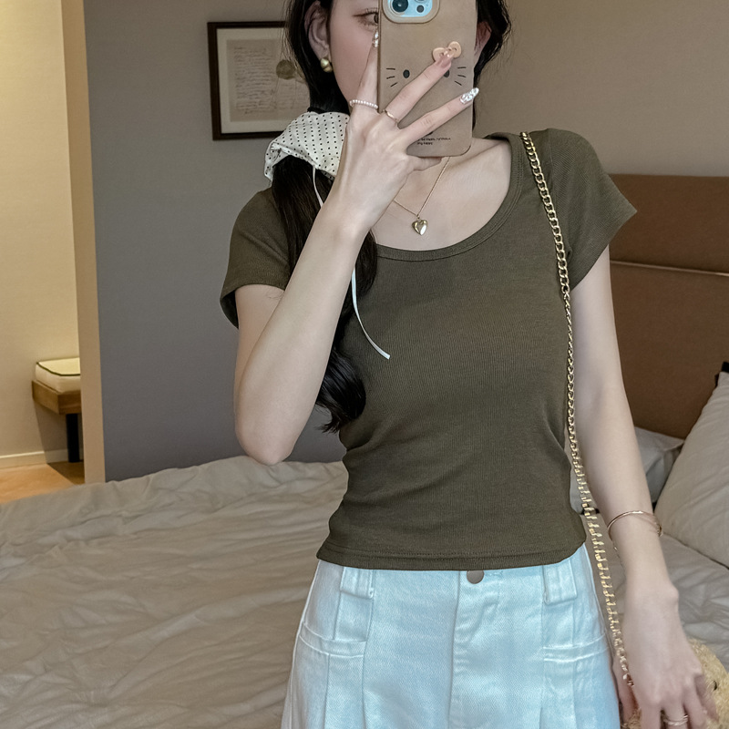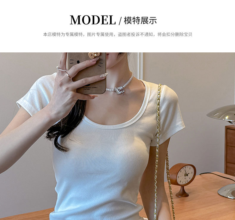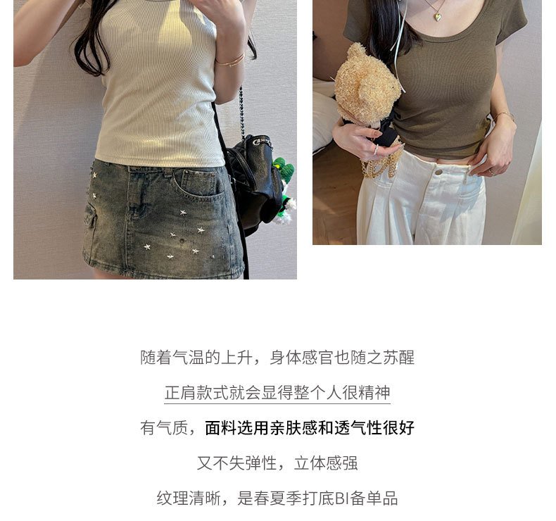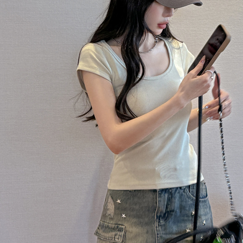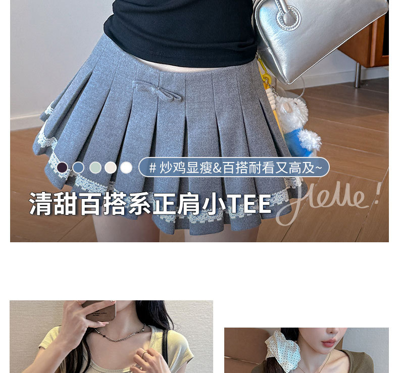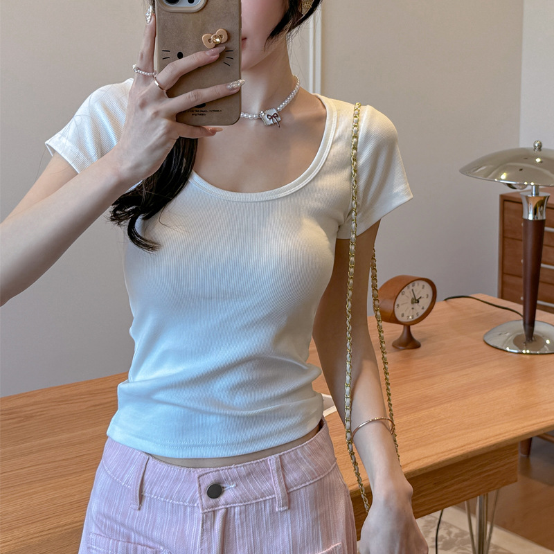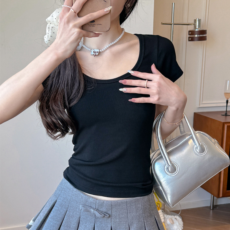 기본 반팔 티셔츠 여성 2025 년 봄과 여름 새로운 슬림핏 슬리밍 간단한 우아한 어깨 스파이스 소녀 Bottoming Top스토어 가기