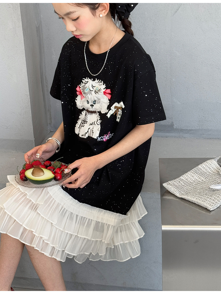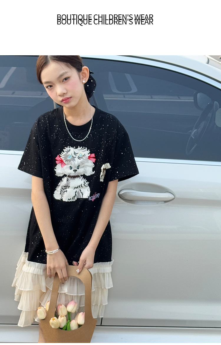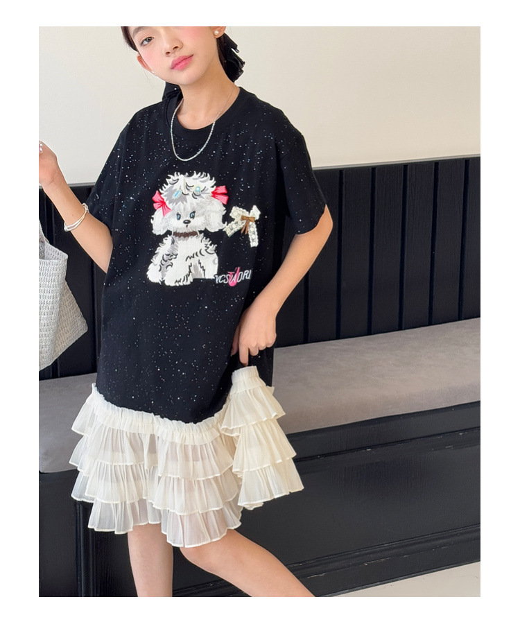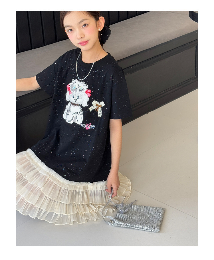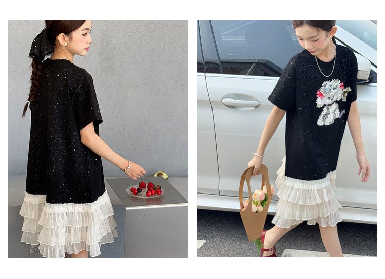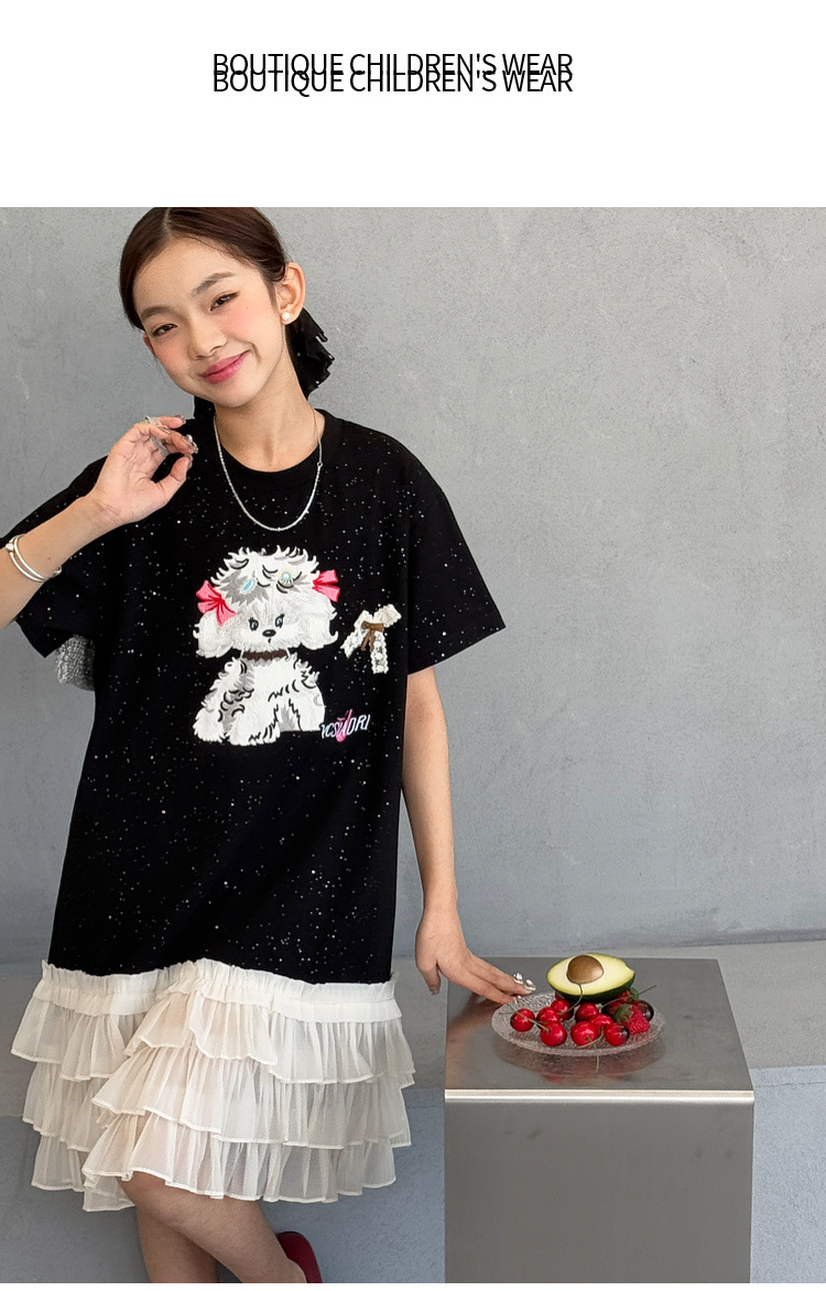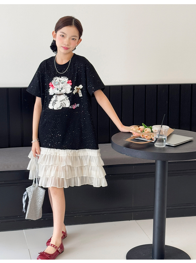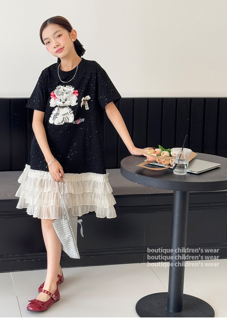 소녀 원피스 2025 여름 새로운 어린이 메쉬 스티칭 캐주얼 스커트 큰 어린이 만화 느슨한 티셔츠 스커트스토어 가기