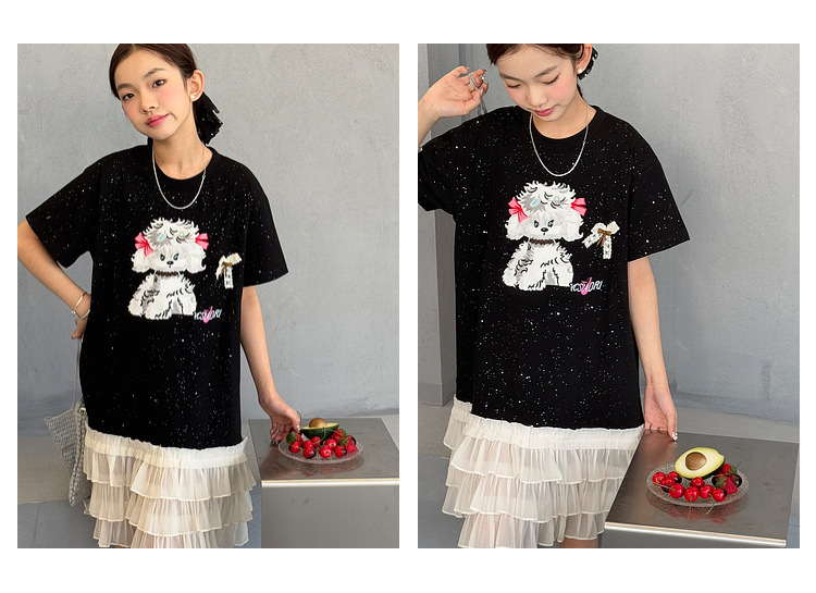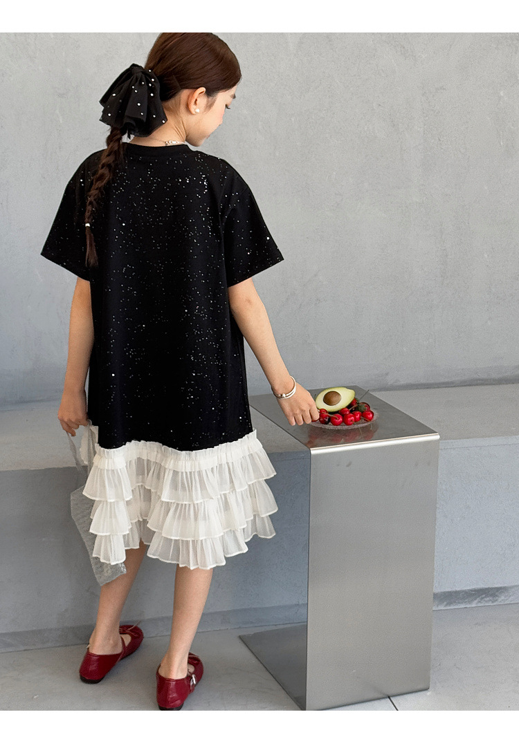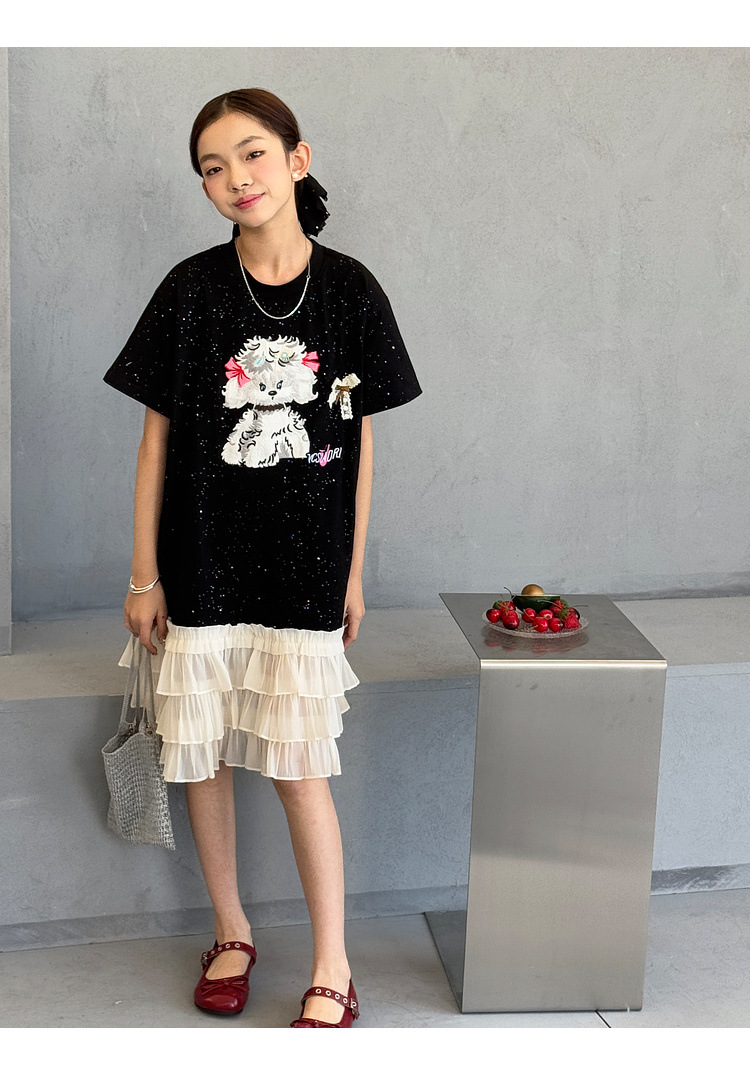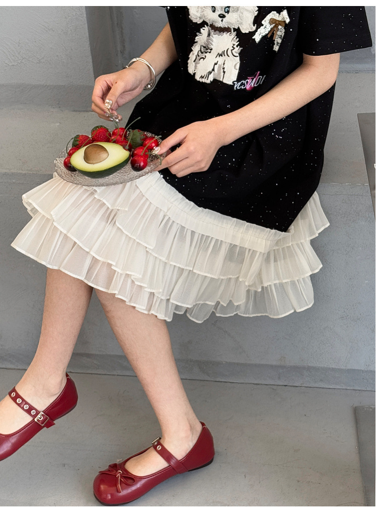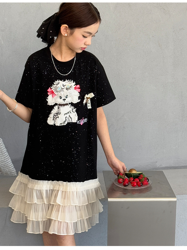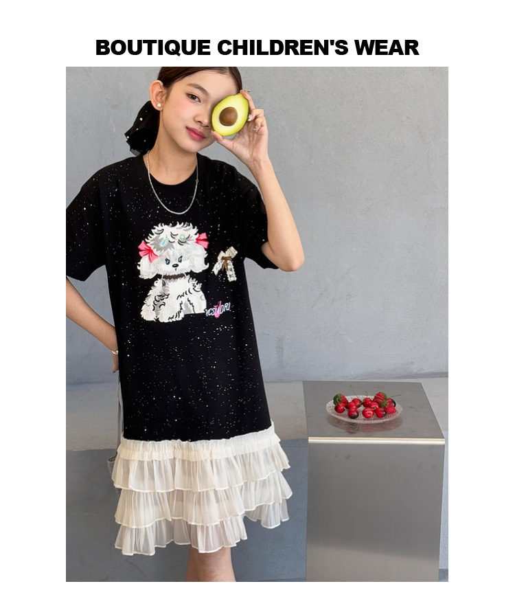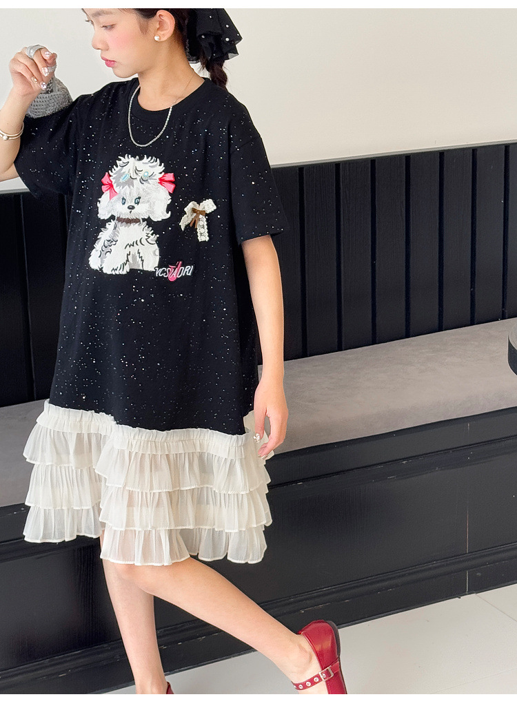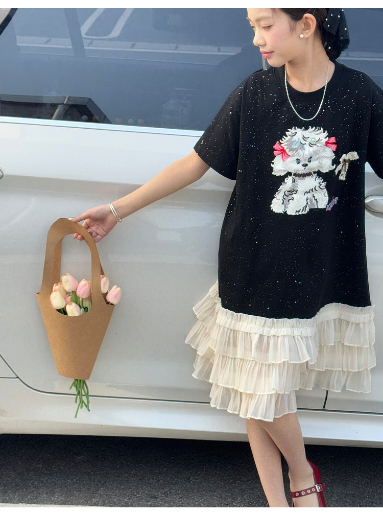 소녀 원피스 2025 여름 새로운 어린이 메쉬 스티칭 캐주얼 스커트 큰 어린이 만화 느슨한 티셔츠 스커트스토어 가기