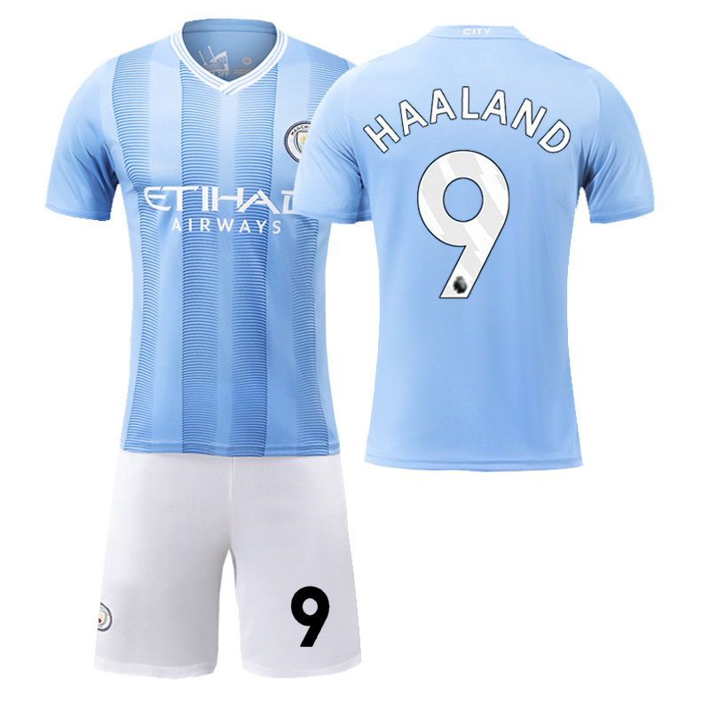 도매 24 새로운 맨체스터 시티 홈 맞춤형 축구 유니폼 세트 No. 9 Haaland No. 17 De Bruyne 저지