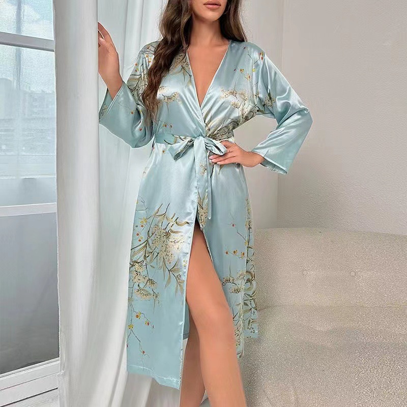 잠옷 여성 호텔 욕실 레이스 업 목욕 가운 여름 통기성 얇은 패션 체리 프린트 긴 소매 잠옷스토어 가기