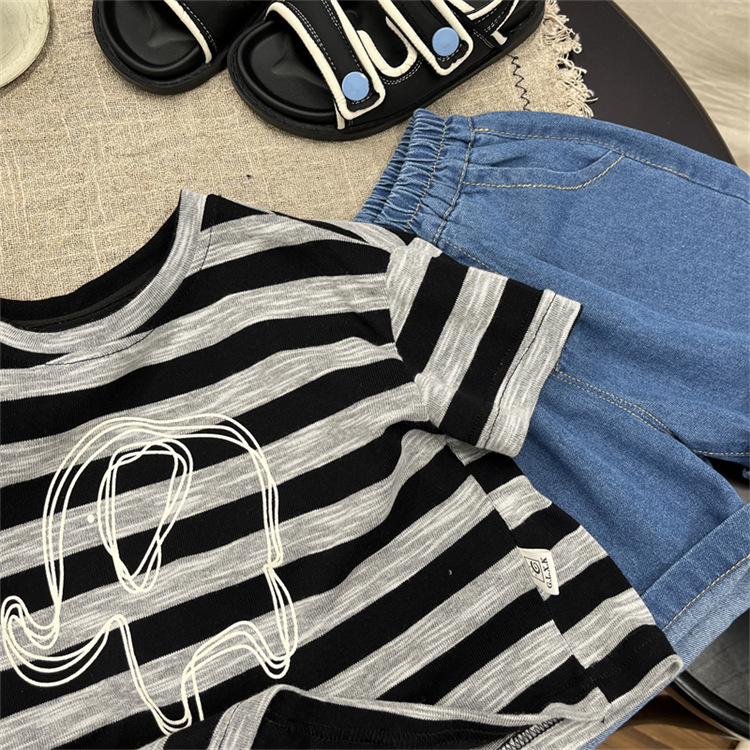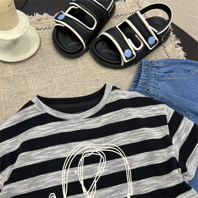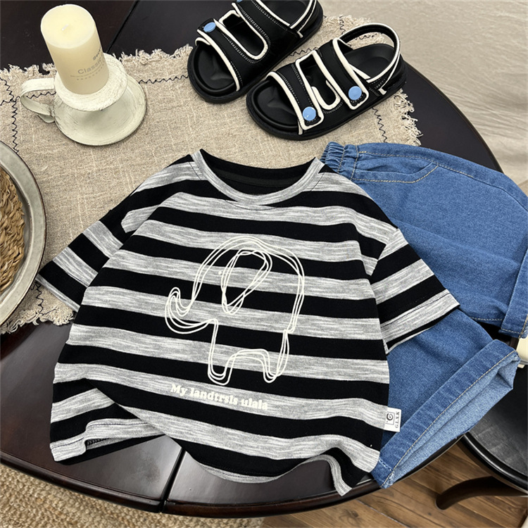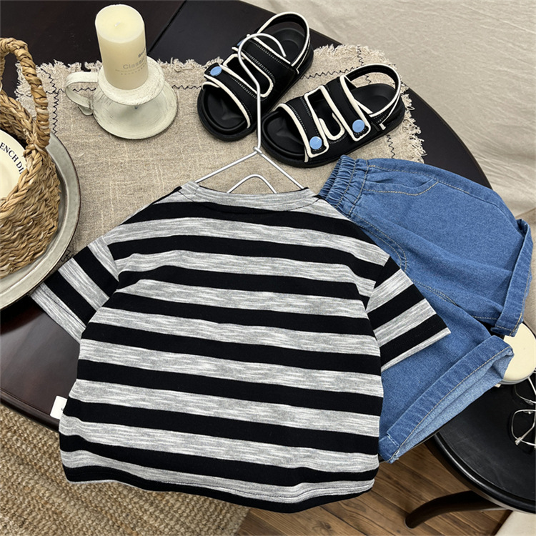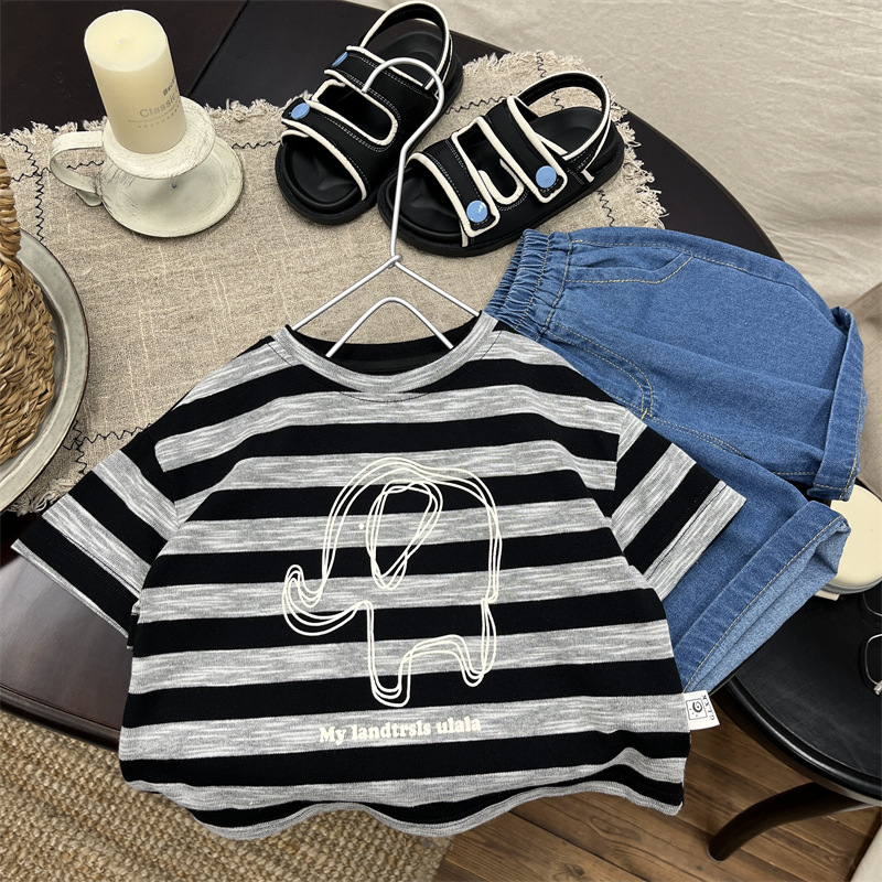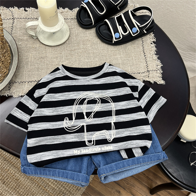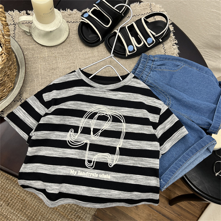 여름 소년 줄무늬 티셔츠 반소매 한국 어린이 새 루즈 탑 반소매 아동베이스 셔츠 여성용 티셔츠