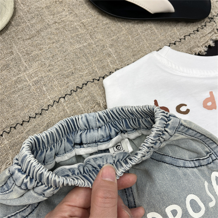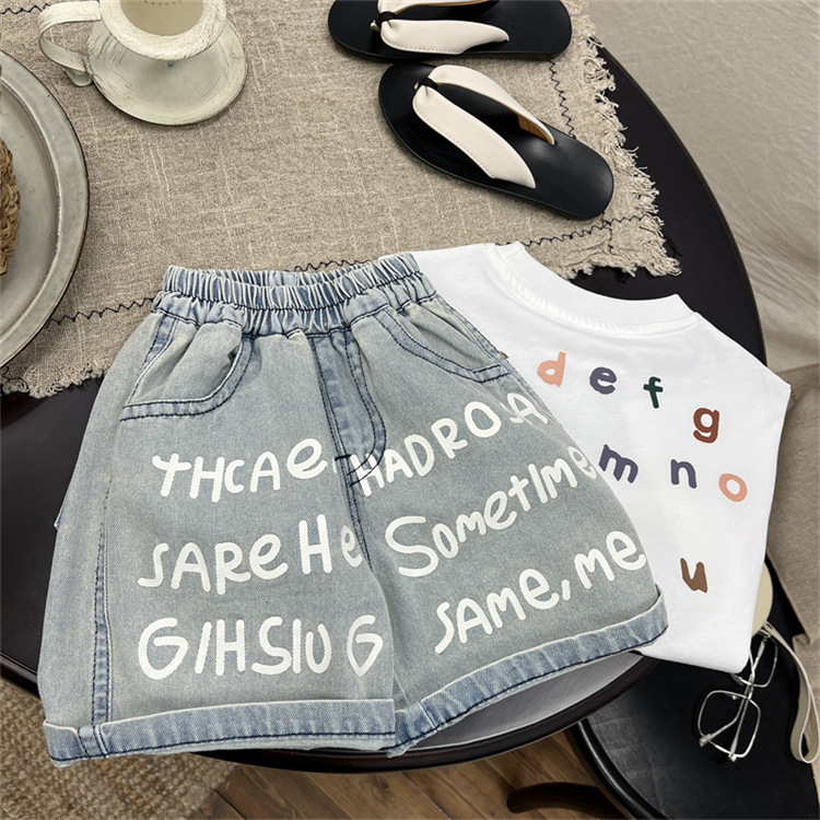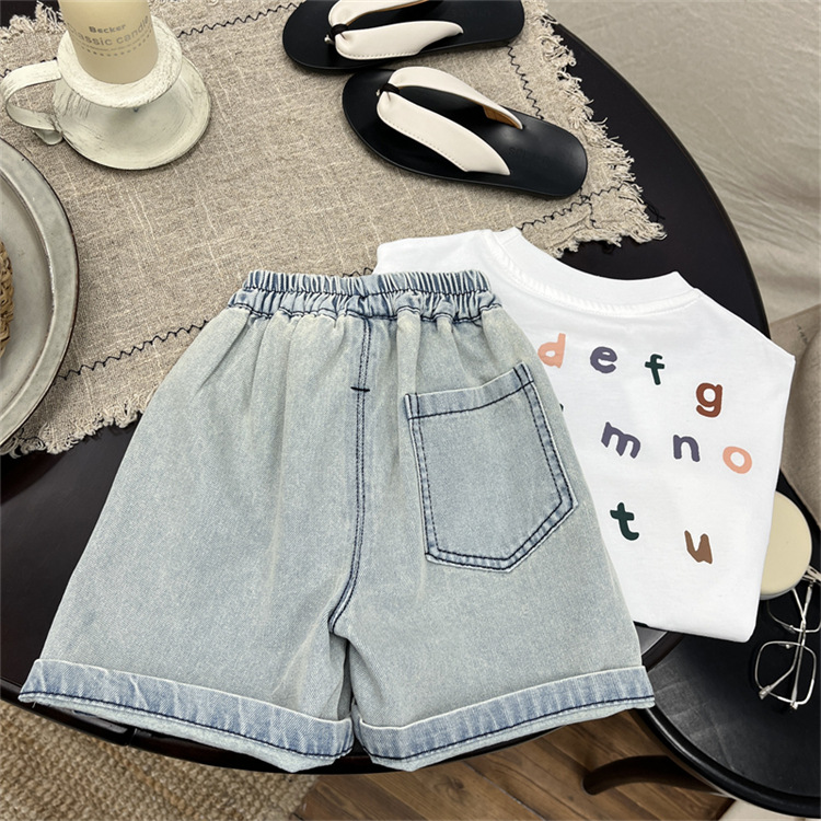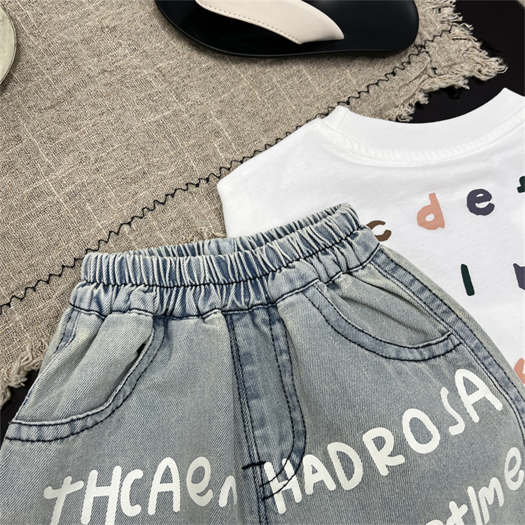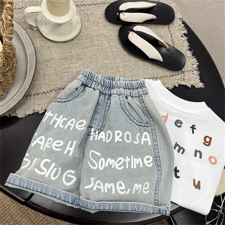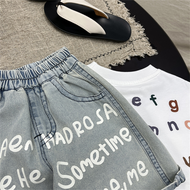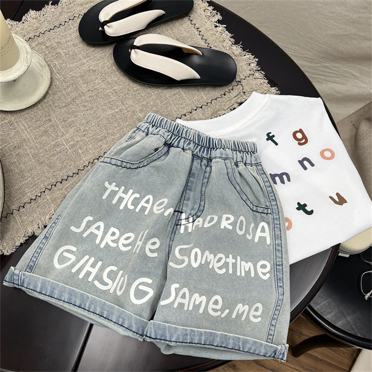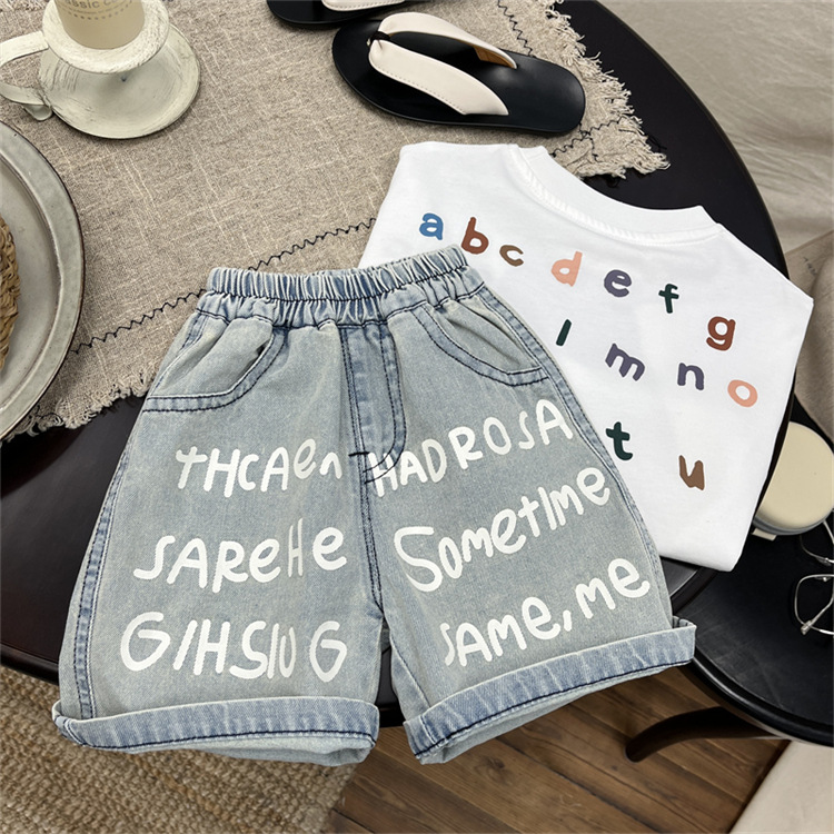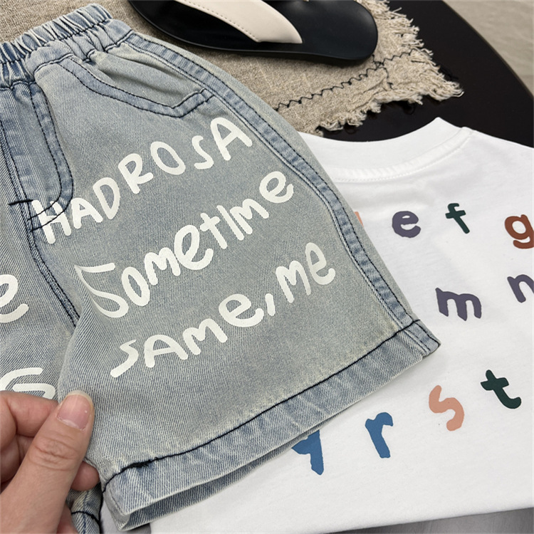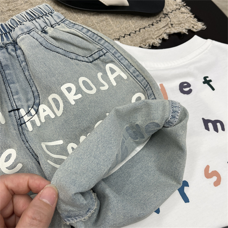남학생 바지 여름 어린이 청바지 한국 스타일 어린이 착용 여름 아기 인쇄 편지 반바지 유행 어린이 바지 여름 착용