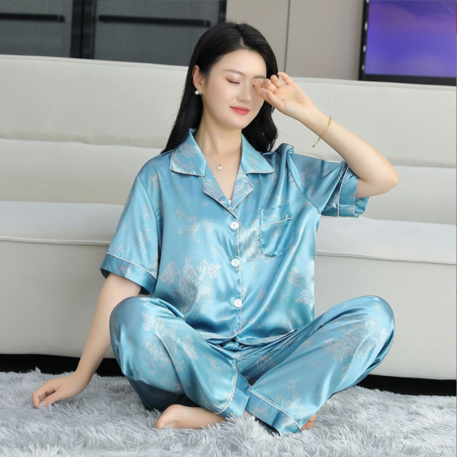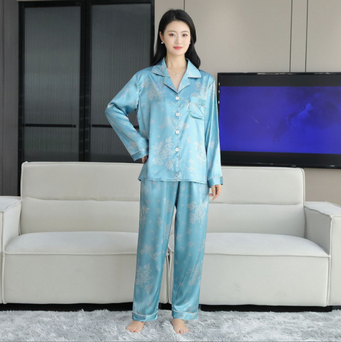 여름 얇은 얼음 실크 파자마 여성의 봄 실크 긴팔 바지 투피스 의상 홈 옷 여성의 하이 엔드 감각