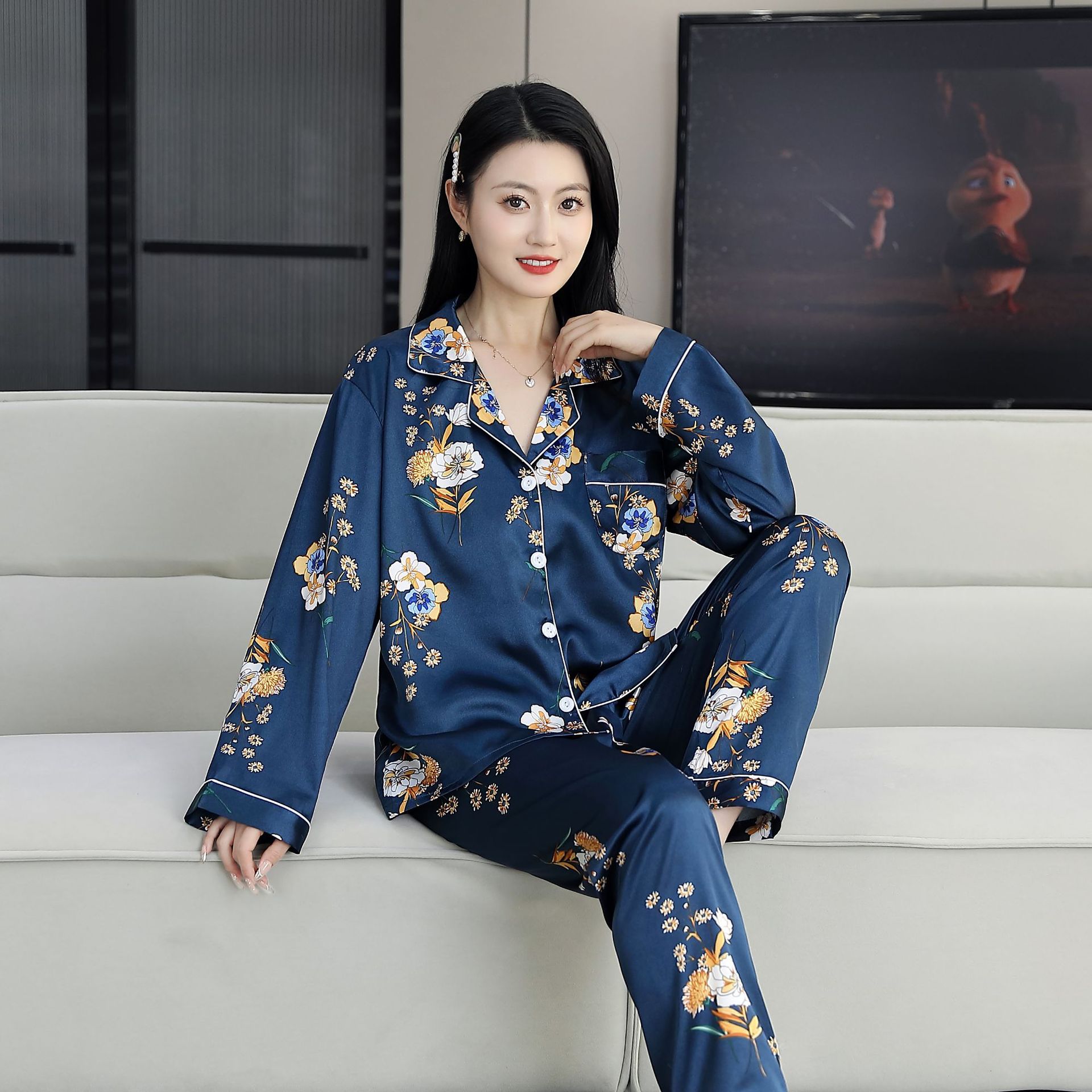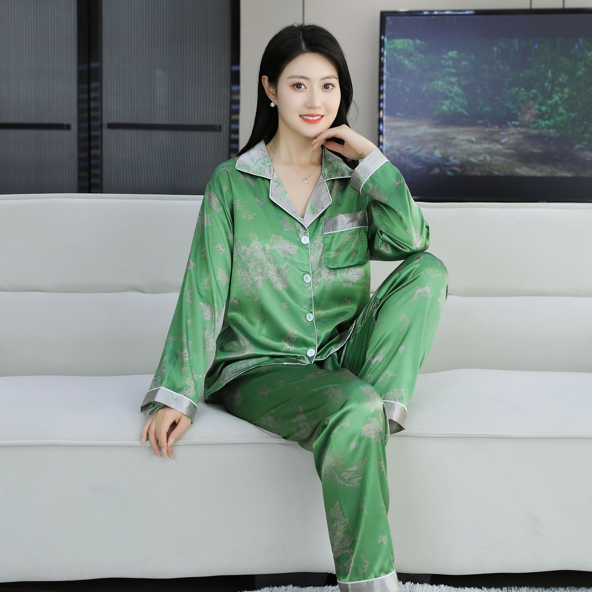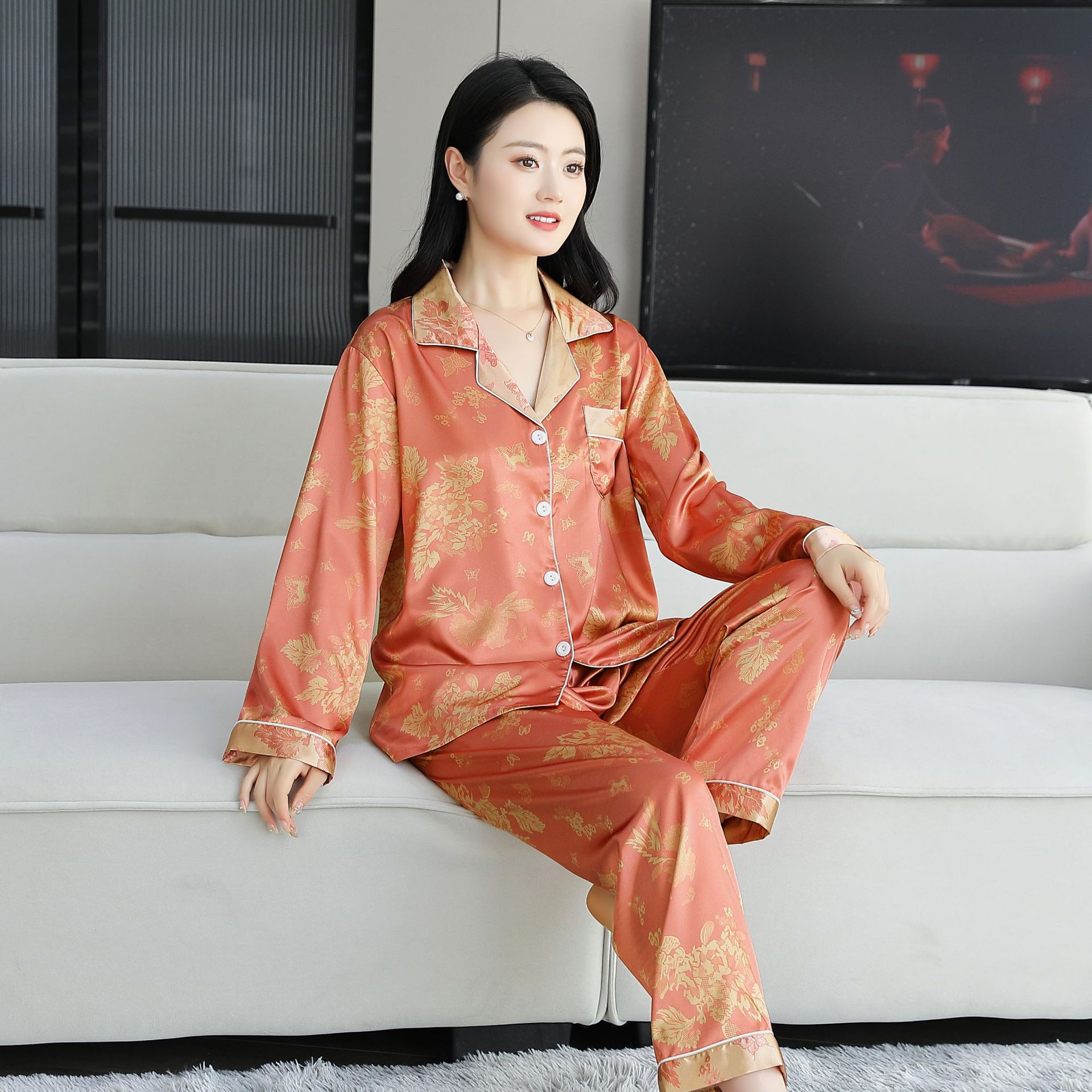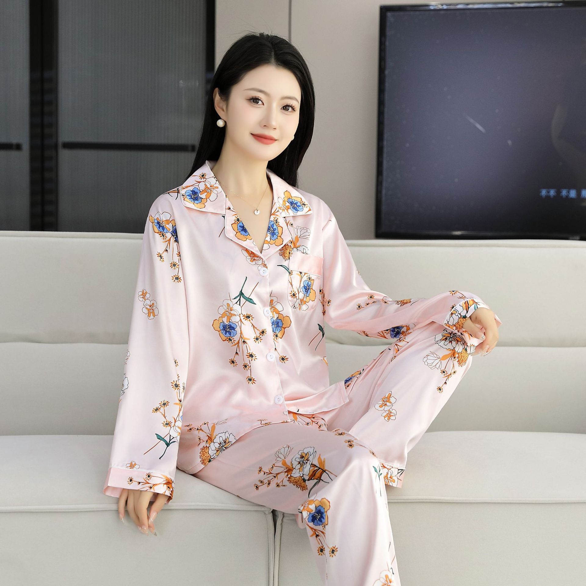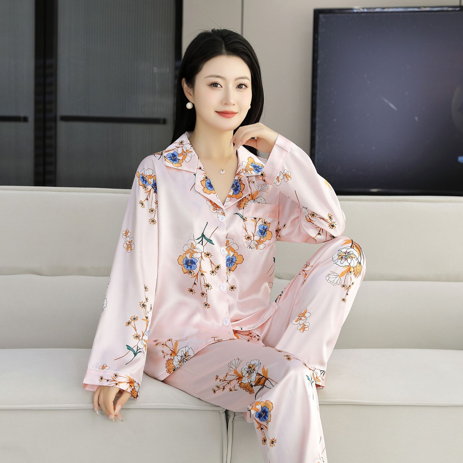 여름 얇은 얼음 실크 파자마 여성의 봄 실크 긴팔 바지 투피스 의상 홈 옷 여성의 하이 엔드 감각스토어 가기