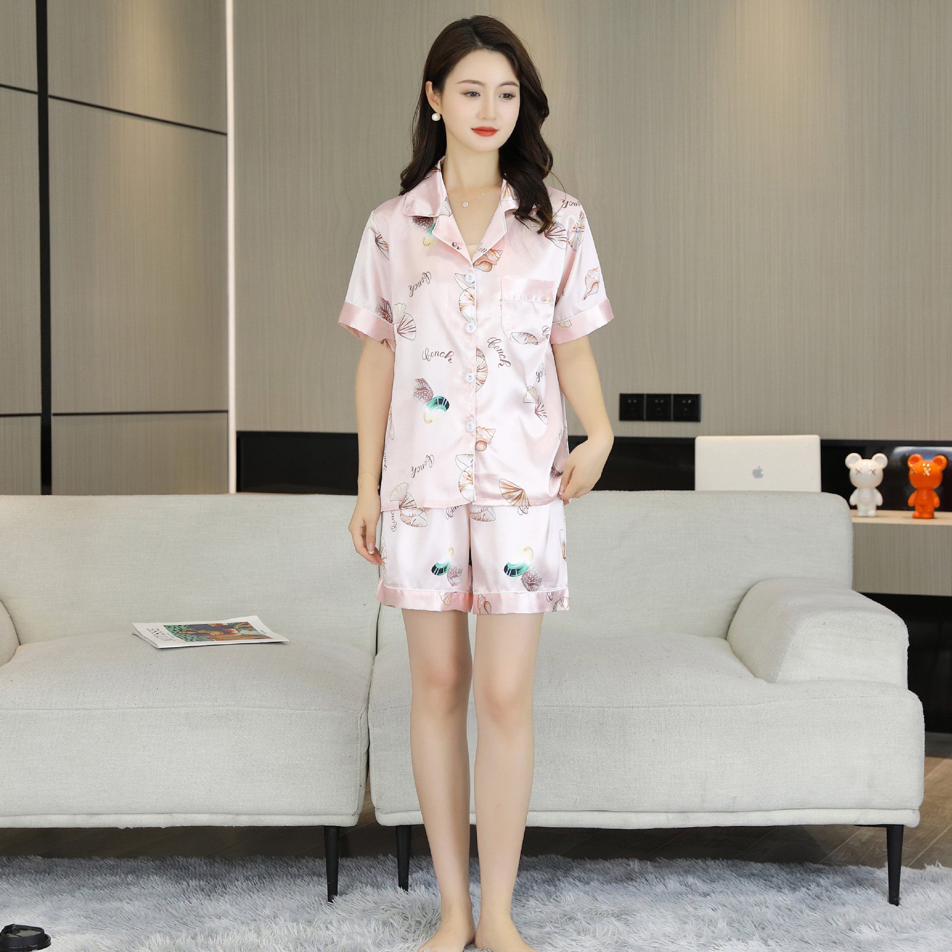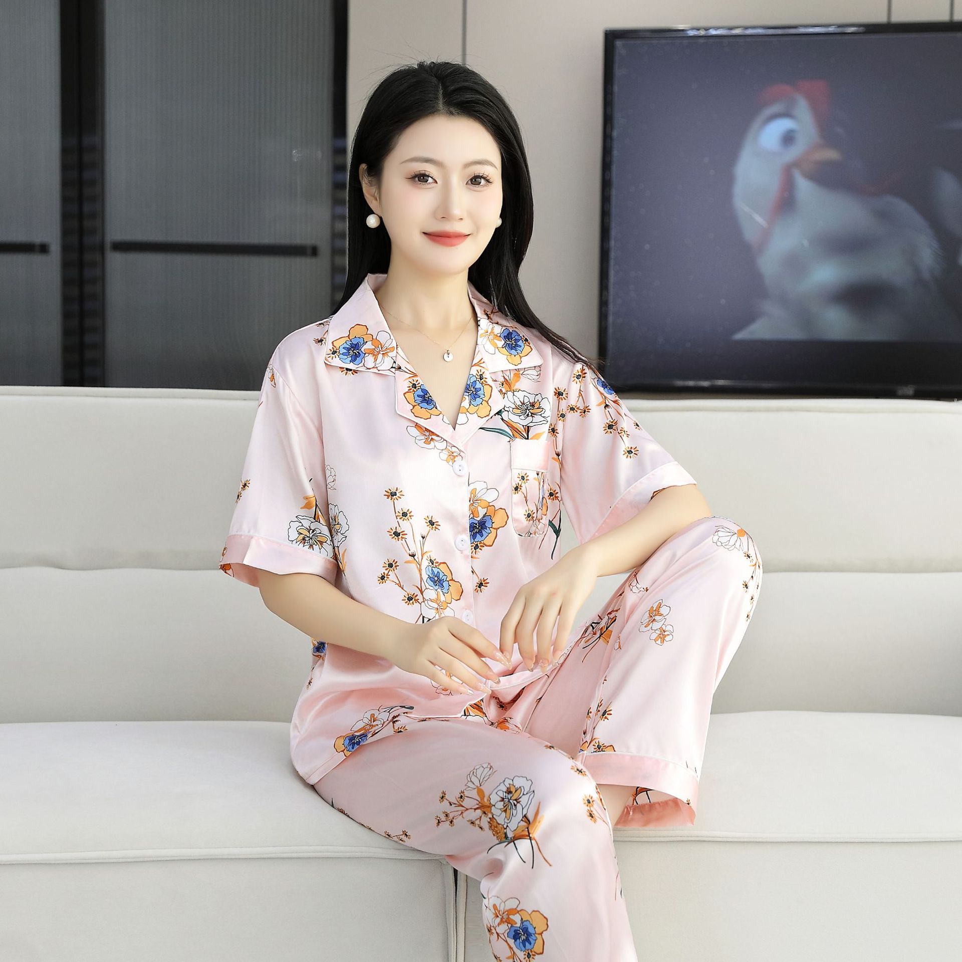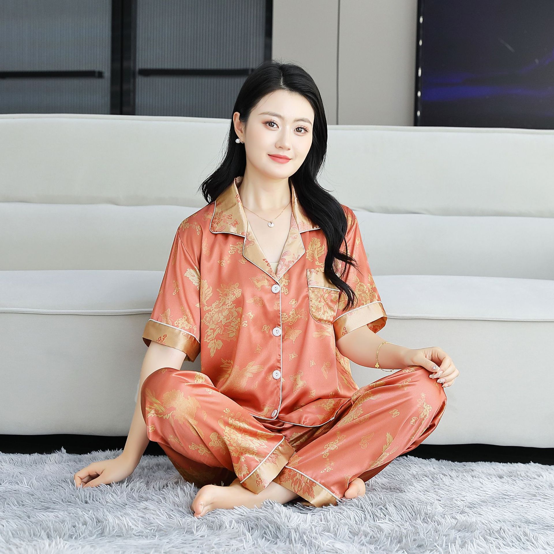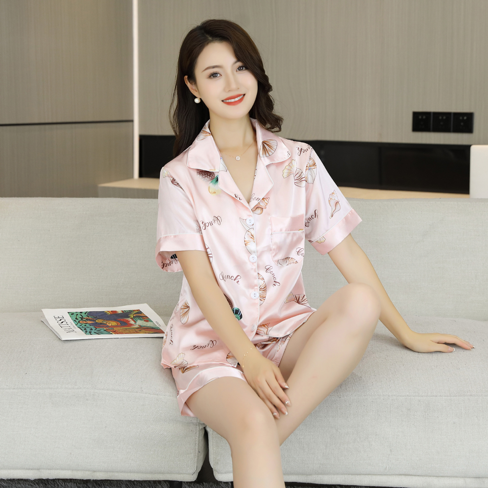 여름 얇은 얼음 실크 파자마 여성의 봄 실크 긴팔 바지 투피스 의상 홈 옷 여성의 하이 엔드 감각스토어 가기