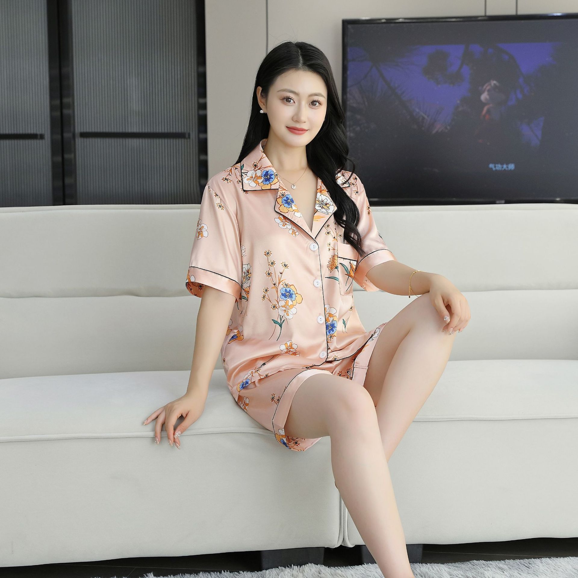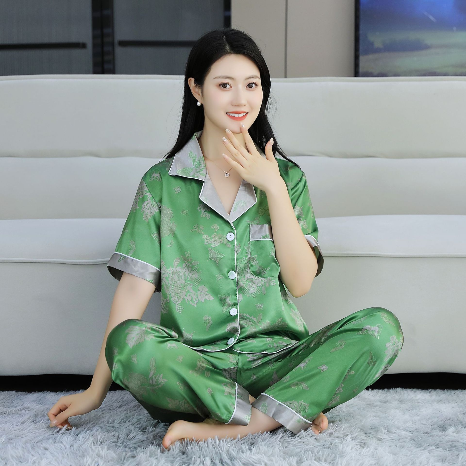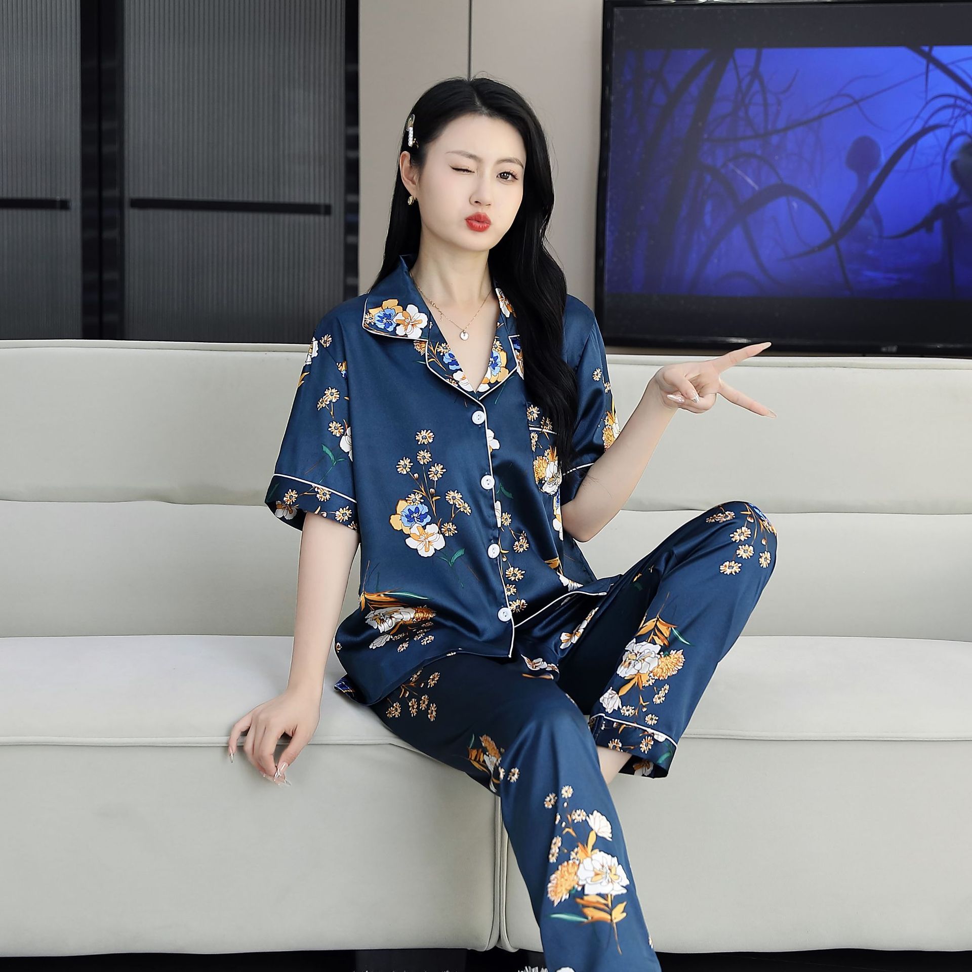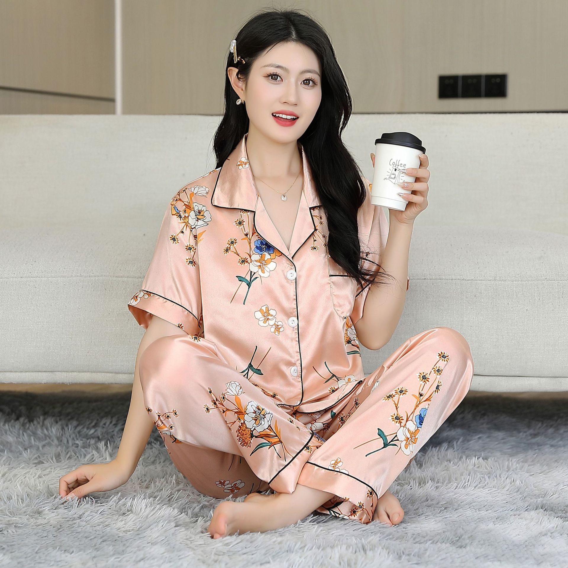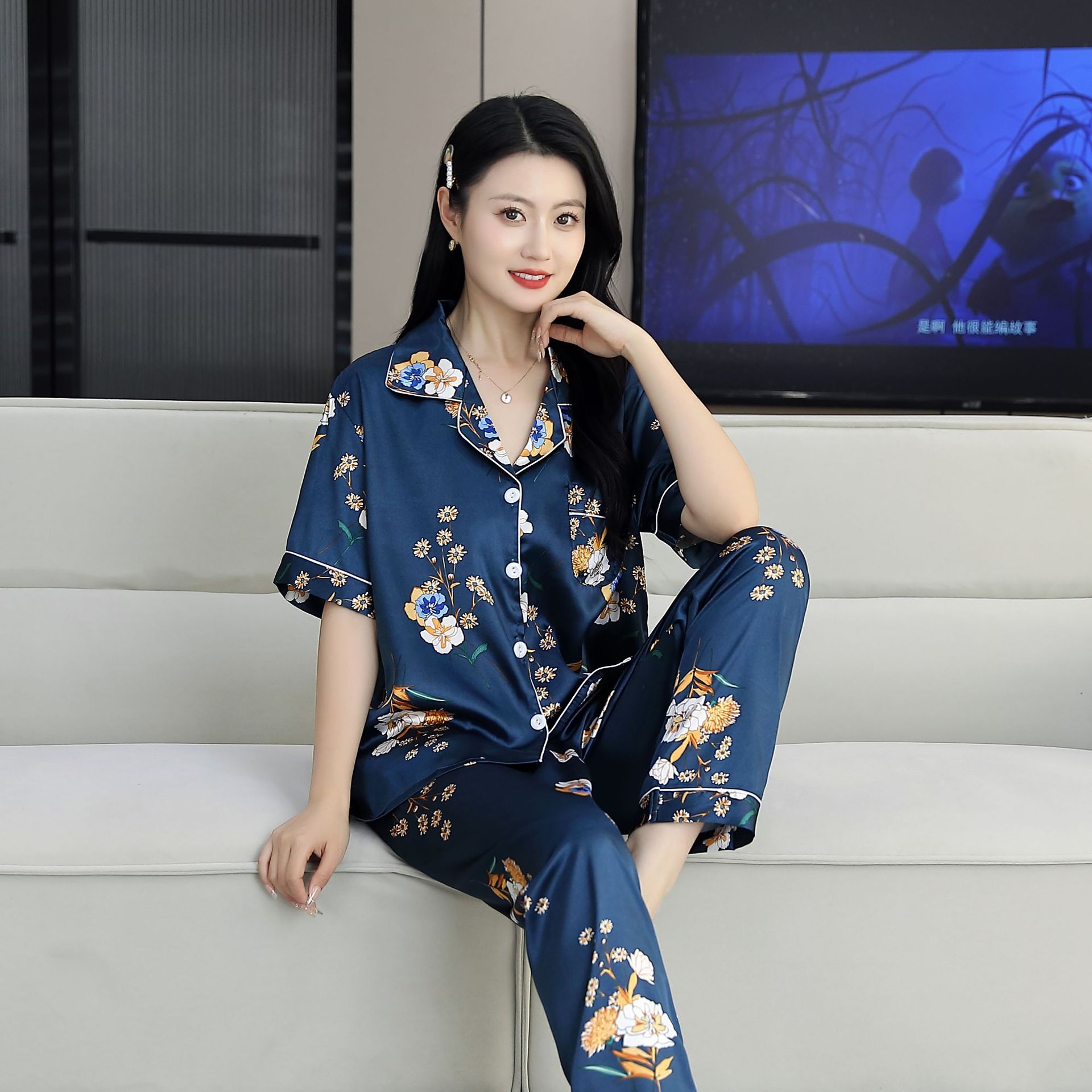 여름 얇은 얼음 실크 파자마 여성의 봄 실크 긴팔 바지 투피스 의상 홈 옷 여성의 하이 엔드 감각스토어 가기