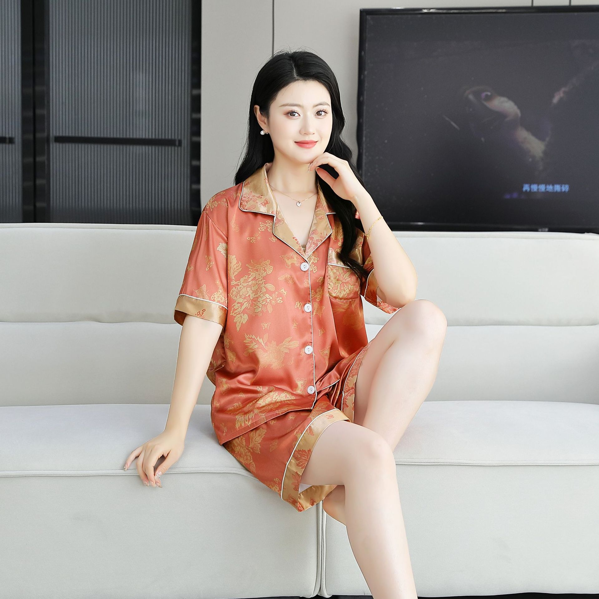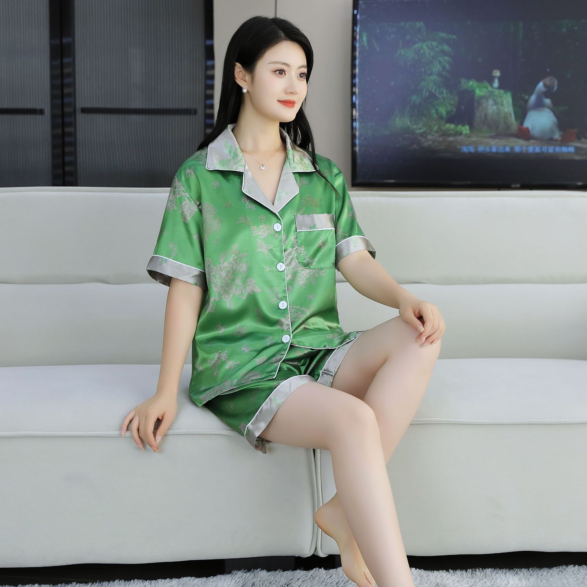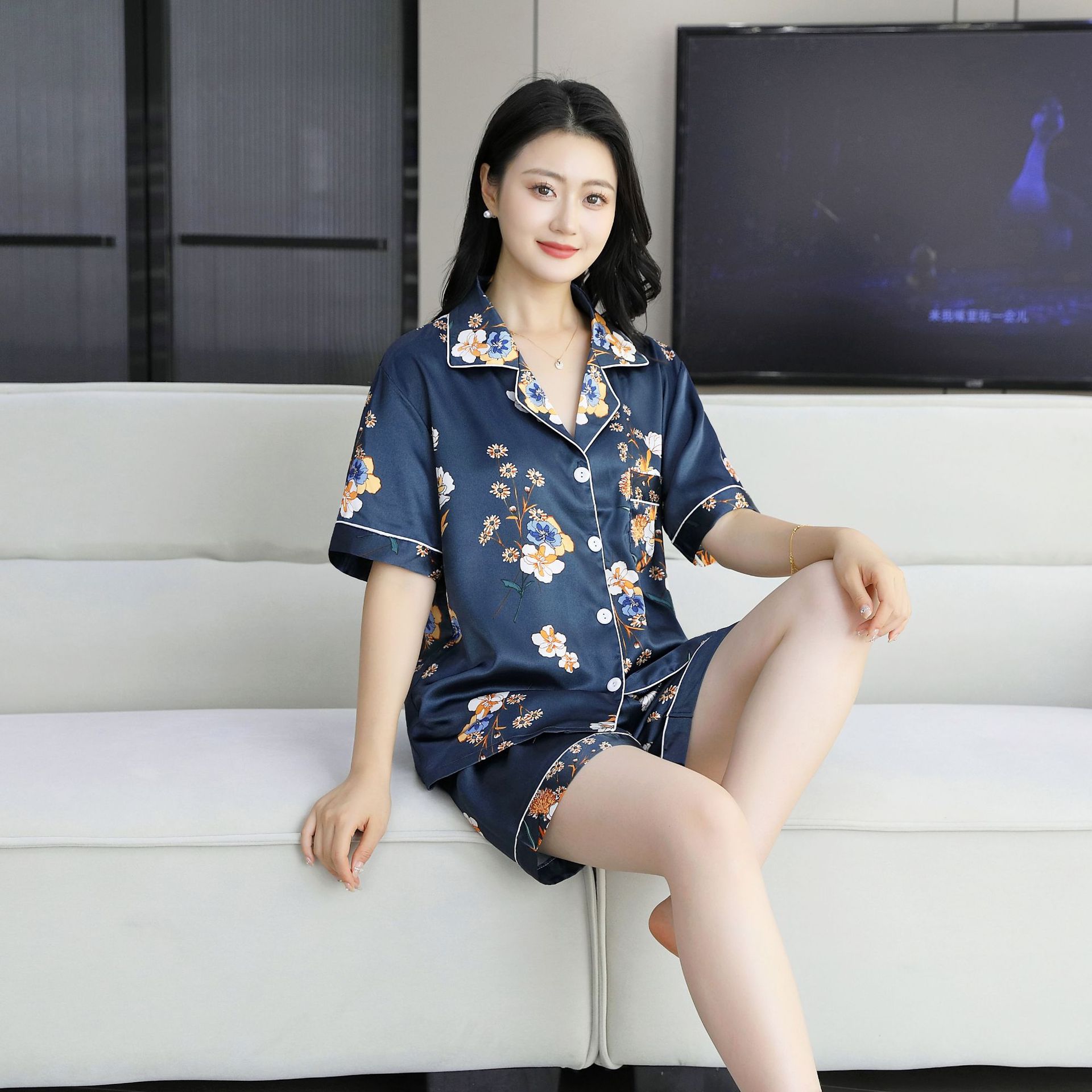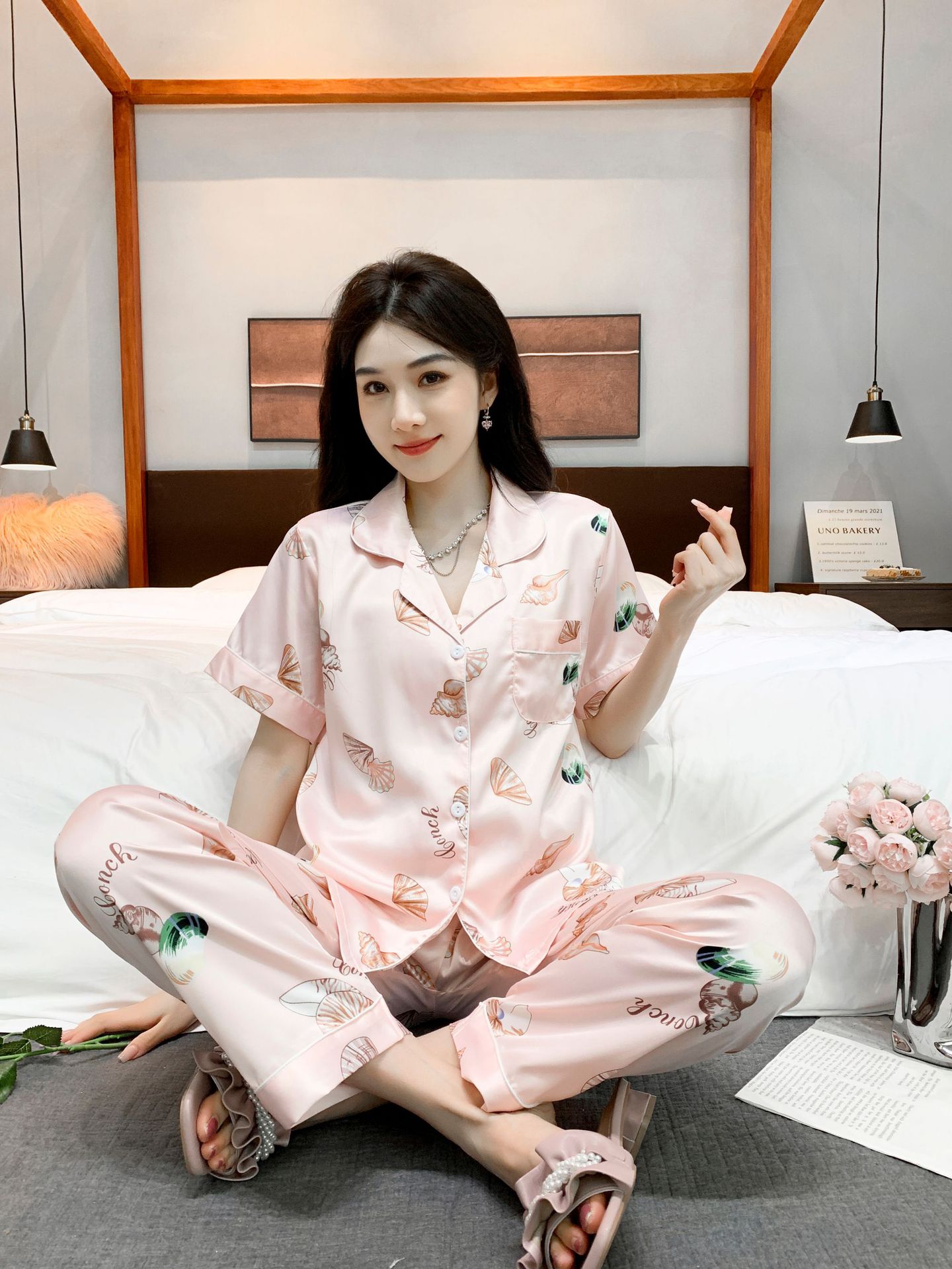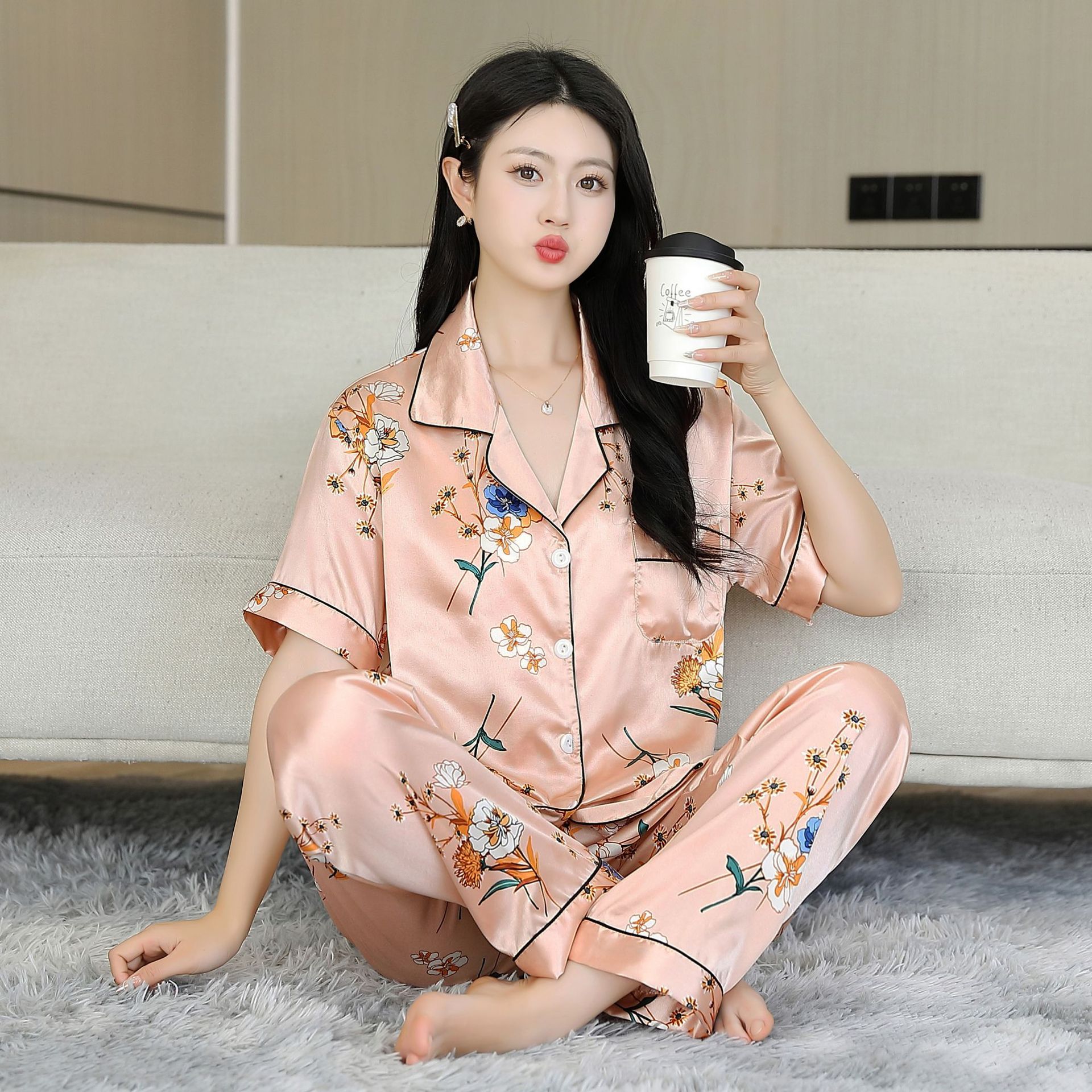 여름 얇은 얼음 실크 파자마 여성의 봄 실크 긴팔 바지 투피스 의상 홈 옷 여성의 하이 엔드 감각스토어 가기