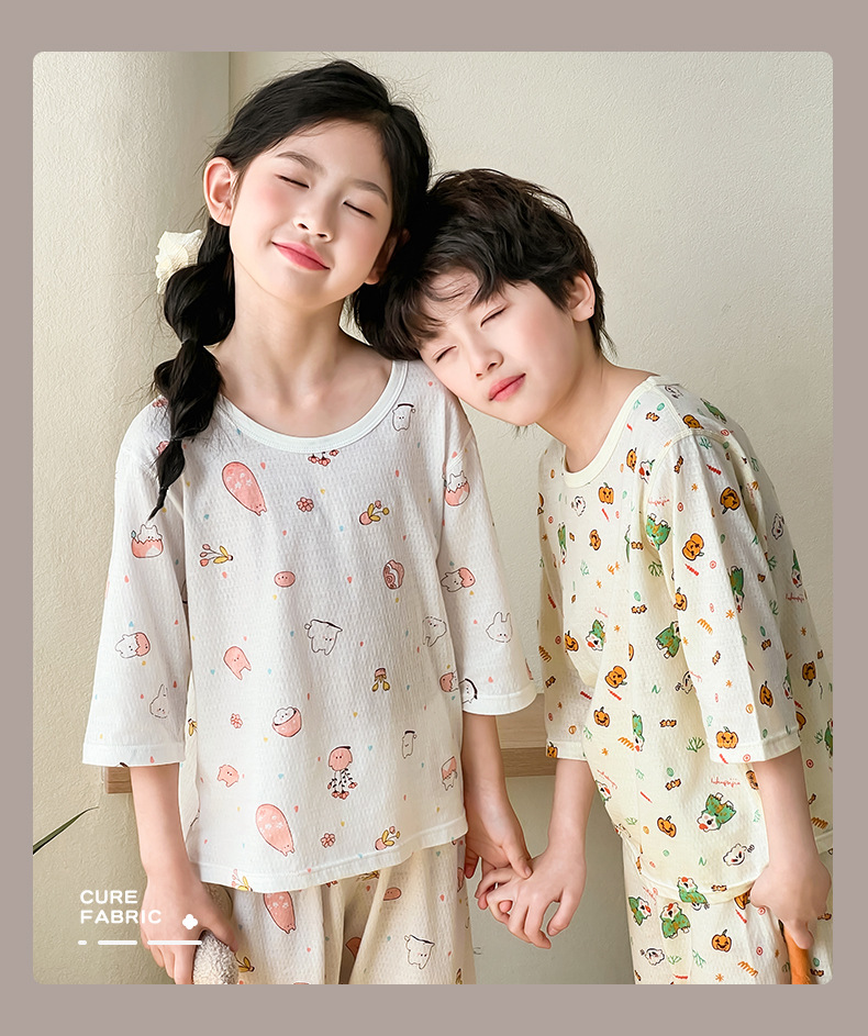 아동용 잠옷 세트, 얇은 에어컨 의류, 남아 및 여아 가정복, 중대형 아동용 여름 순면 7부 소매스토어 가기