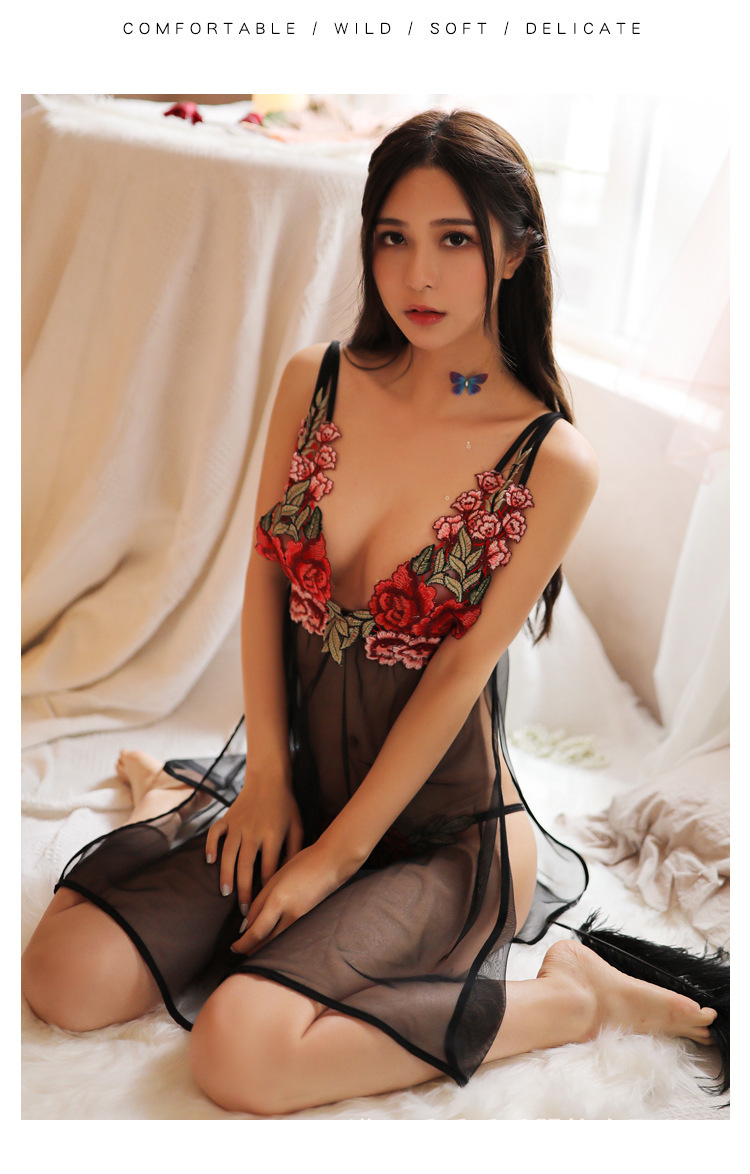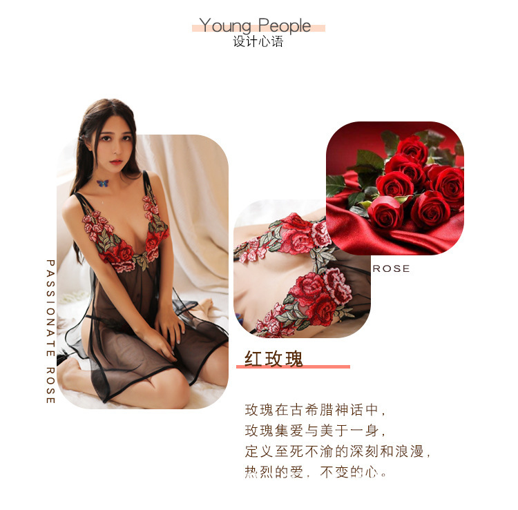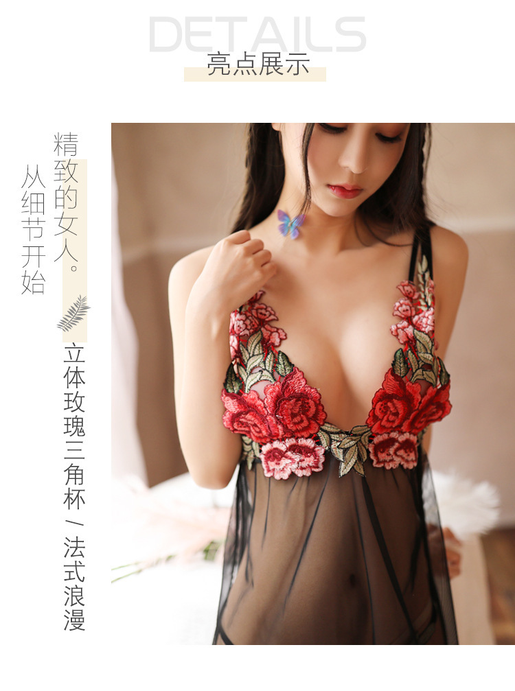 유럽과 미국 성인 섹시한 속옷 슬링 스플릿 나이트 드레스 로즈 자수 레이스 메쉬 유혹 섹시한 파자마 1011스토어 가기
