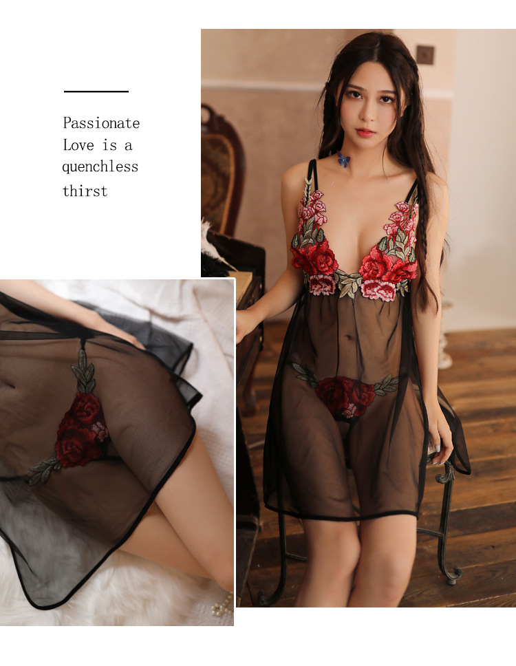 유럽과 미국 성인 섹시한 속옷 슬링 스플릿 나이트 드레스 로즈 자수 레이스 메쉬 유혹 섹시한 파자마 1011