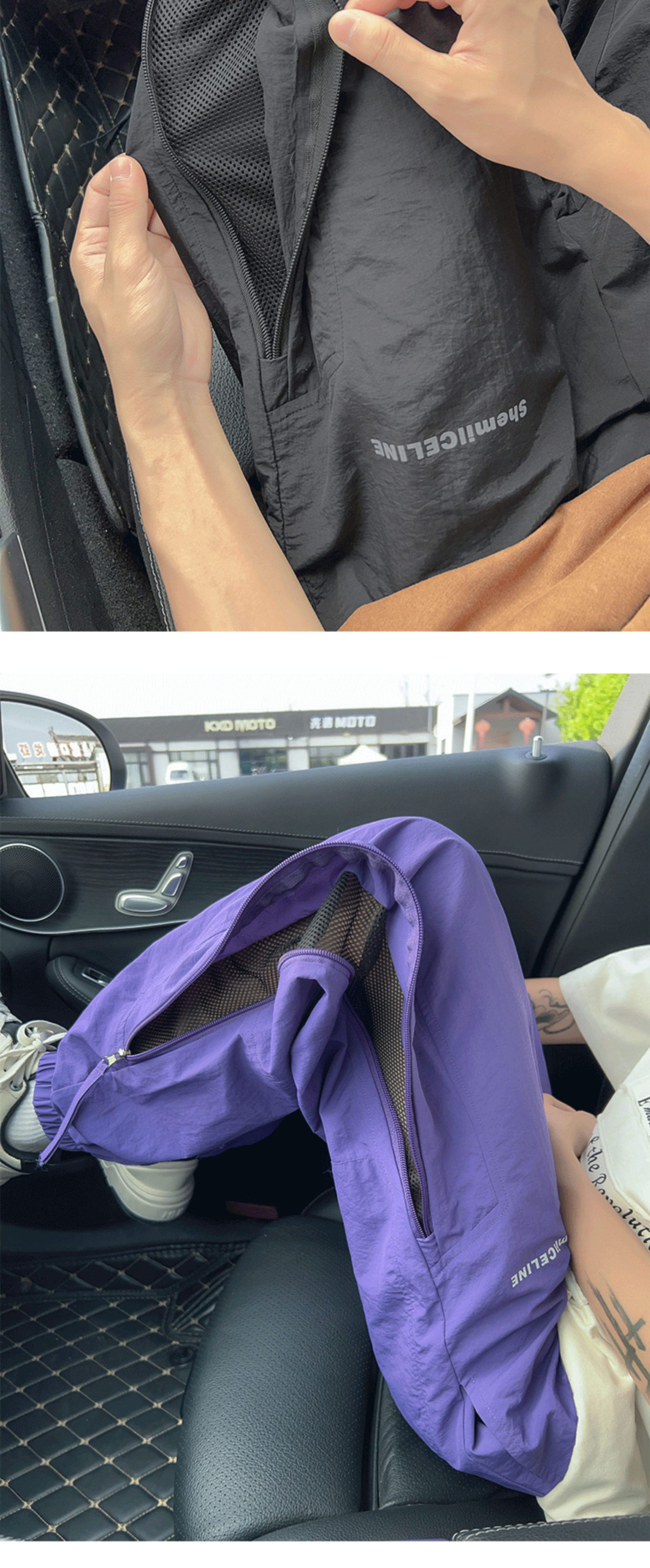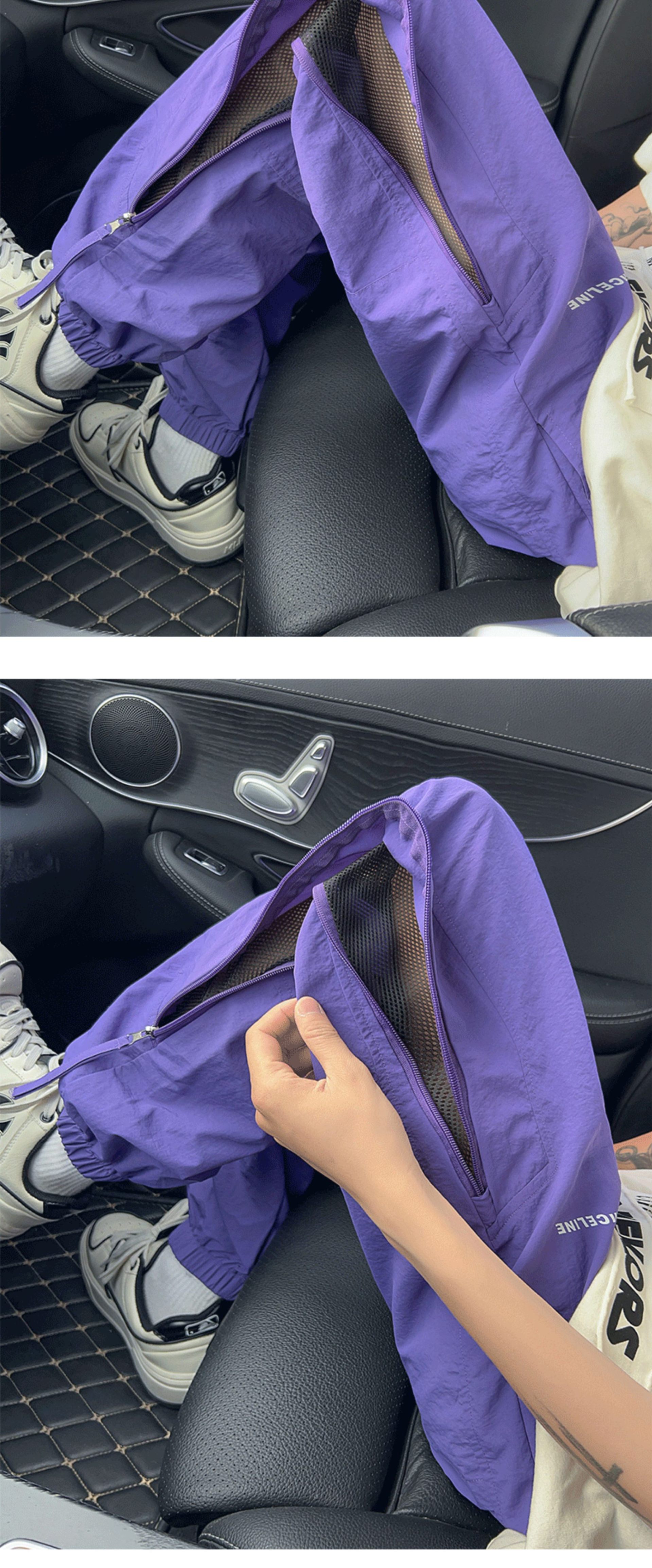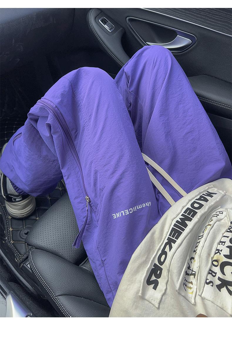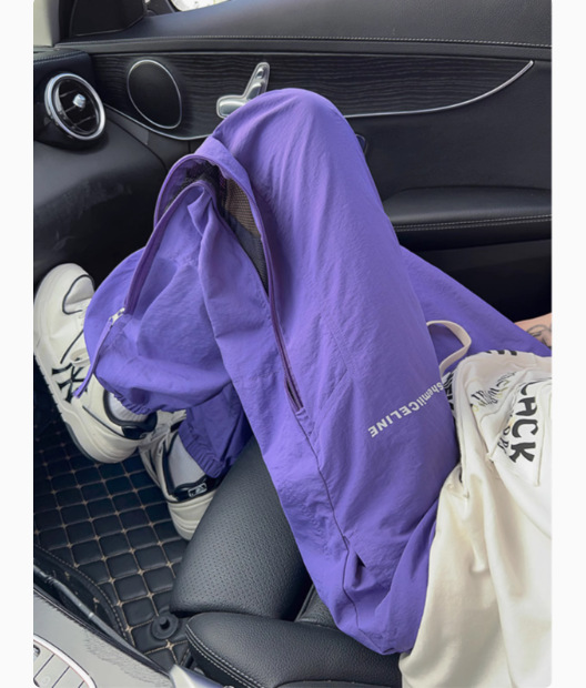 아메리칸 에어바운스 플리츠 팬츠 남성 여름 얇은 속건성 충전 바지 스트레이트 루즈 캐주얼 바지 트렌디 지퍼 퍼플