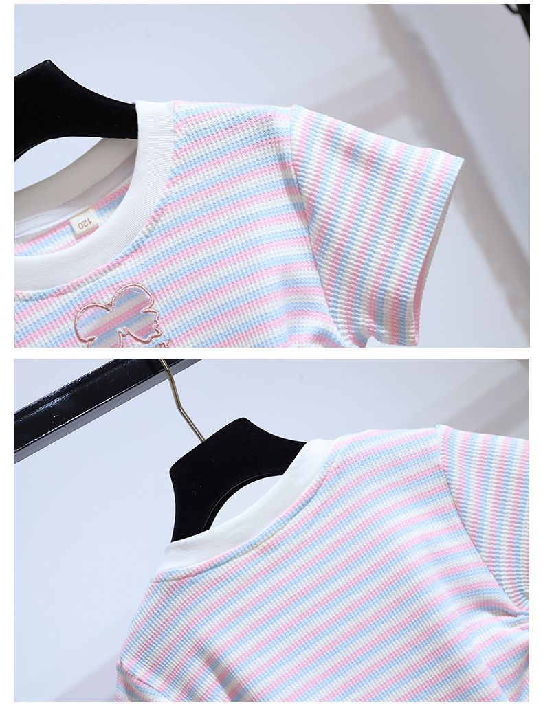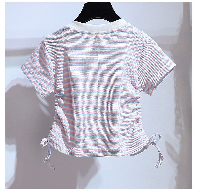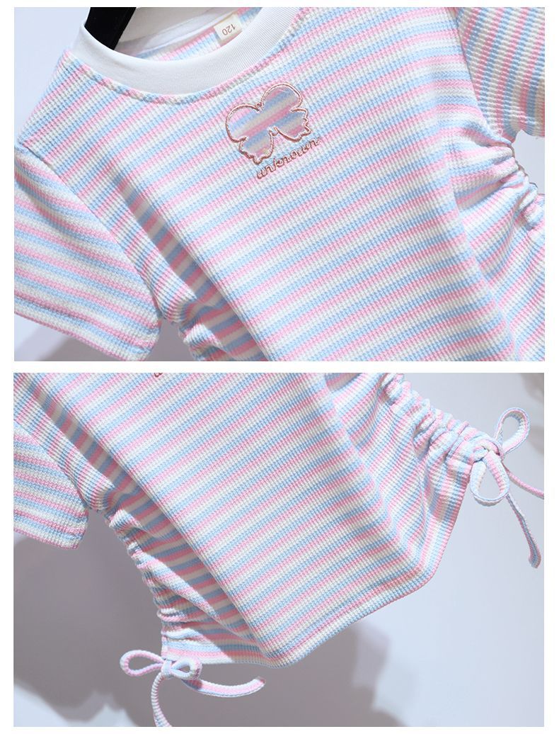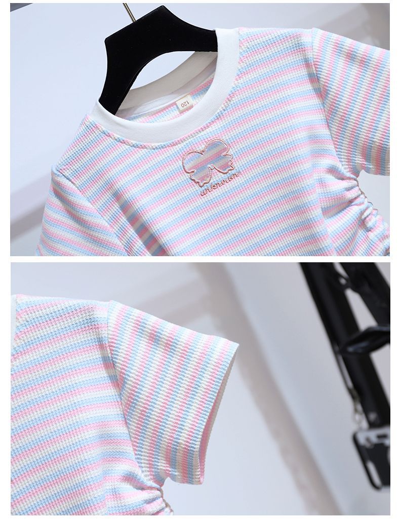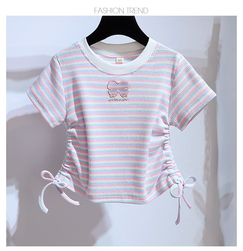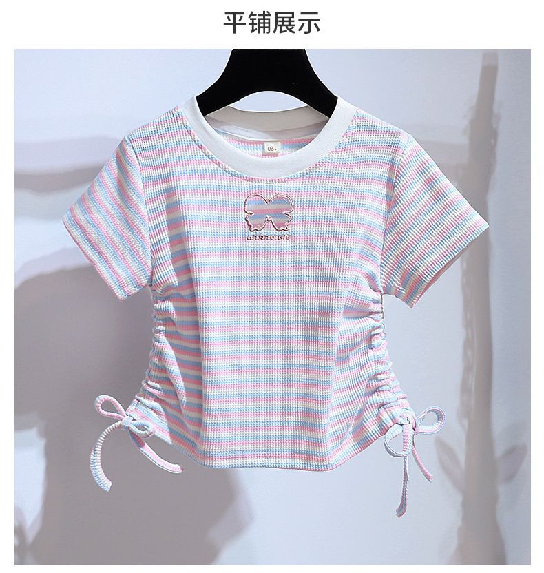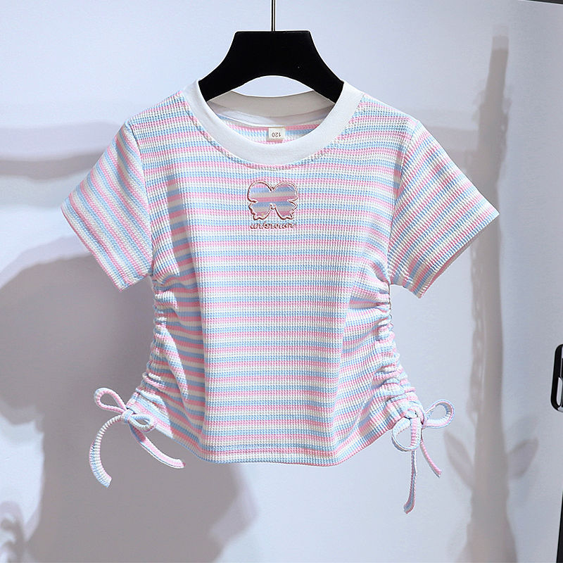 여자 반소매 티셔츠 여름 새 어린이 쇼트 탑 얇은 서양식 중대형 어린이 줄무늬 반소매 끈 티셔츠
