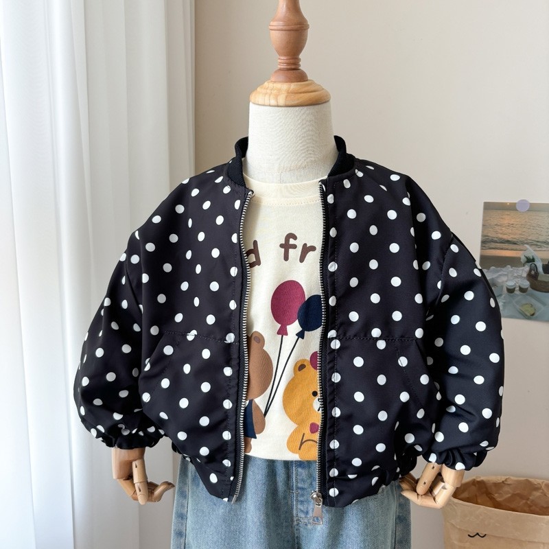 새로운 스타일의 여아 코트, 세련된 도트무늬 한국식 루즈한 퍼프 슬리브, 패셔너블한 봄, 가을 재킷, 재고 있음, 빠른 배송스토어 가기