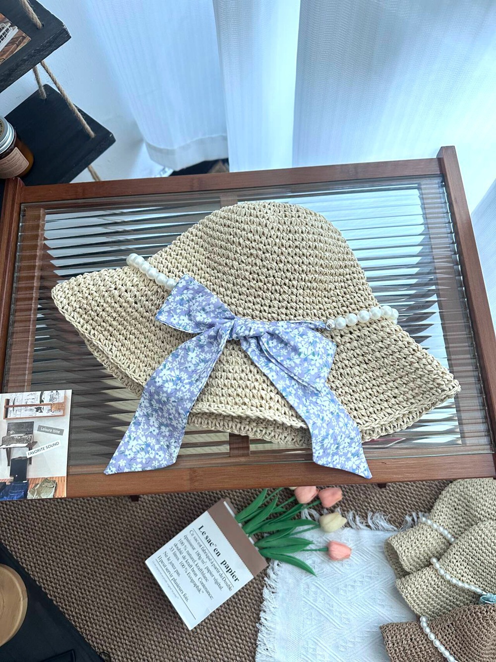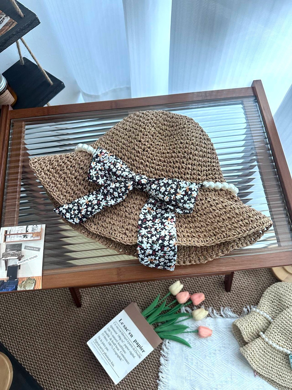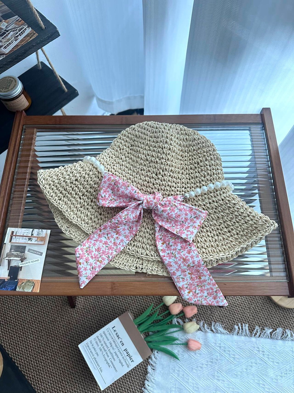 • 진주 분지 모자 - 핑크 꽃무늬 리본