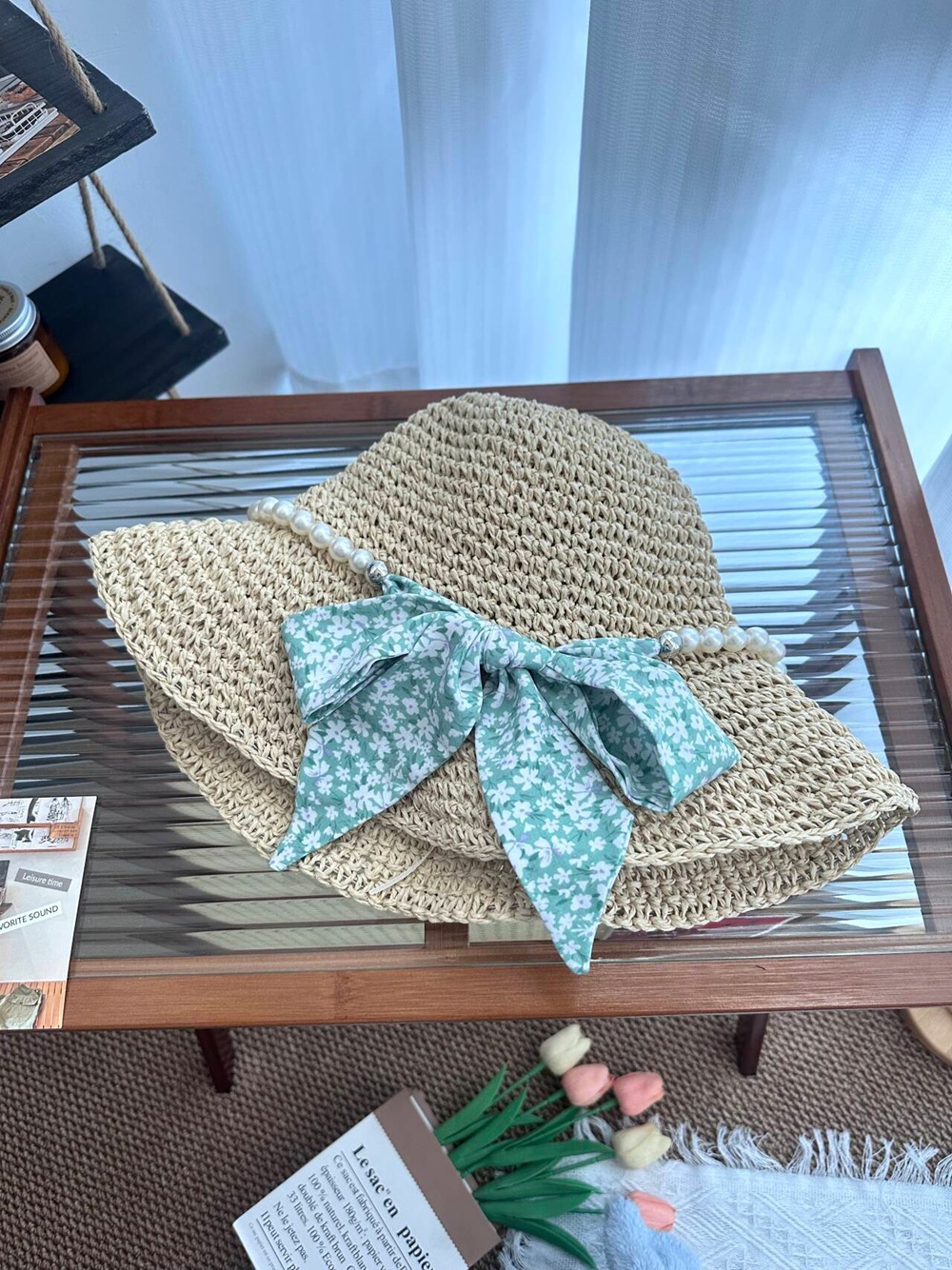 • 진주 분지 모자 - 녹색 꽃무늬 리본