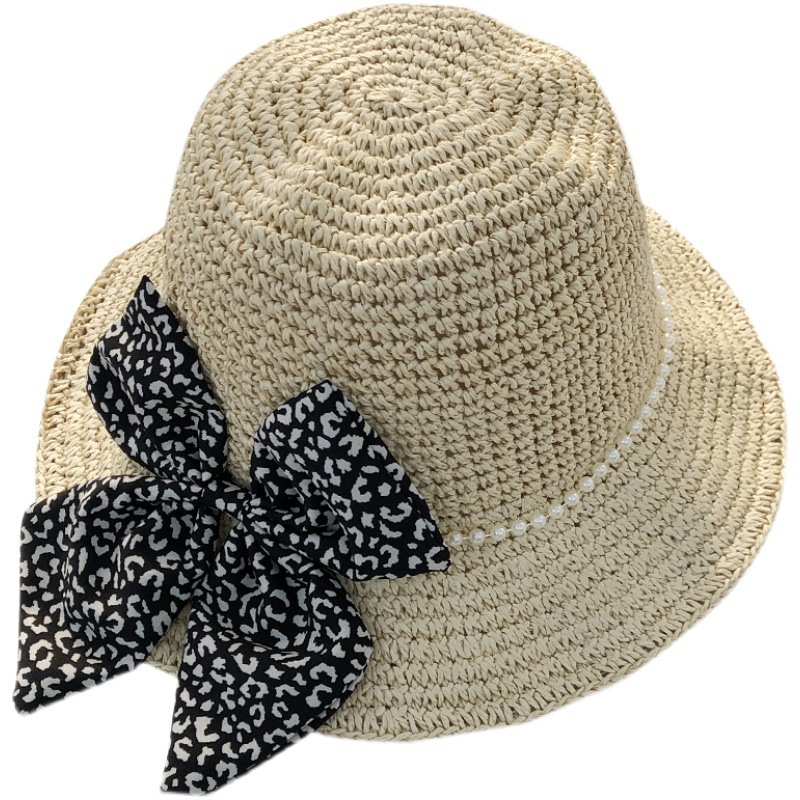 • 펄 세면대 모자 - 레오파드 프린트 보우 베이지