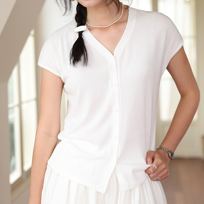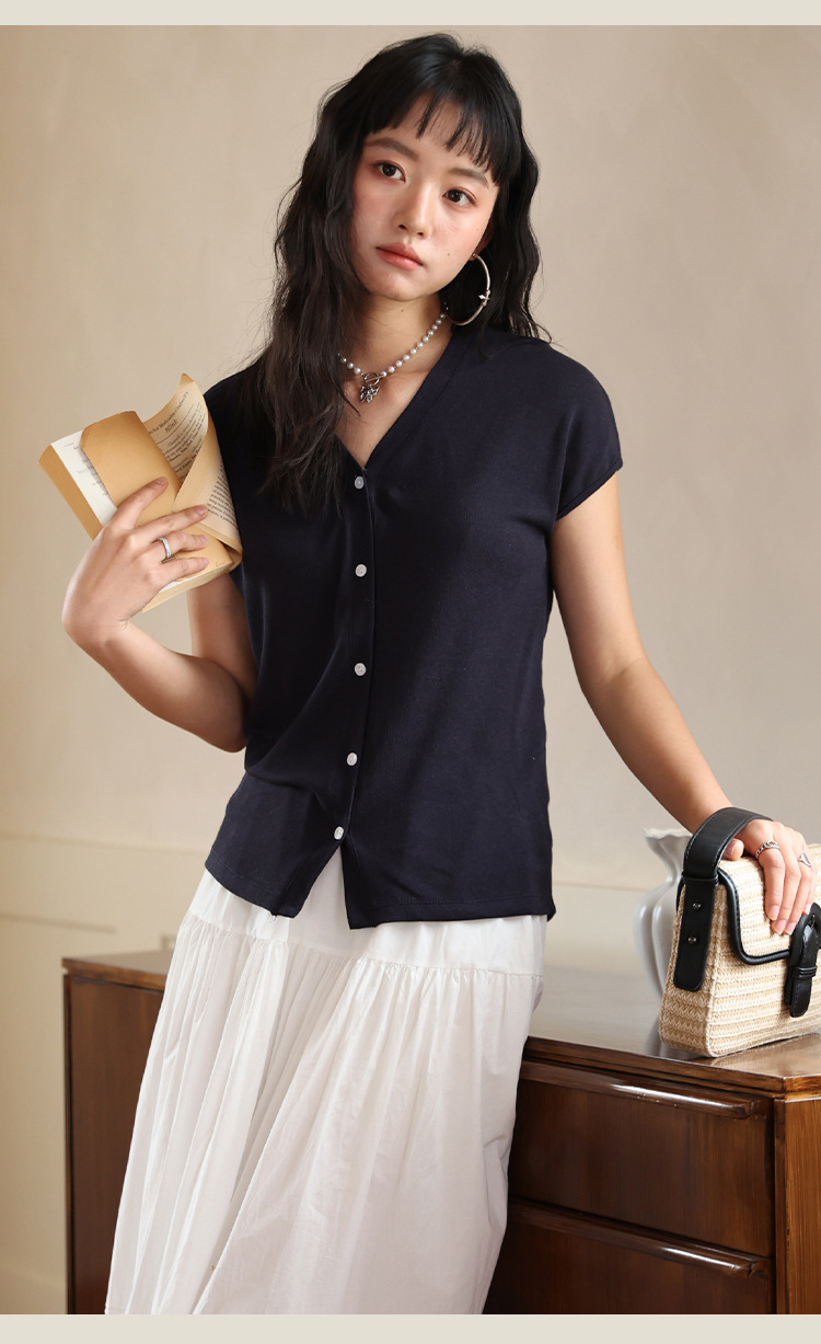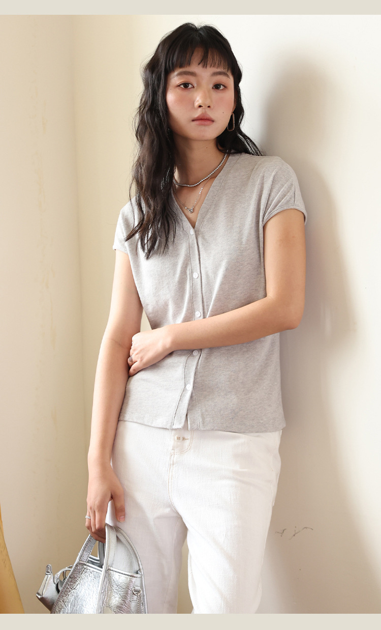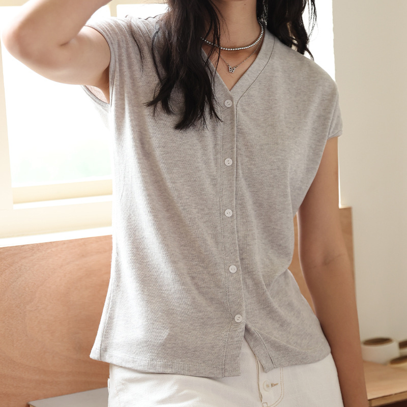봄과 여름 텐셀 라이오셀베이스 셔츠 여자 2025 새로운 V 넥 리넨 티셔츠 피부 친화적 인 버튼 카디건 반소매 탑