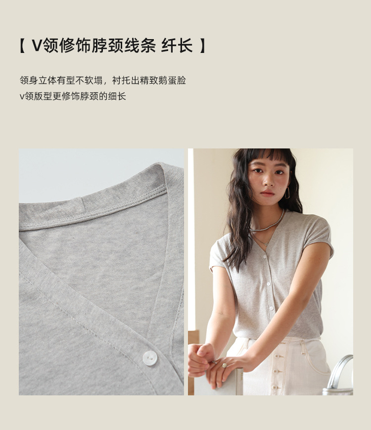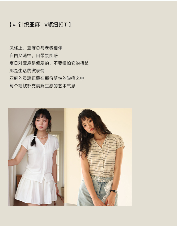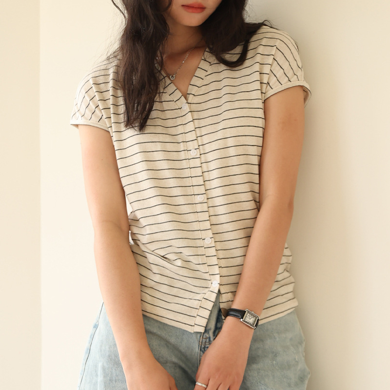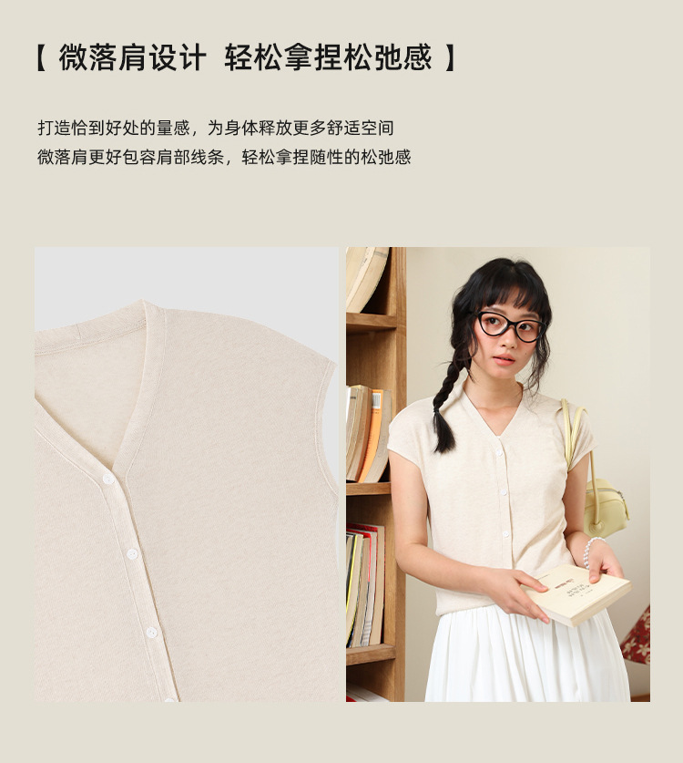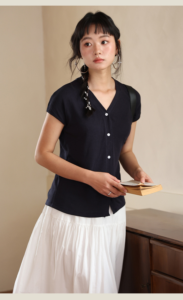 봄과 여름 텐셀 라이오셀베이스 셔츠 여자 2025 새로운 V 넥 리넨 티셔츠 피부 친화적 인 버튼 카디건 반소매 탑스토어 가기