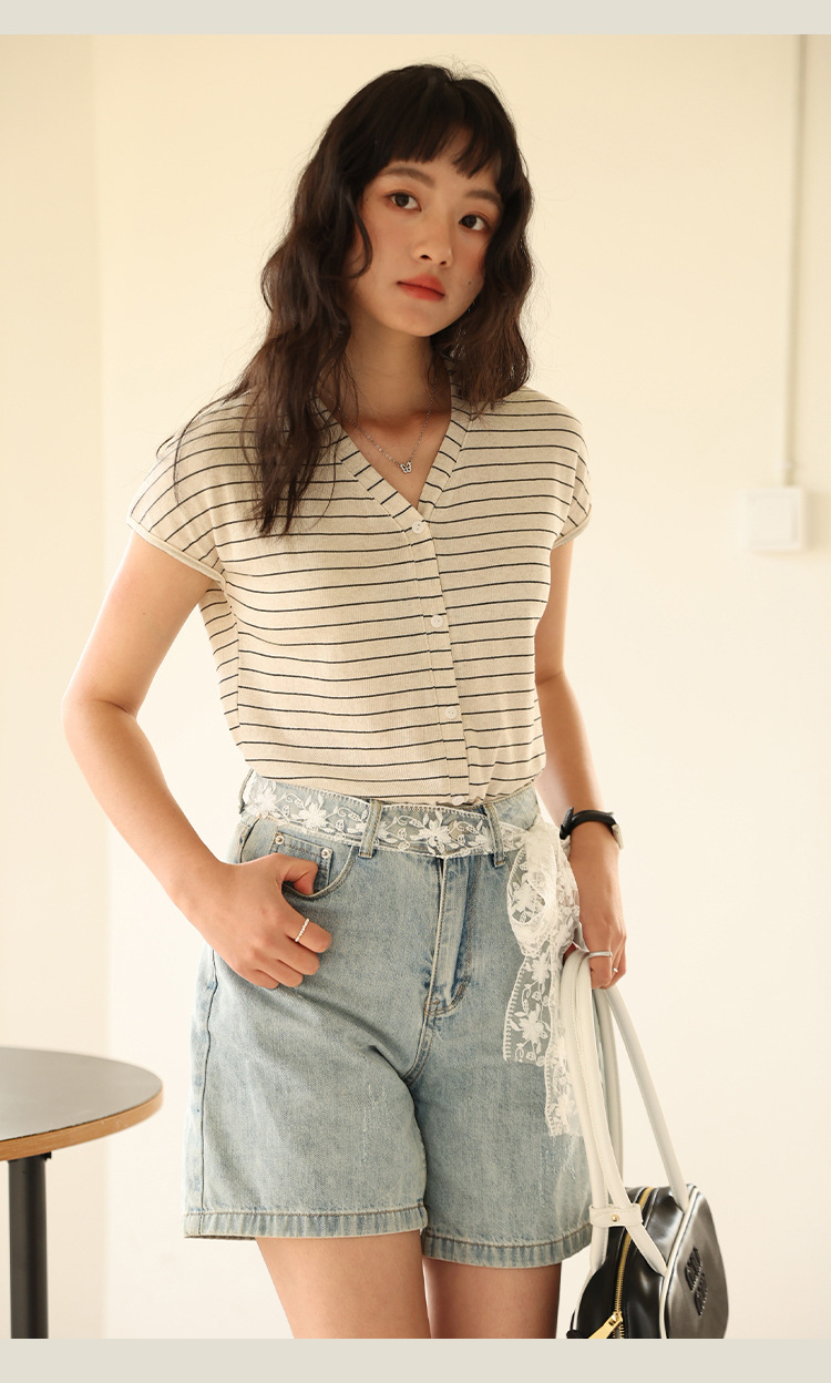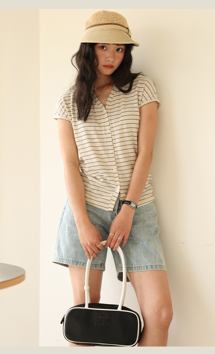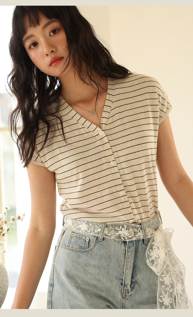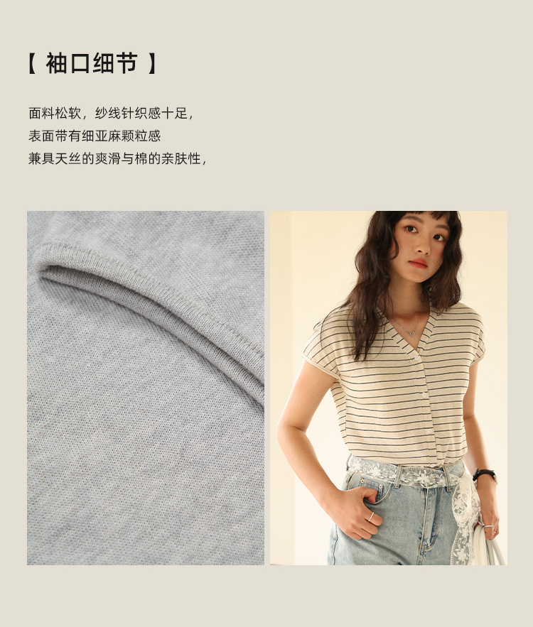 봄과 여름 텐셀 라이오셀베이스 셔츠 여자 2025 새로운 V 넥 리넨 티셔츠 피부 친화적 인 버튼 카디건 반소매 탑스토어 가기
