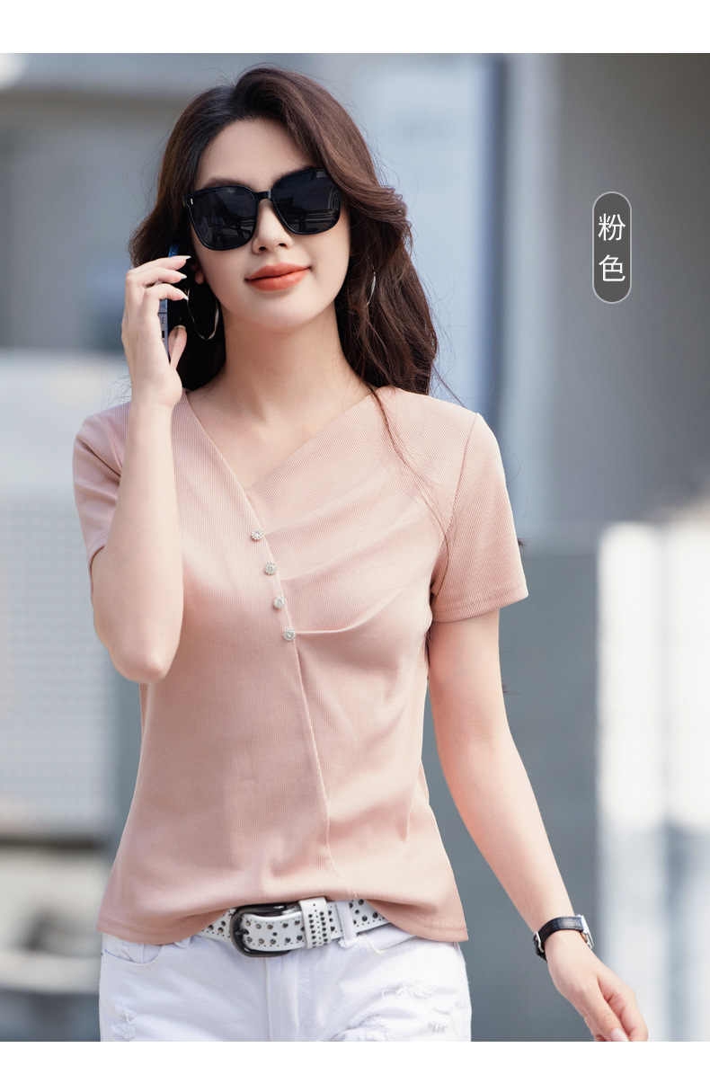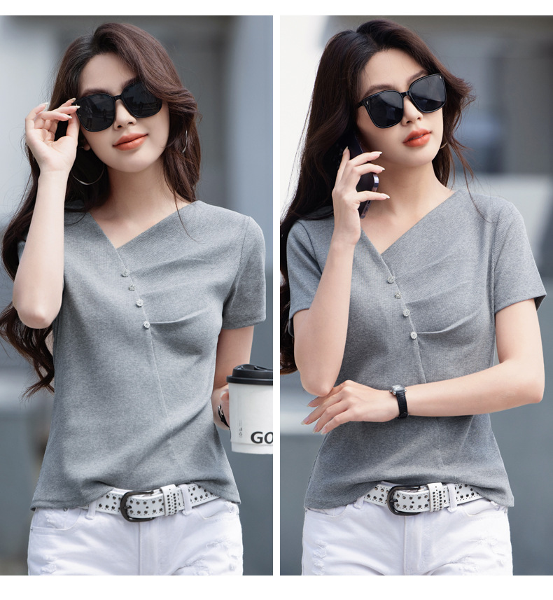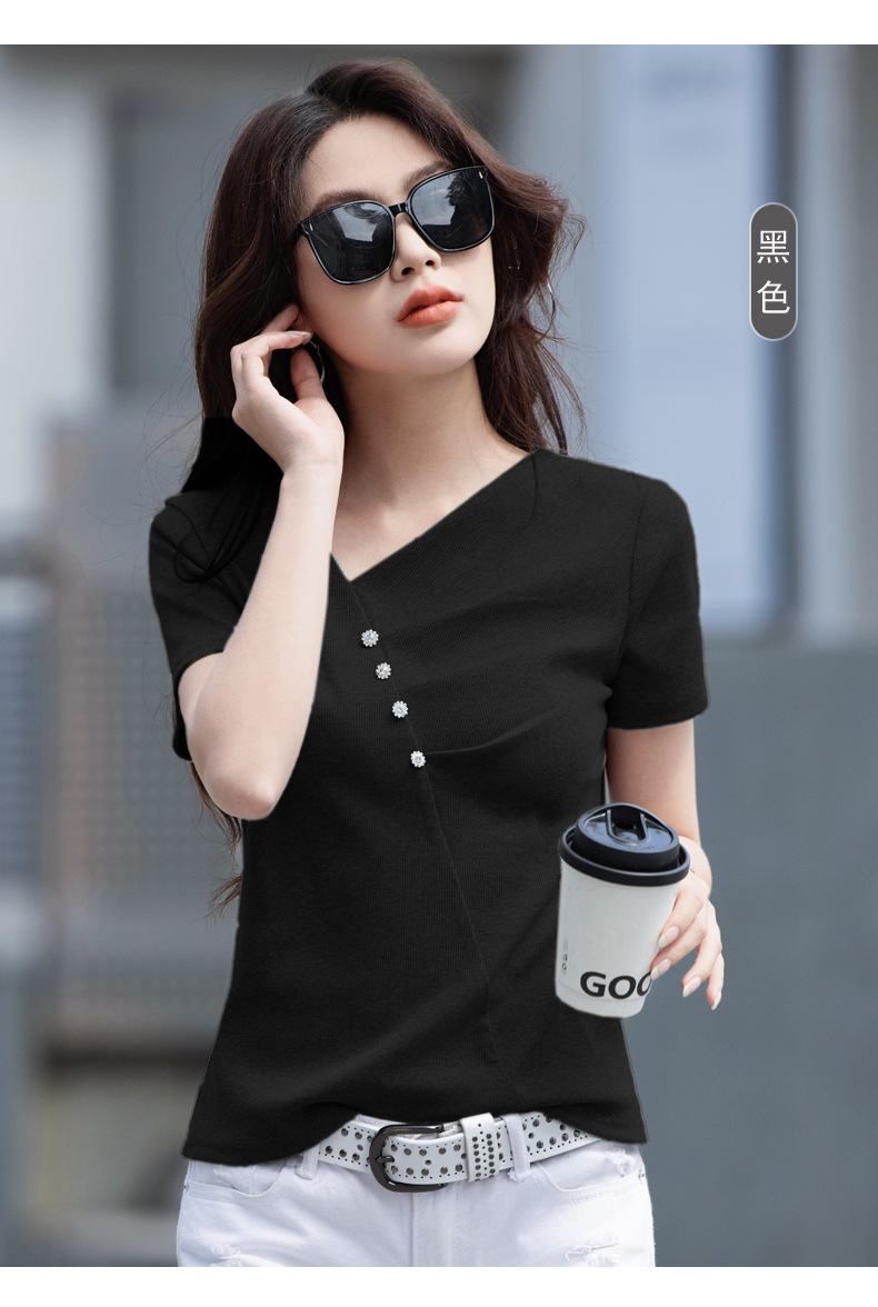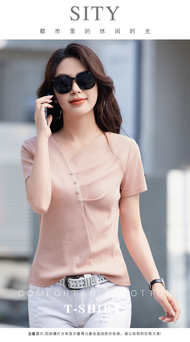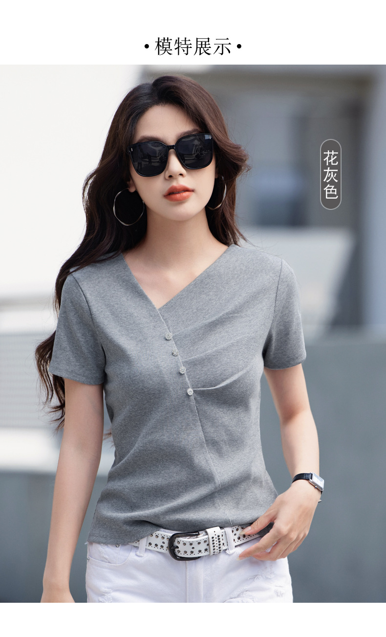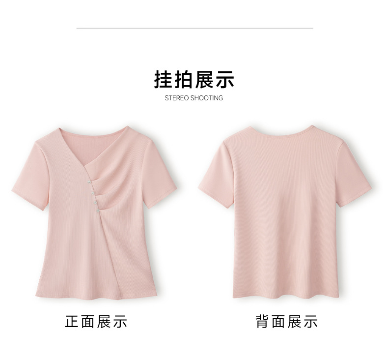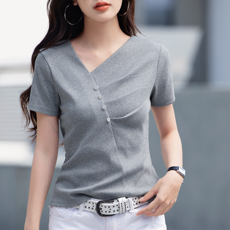 서양식 불규칙한 디자인 반팔 티셔츠 여성 여름 2025 새로운 V 넥 허리 작은 셔츠 유행 슬리밍 탑스토어 가기