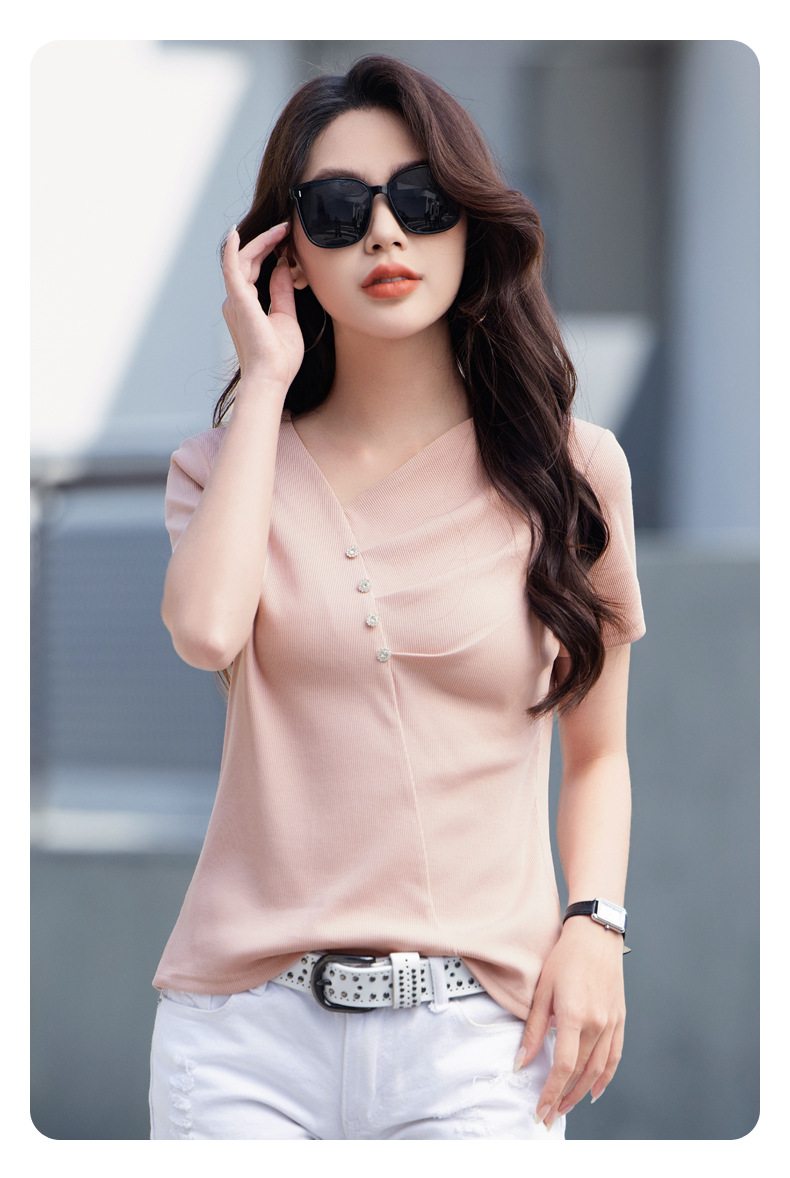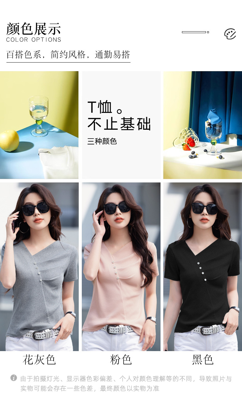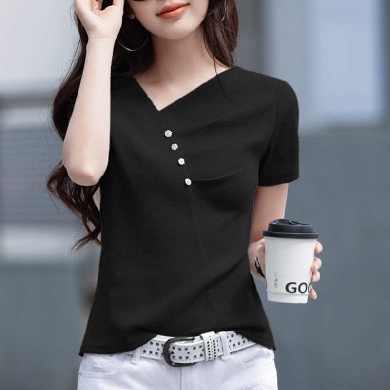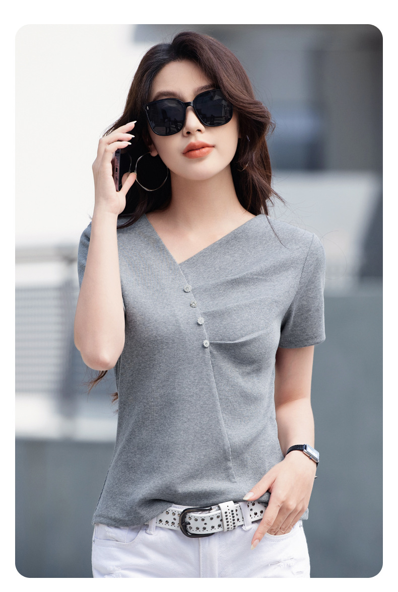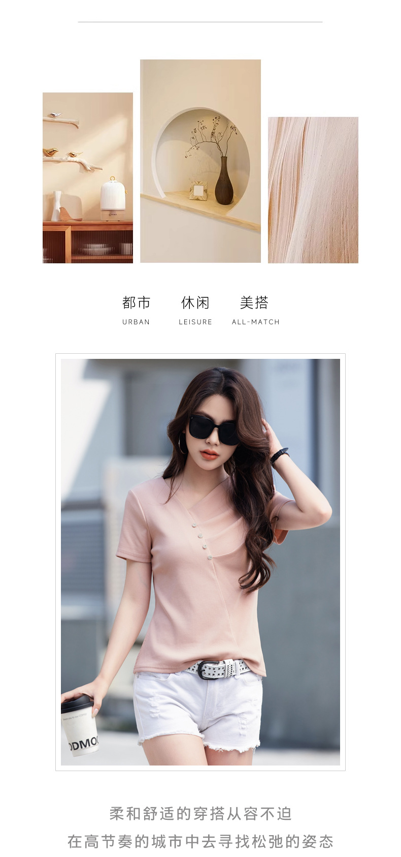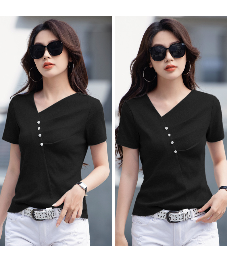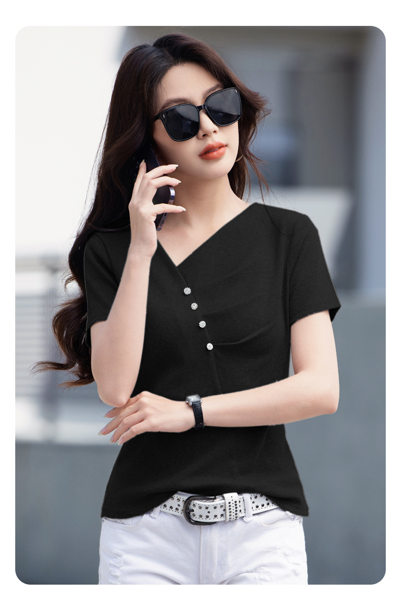 서양식 불규칙한 디자인 반팔 티셔츠 여성 여름 2025 새로운 V 넥 허리 작은 셔츠 유행 슬리밍 탑스토어 가기