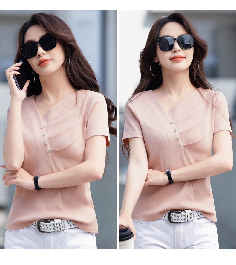 서양식 불규칙한 디자인 반팔 티셔츠 여성 여름 2025 새로운 V 넥 허리 작은 셔츠 유행 슬리밍 탑