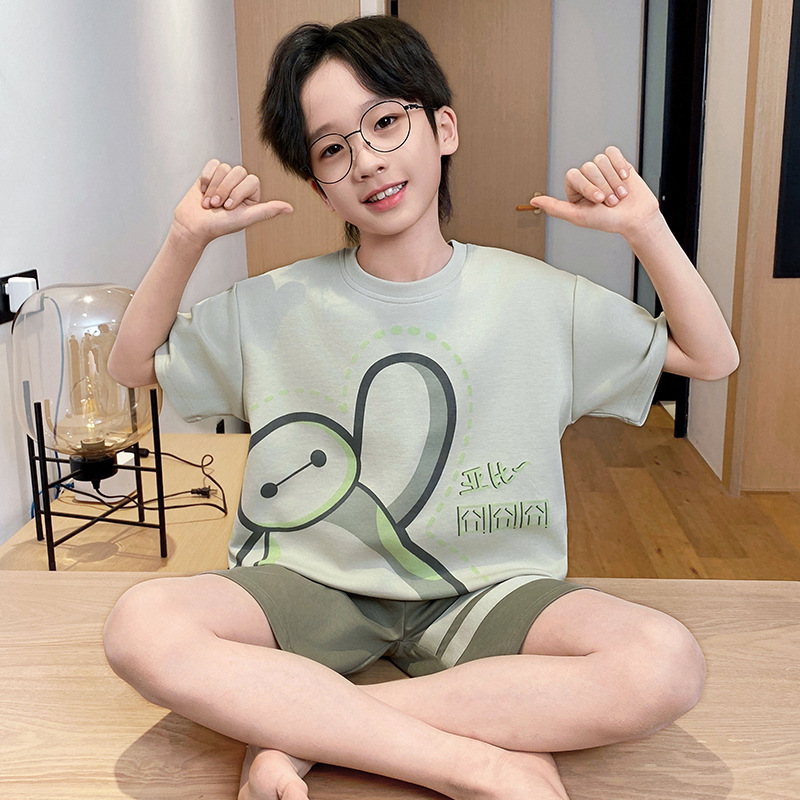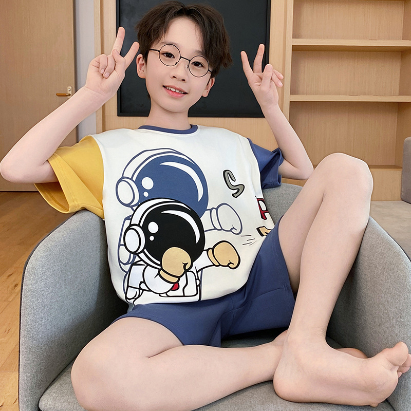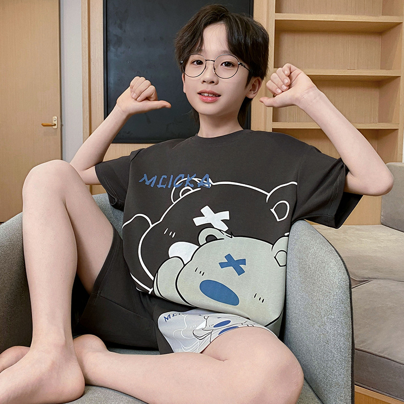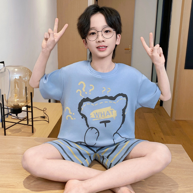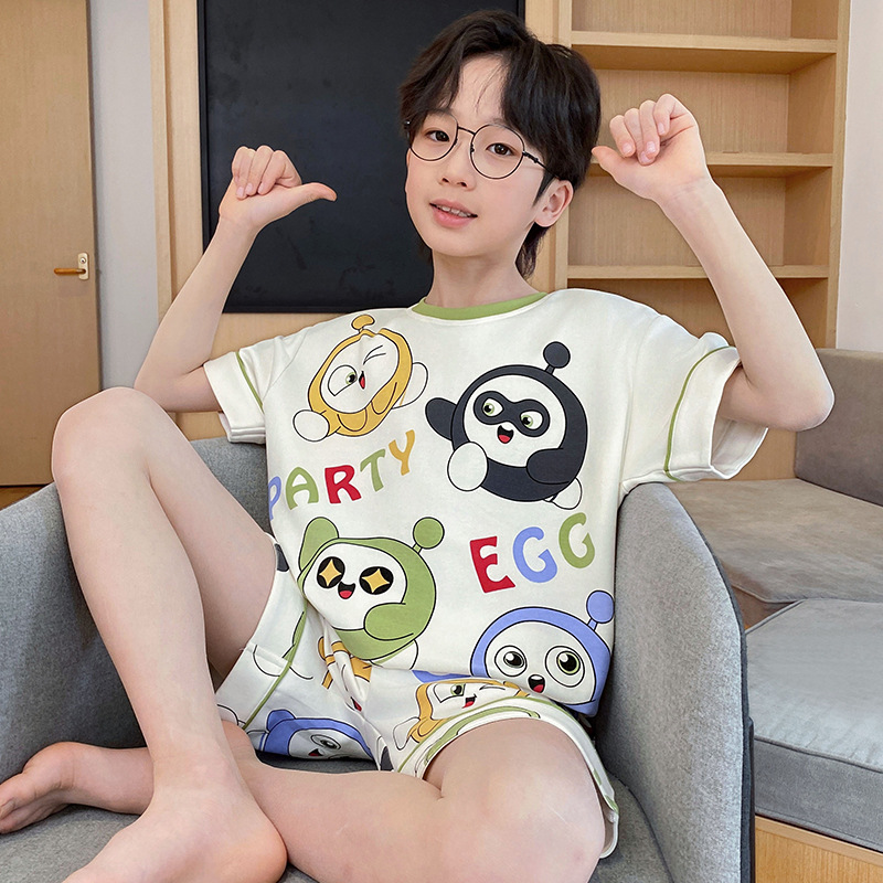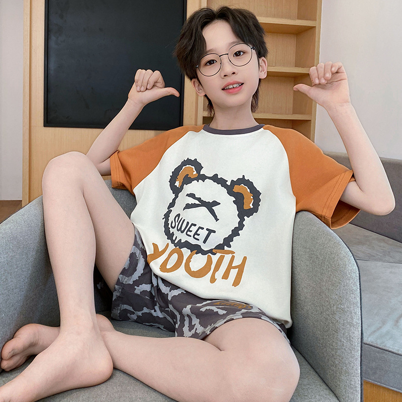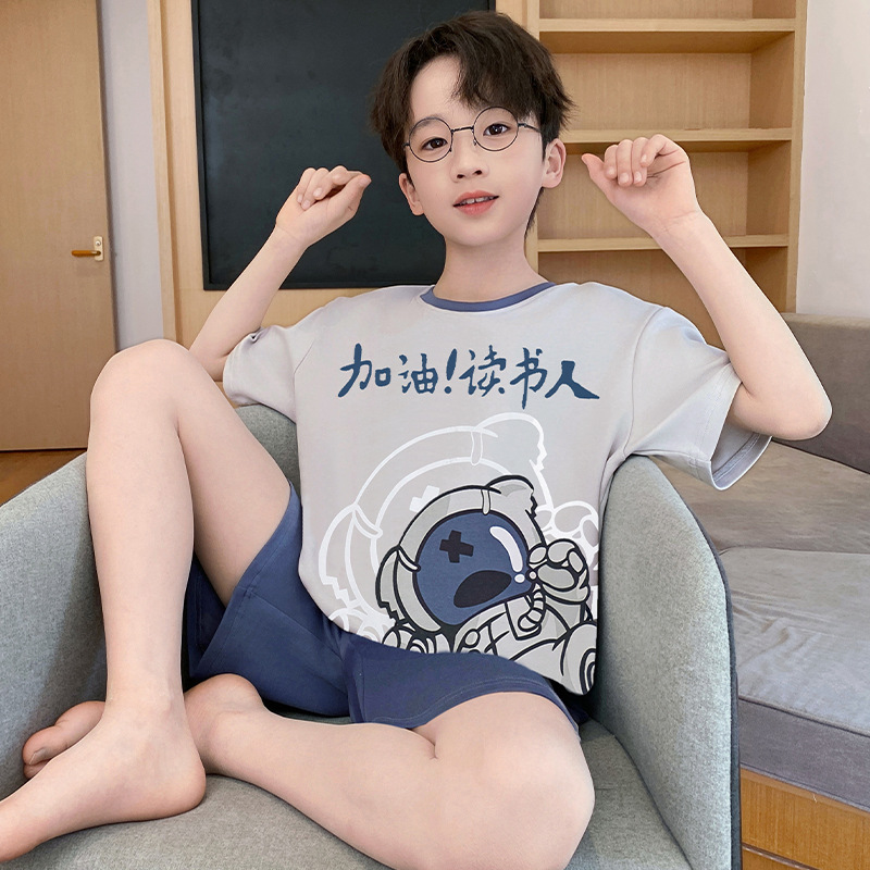 2025 새로운 소년 잠옷 어린이 순수 코튼 여름 얇은 반팔 소년 청소년 큰 어린이 가정 의류 세트